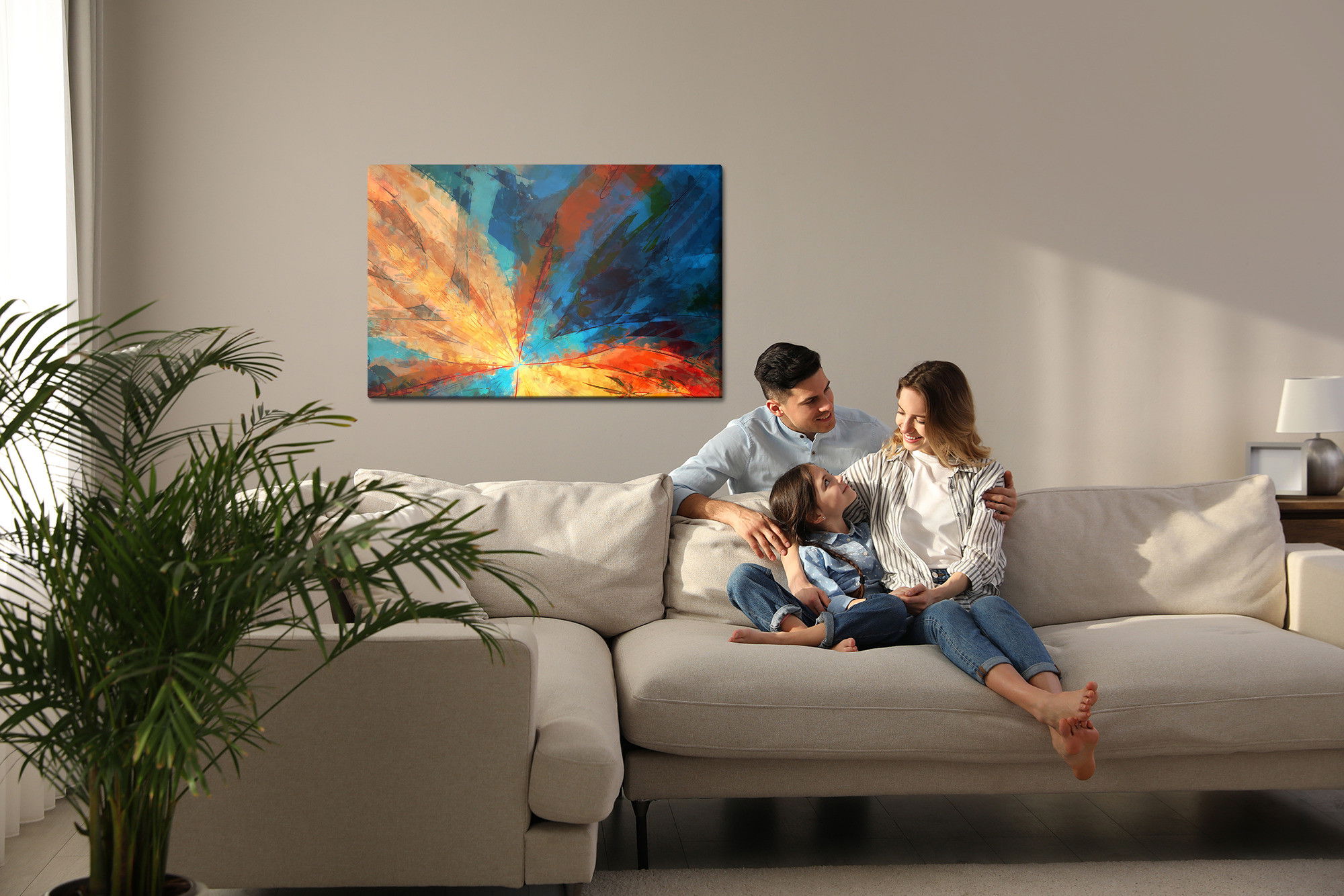 Varje tavla monteras på en massiv fururam. Format upp till 70×50 cm har en ram på 15 mm, medan format från 90×60 cm och uppåt har en ram på 20 mm. Den exakta dukspänningen gör att tavlan håller sin form över tid. Motivet Abstract color variation trycks runt hela ramen vilket ger ett stilrent galleriuttryck där tavlan är lika vacker från sidan som framifrån. Kombinationen av rak dukspänning, rena linjer och korrekt tryck ger en professionell finish.