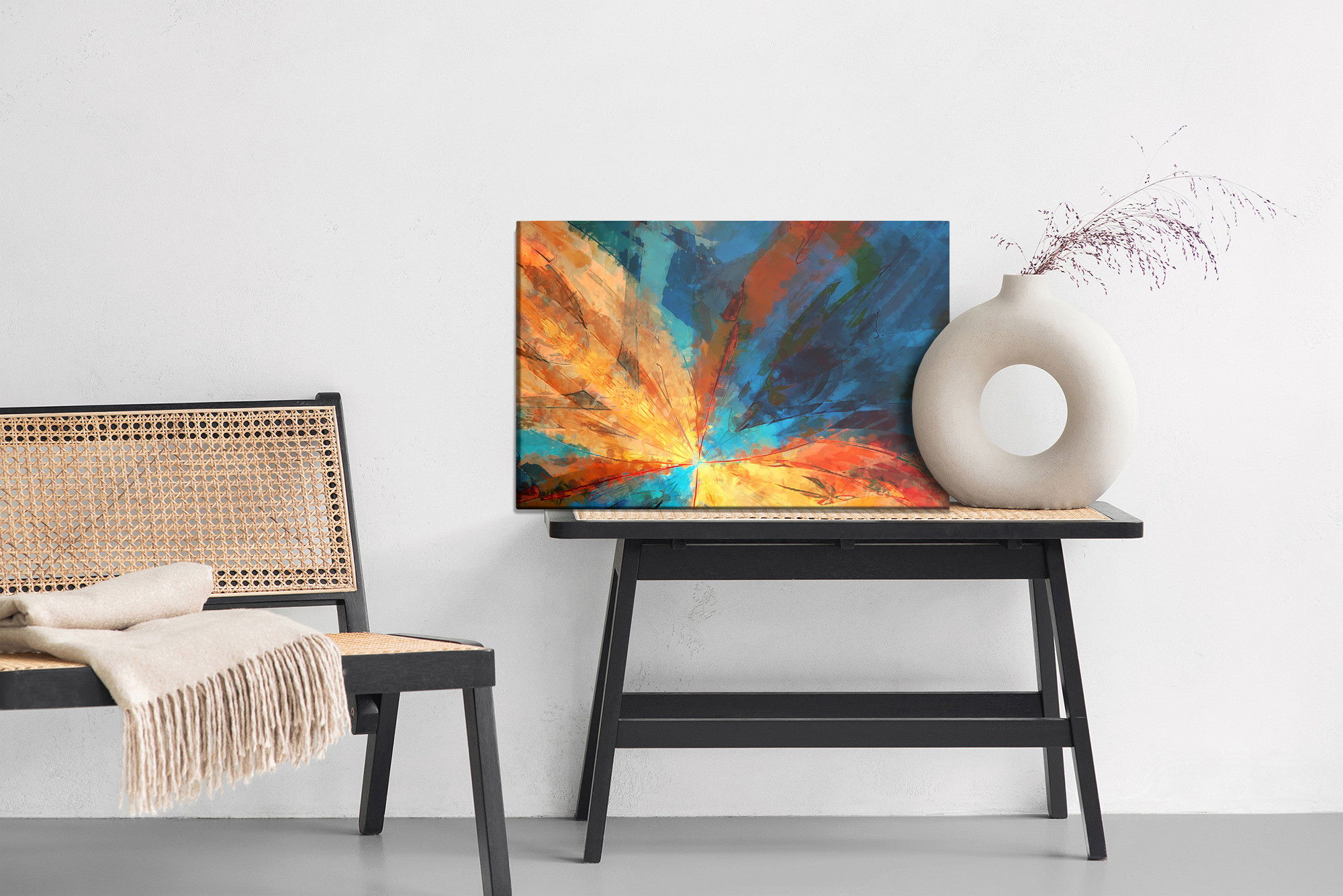 SilentDirects ljuddämpande tavla Abstract color variation kombinerar ett högupplöst motiv med avancerad akustikteknik. Varje tavla monteras i Sverige och bygger på en stabil canvastavla med fururam, där insidan av ramen fylls med en ljudabsorberande kärna av återvunnen polyester. Konstruktionen gör tavlan till ett både estetiskt och funktionellt inslag i rummet.