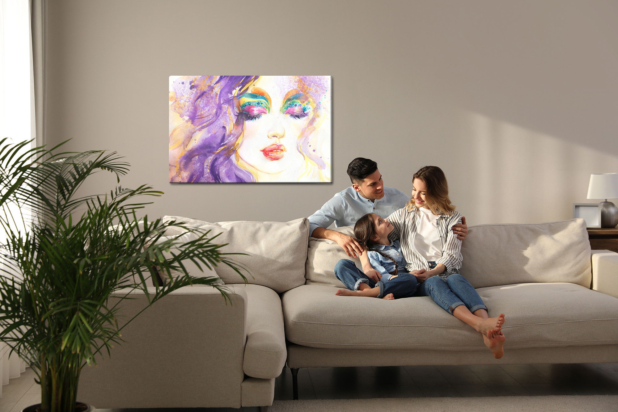 Varje tavla monteras på en massiv fururam. Format upp till 70×50 cm har en ram på 15 mm, medan format från 90×60 cm och uppåt har en ram på 20 mm. Den exakta dukspänningen gör att tavlan håller sin form över tid. Motivet Abstract female portrait trycks runt hela ramen vilket ger ett stilrent galleriuttryck där tavlan är lika vacker från sidan som framifrån. Kombinationen av rak dukspänning, rena linjer och korrekt tryck ger en professionell finish.