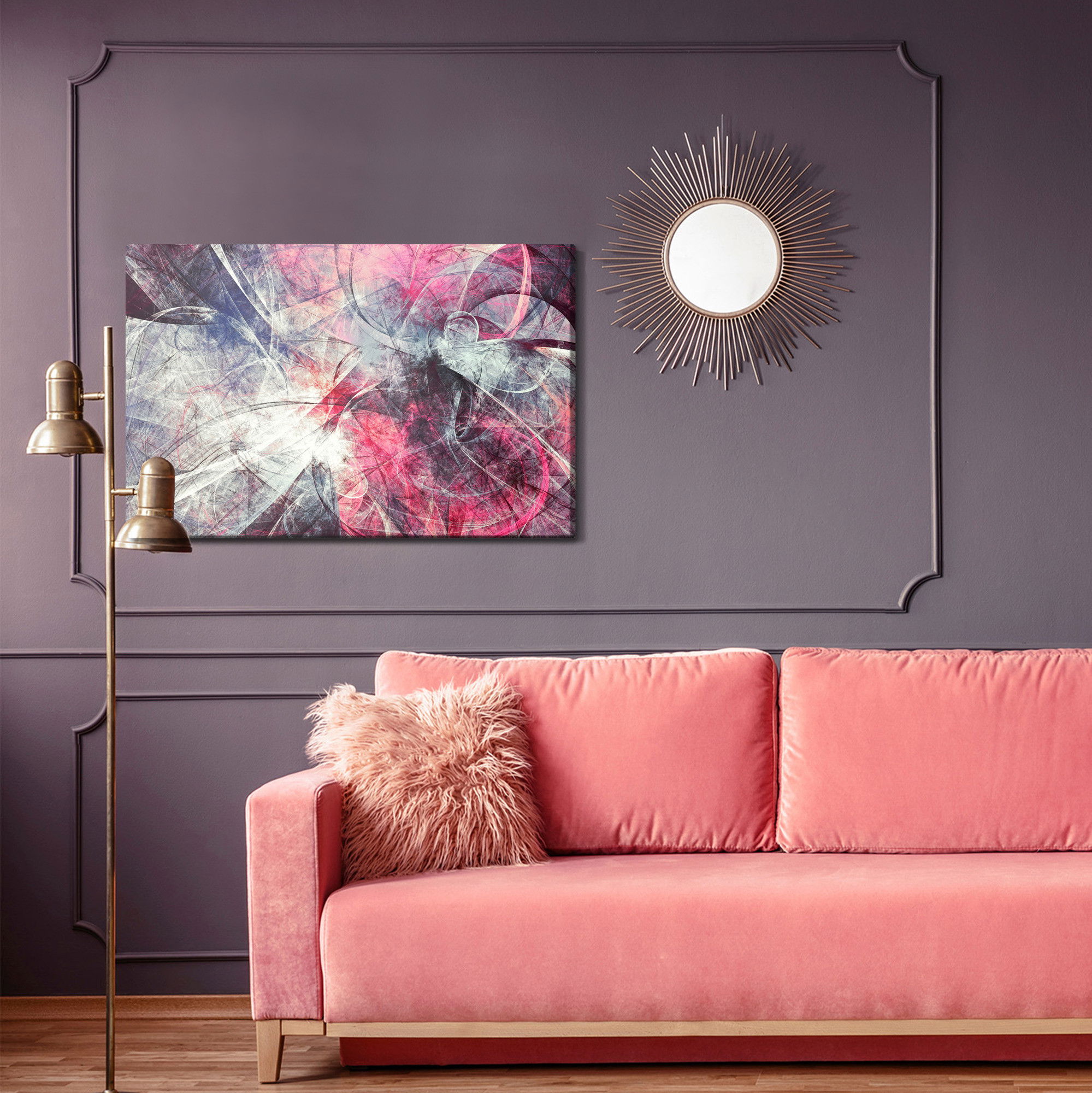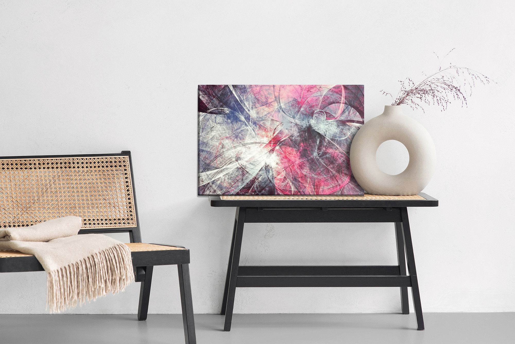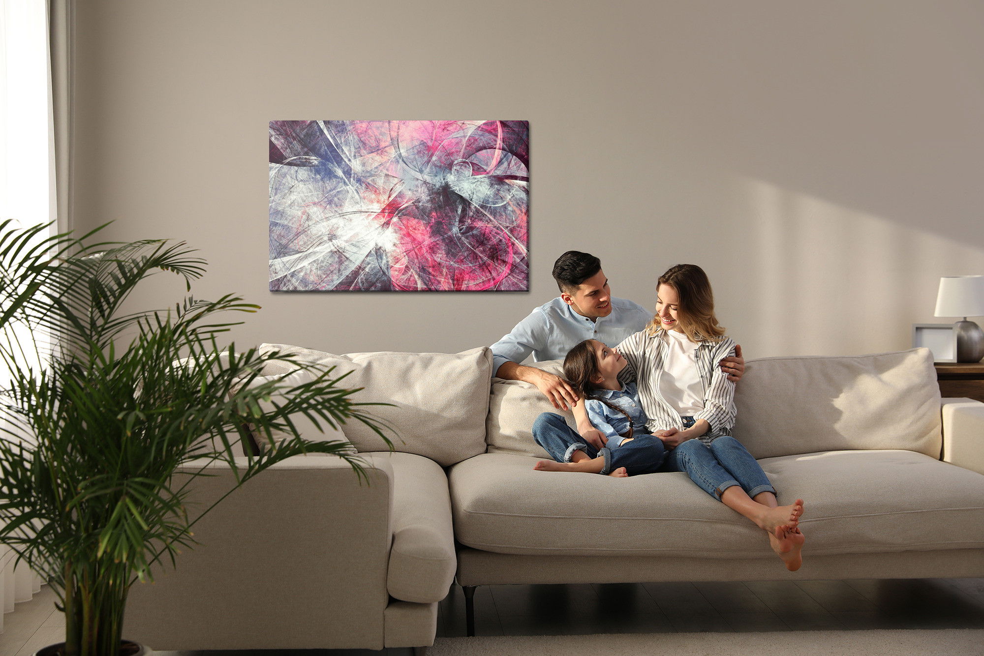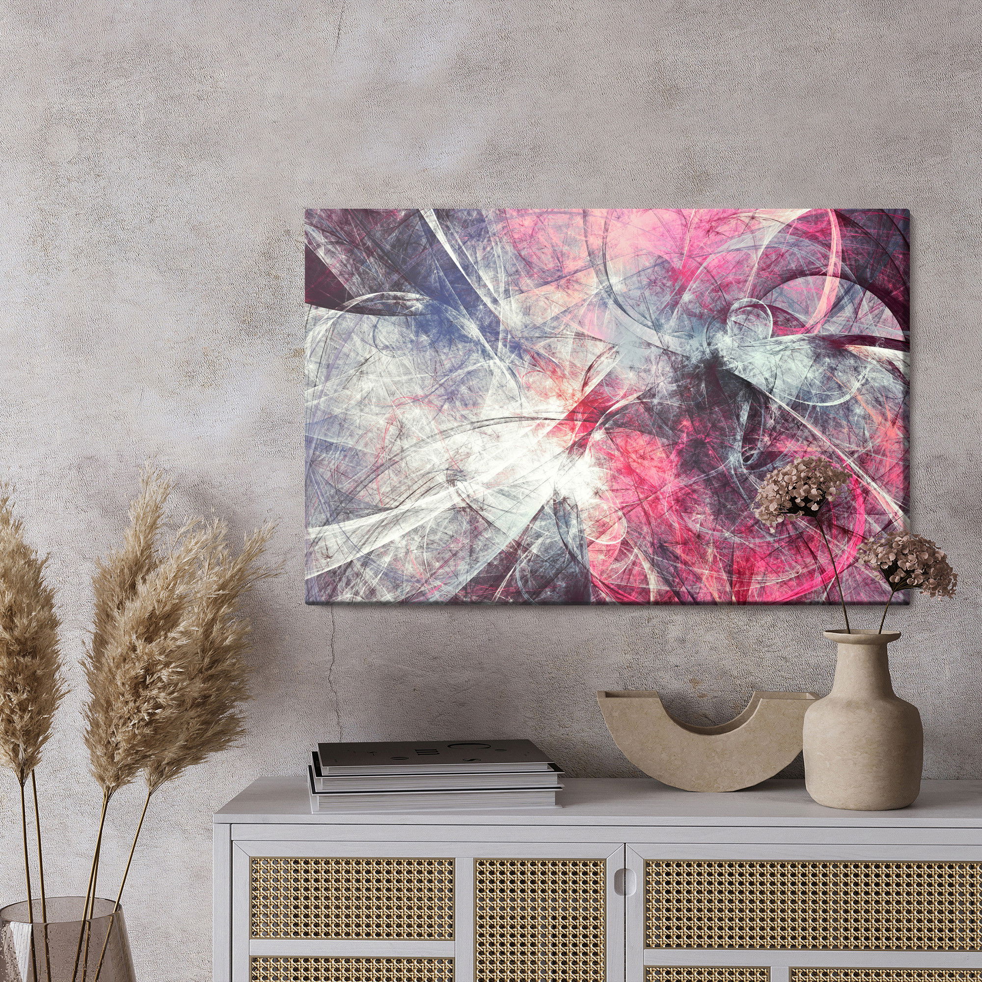 Varje tavla monteras på en massiv fururam. Format upp till 70×50 cm har en ram på 15 mm, medan format från 90×60 cm och uppåt har en ram på 20 mm. Den exakta dukspänningen gör att tavlan håller sin form över tid. Motivet Abstract movement trycks runt hela ramen vilket ger ett stilrent galleriuttryck där tavlan är lika vacker från sidan som framifrån. Kombinationen av rak dukspänning, rena linjer och korrekt tryck ger en professionell finish.