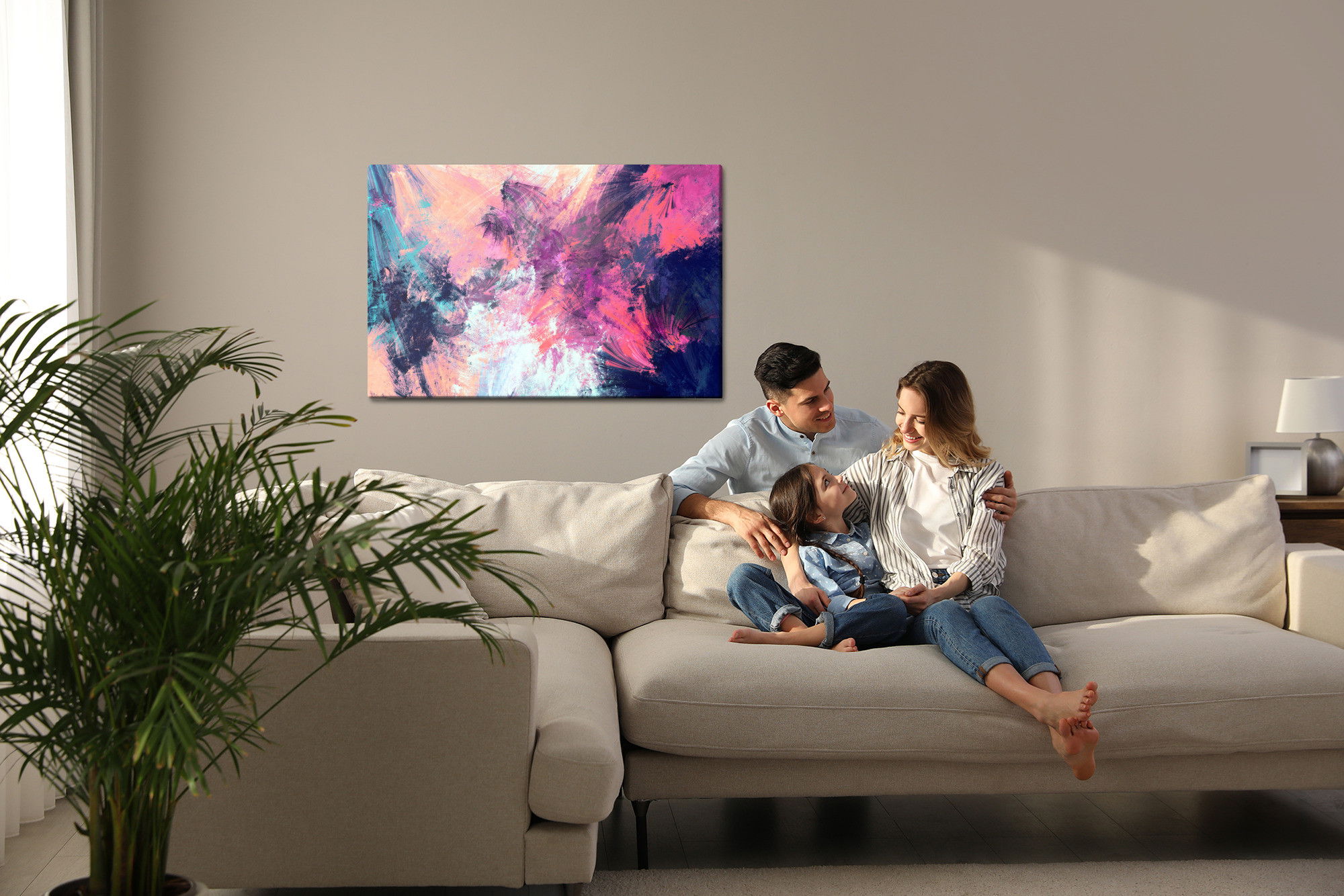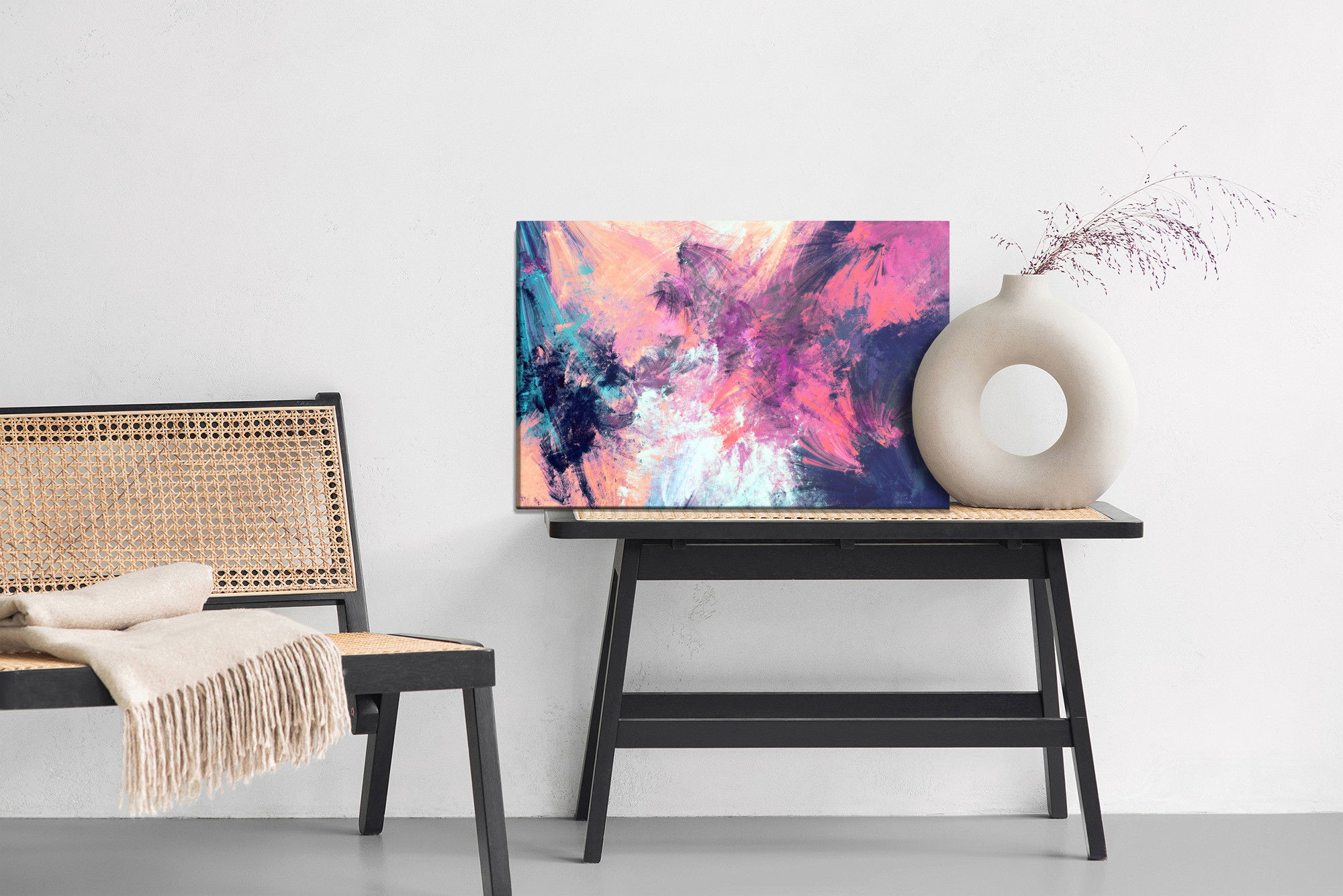 Varje tavla monteras på en massiv fururam. Format upp till 70×50 cm har en ram på 15 mm, medan format från 90×60 cm och uppåt har en ram på 20 mm. Den exakta dukspänningen gör att tavlan håller sin form över tid. Motivet Abstract paint trycks runt hela ramen vilket ger ett stilrent galleriuttryck där tavlan är lika vacker från sidan som framifrån. Kombinationen av rak dukspänning, rena linjer och korrekt tryck ger en professionell finish.