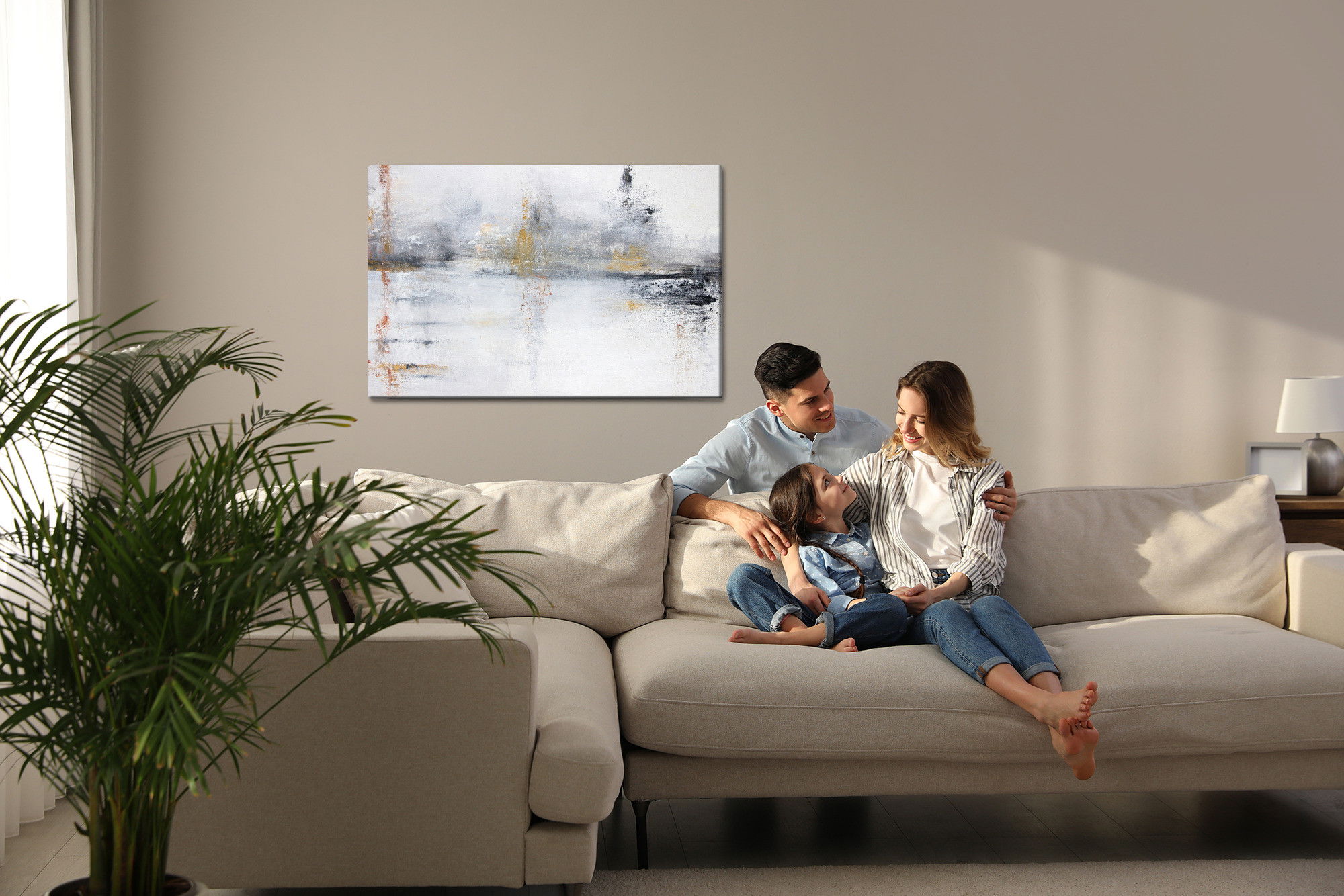 Varje tavla monteras på en massiv fururam. Format upp till 70×50 cm har en ram på 15 mm, medan format från 90×60 cm och uppåt har en ram på 20 mm. Den exakta dukspänningen gör att tavlan håller sin form över tid. Motivet Abstract print trycks runt hela ramen vilket ger ett stilrent galleriuttryck där tavlan är lika vacker från sidan som framifrån. Kombinationen av rak dukspänning, rena linjer och korrekt tryck ger en professionell finish.