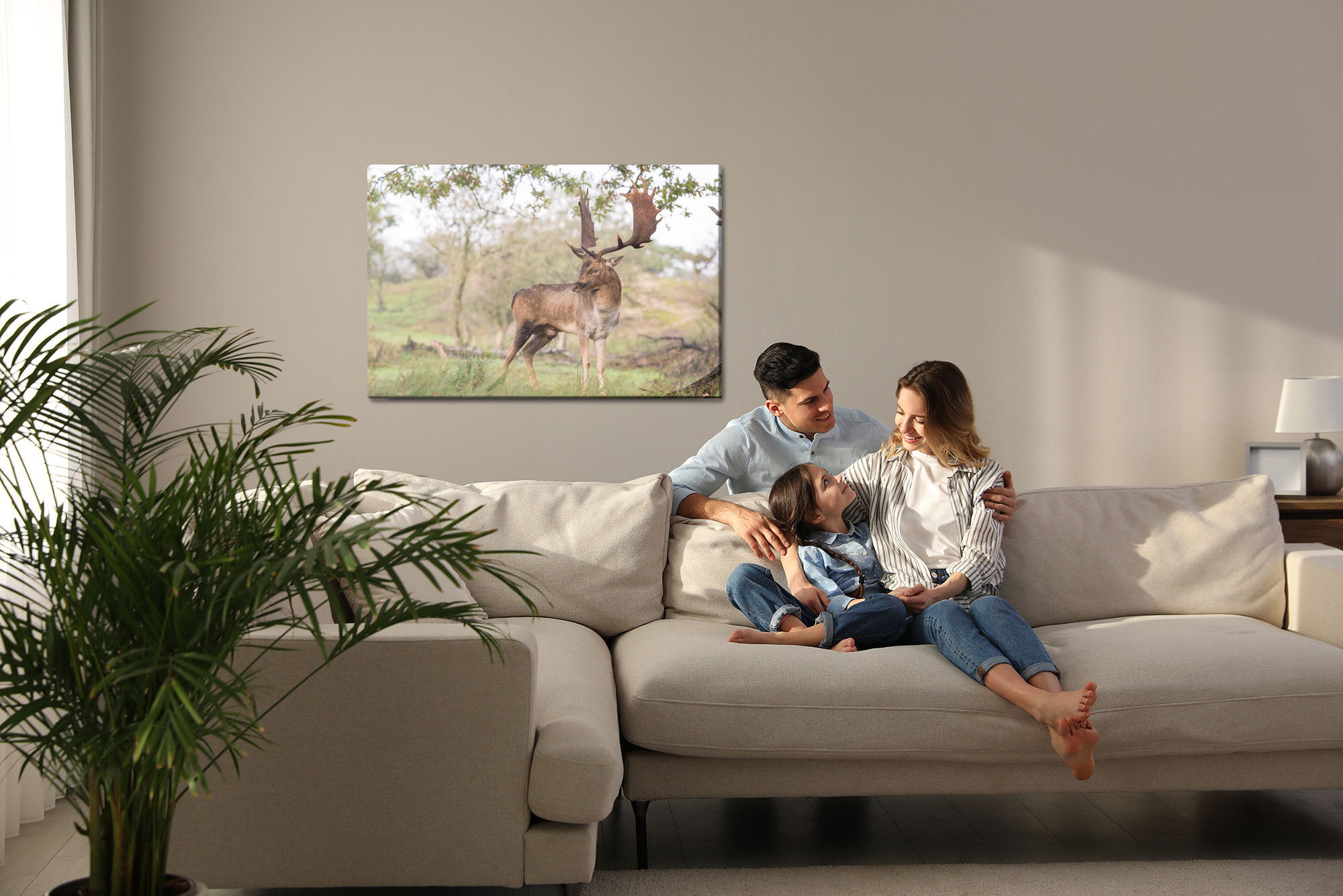 Varje tavla monteras på en massiv fururam. Format upp till 70×50 cm har en ram på 15 mm, medan format från 90×60 cm och uppåt har en ram på 20 mm. Den exakta dukspänningen gör att tavlan håller sin form över tid. Motivet Adult deer with magnificent trycks runt hela ramen vilket ger ett stilrent galleriuttryck där tavlan är lika vacker från sidan som framifrån. Kombinationen av rak dukspänning, rena linjer och korrekt tryck ger en professionell finish.