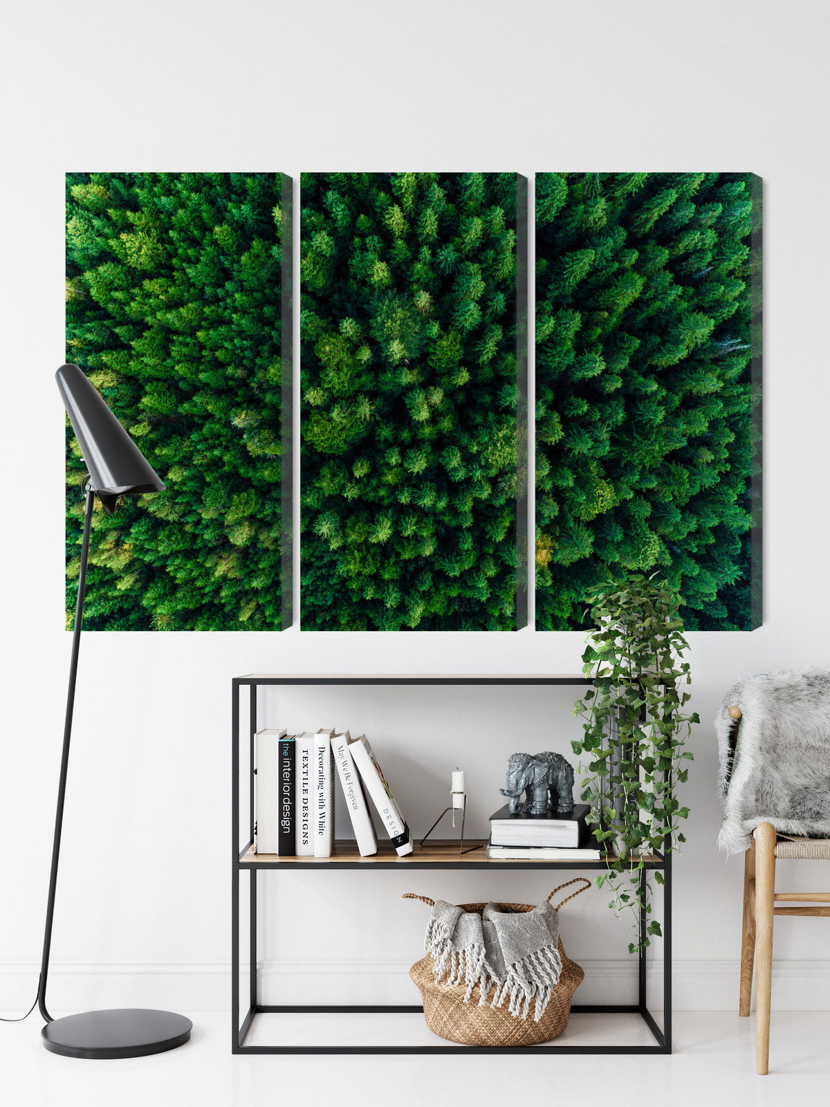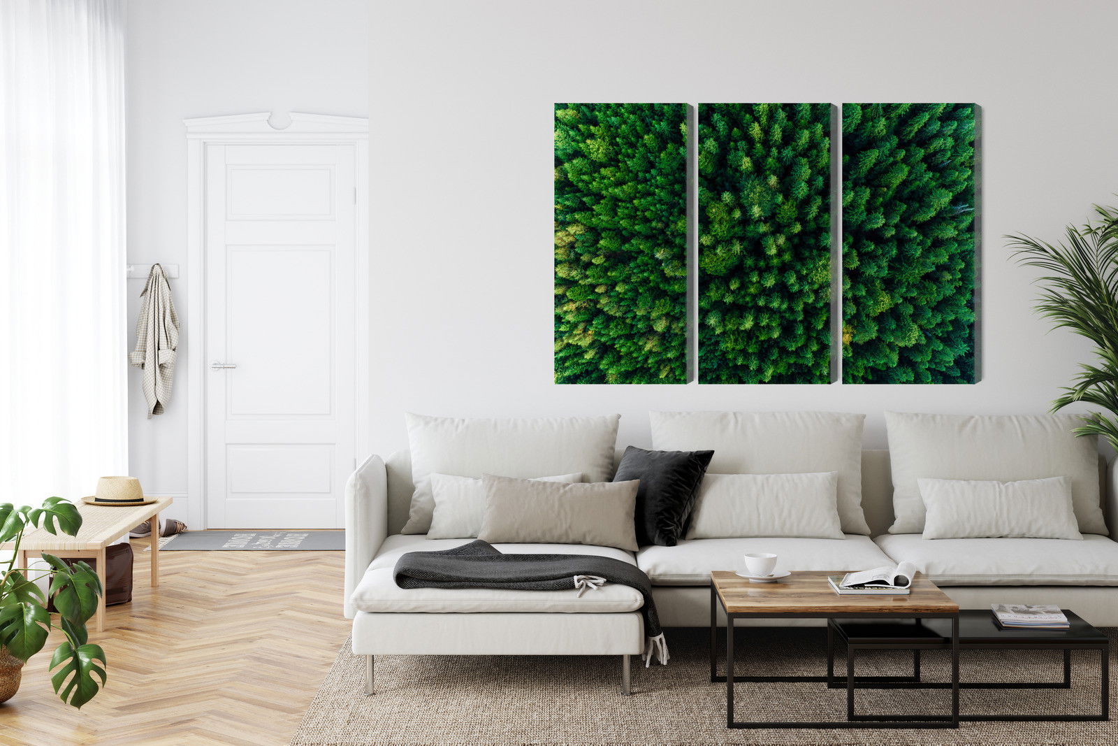 Varje tavla monteras på en massiv fururam. Format upp till 70×50 cm har en ram på 15 mm, medan format från 90×60 cm och uppåt har en ram på 20 mm. Den exakta dukspänningen gör att tavlan håller sin form över tid. Motivet Aerial view of the green trycks runt hela ramen vilket ger ett stilrent galleriuttryck där tavlan är lika vacker från sidan som framifrån. Kombinationen av rak dukspänning, rena linjer och korrekt tryck ger en professionell finish.