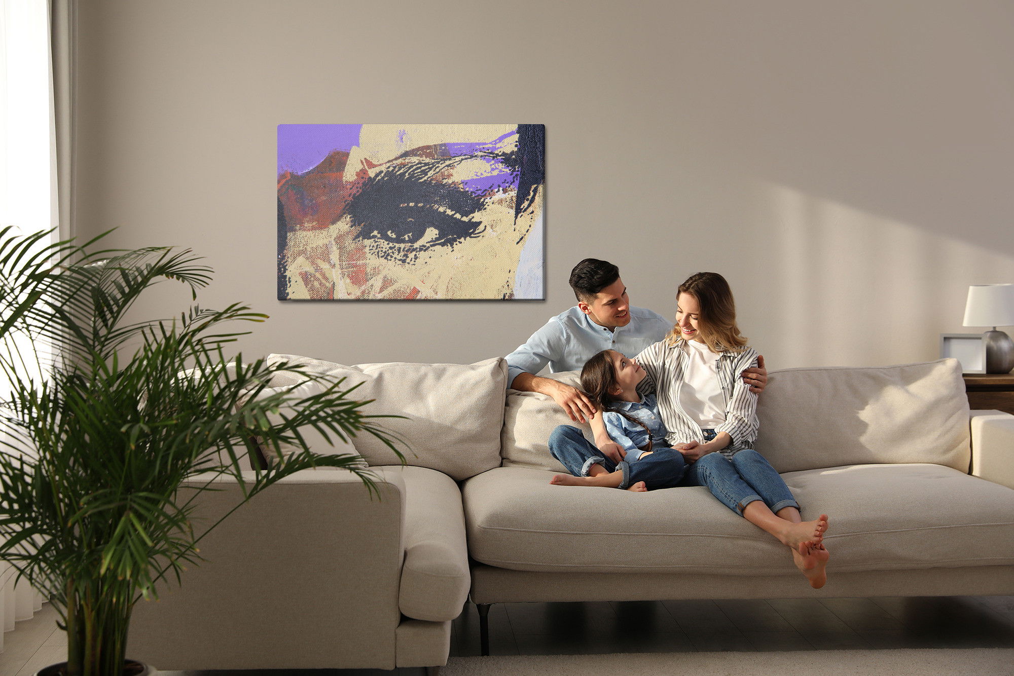 Varje tavla monteras på en massiv fururam. Format upp till 70×50 cm har en ram på 15 mm, medan format från 90×60 cm och uppåt har en ram på 20 mm. Den exakta dukspänningen gör att tavlan håller sin form över tid. Motivet An abstract painting trycks runt hela ramen vilket ger ett stilrent galleriuttryck där tavlan är lika vacker från sidan som framifrån. Kombinationen av rak dukspänning, rena linjer och korrekt tryck ger en professionell finish.