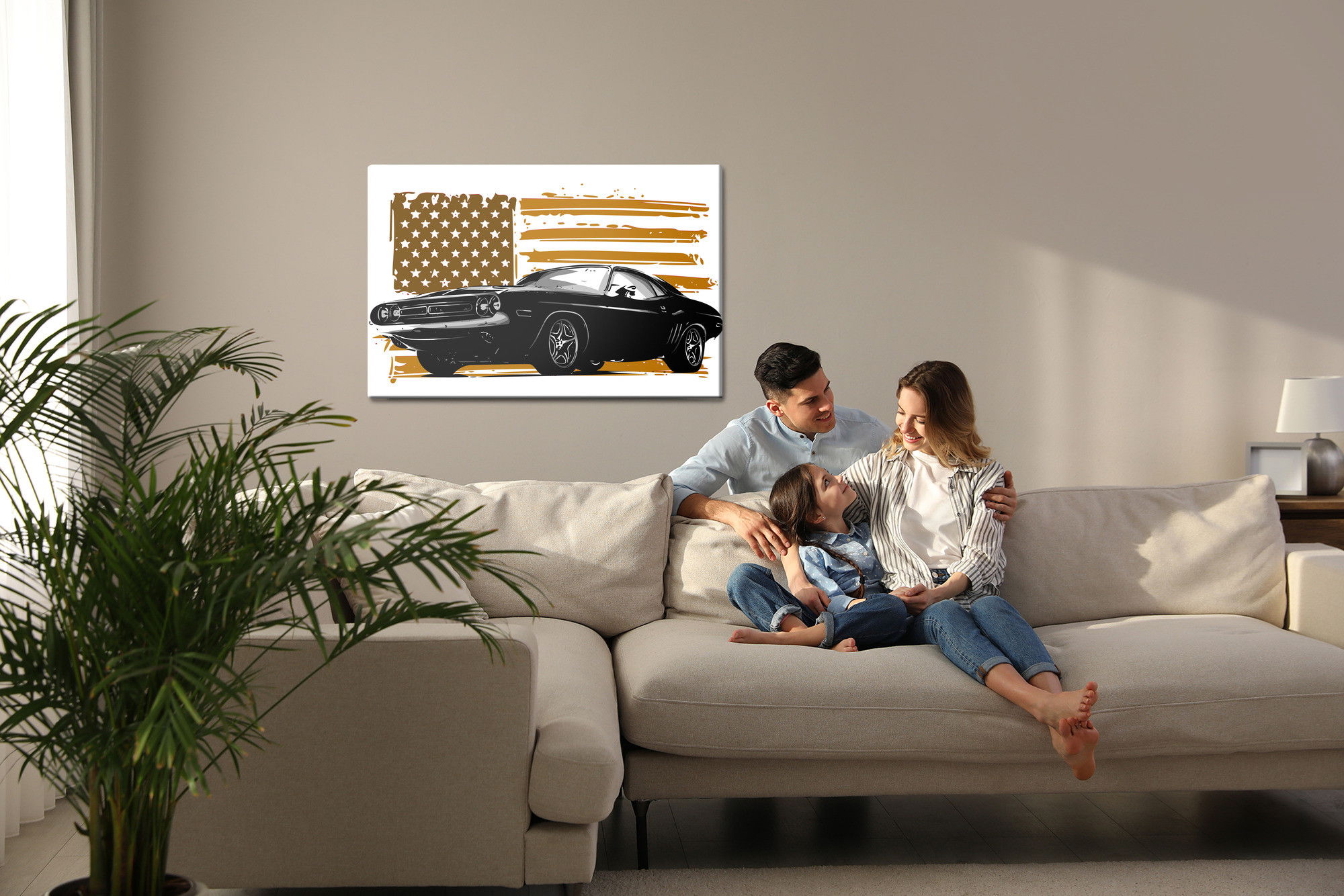 Motivet An american muscle car återges med hög färgprecision och detaljrikedom tack vare HP Latex-teknologi. Trycket sker med vattenbaserade, luktfria och GREENGUARD Gold-certifierade bläck som ger en upplösning på upp till 300 DPI. Färgerna är UV-beständiga och behåller sin styrka även i ljusa rum, vilket gör tavlan lämplig för både hem- och offentliga miljöer.