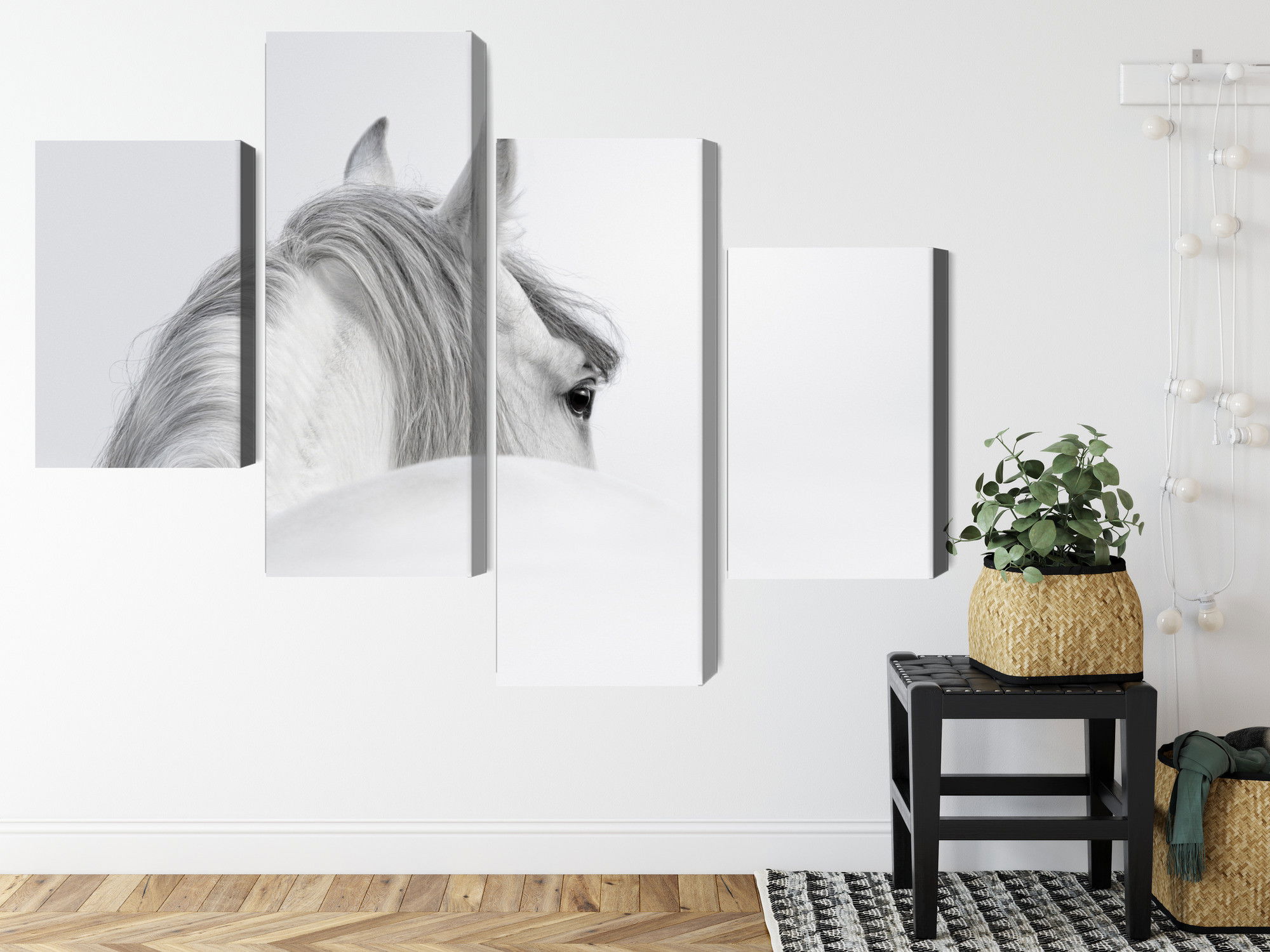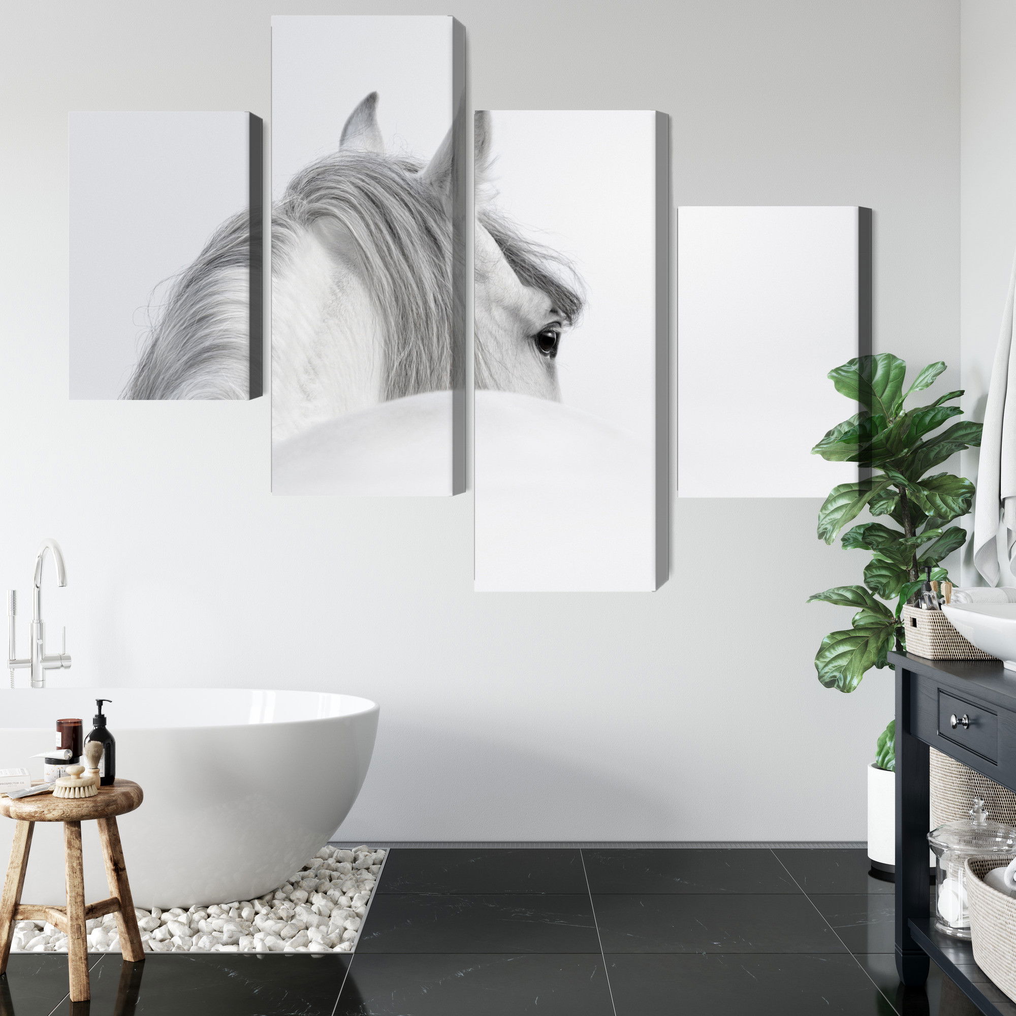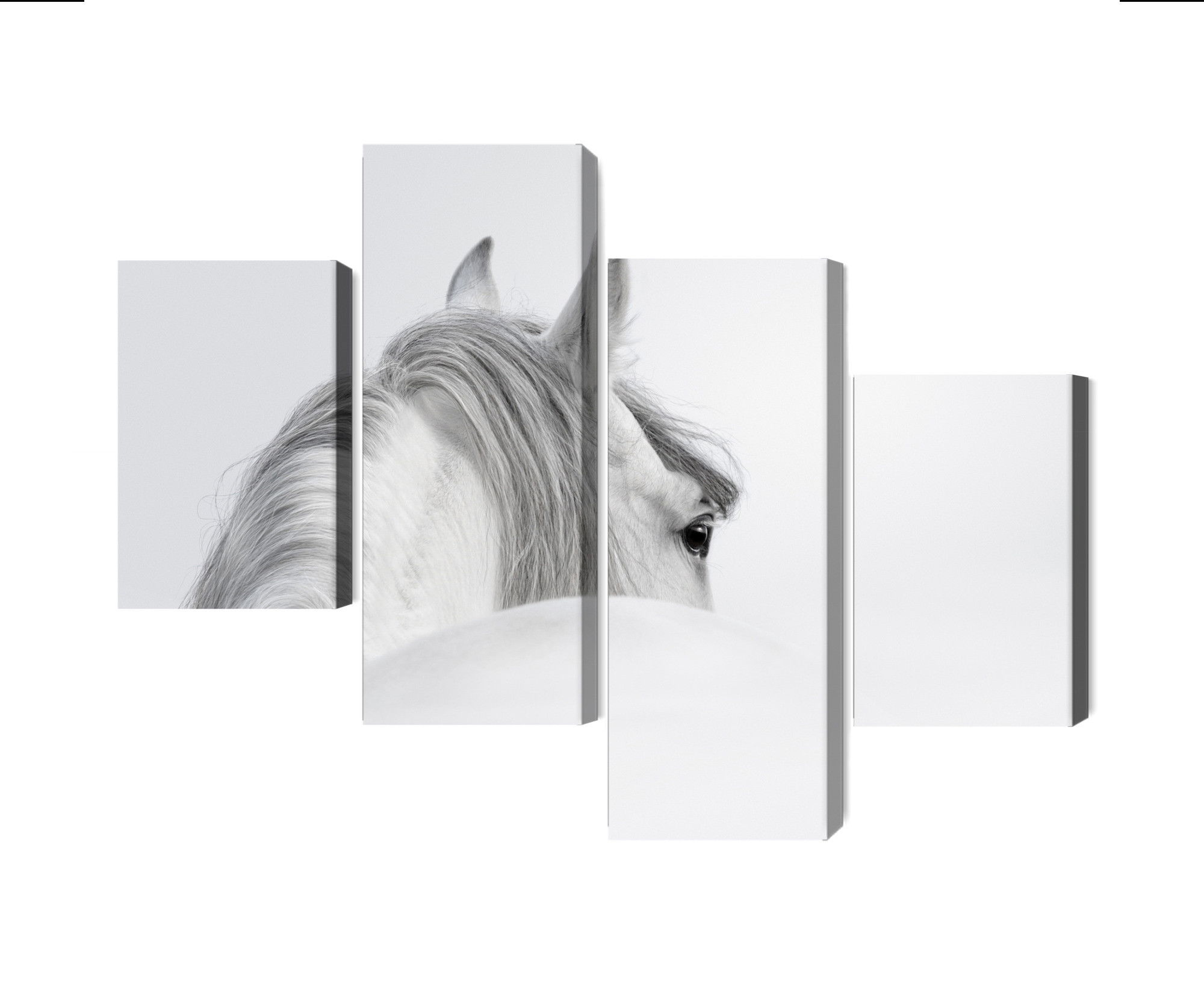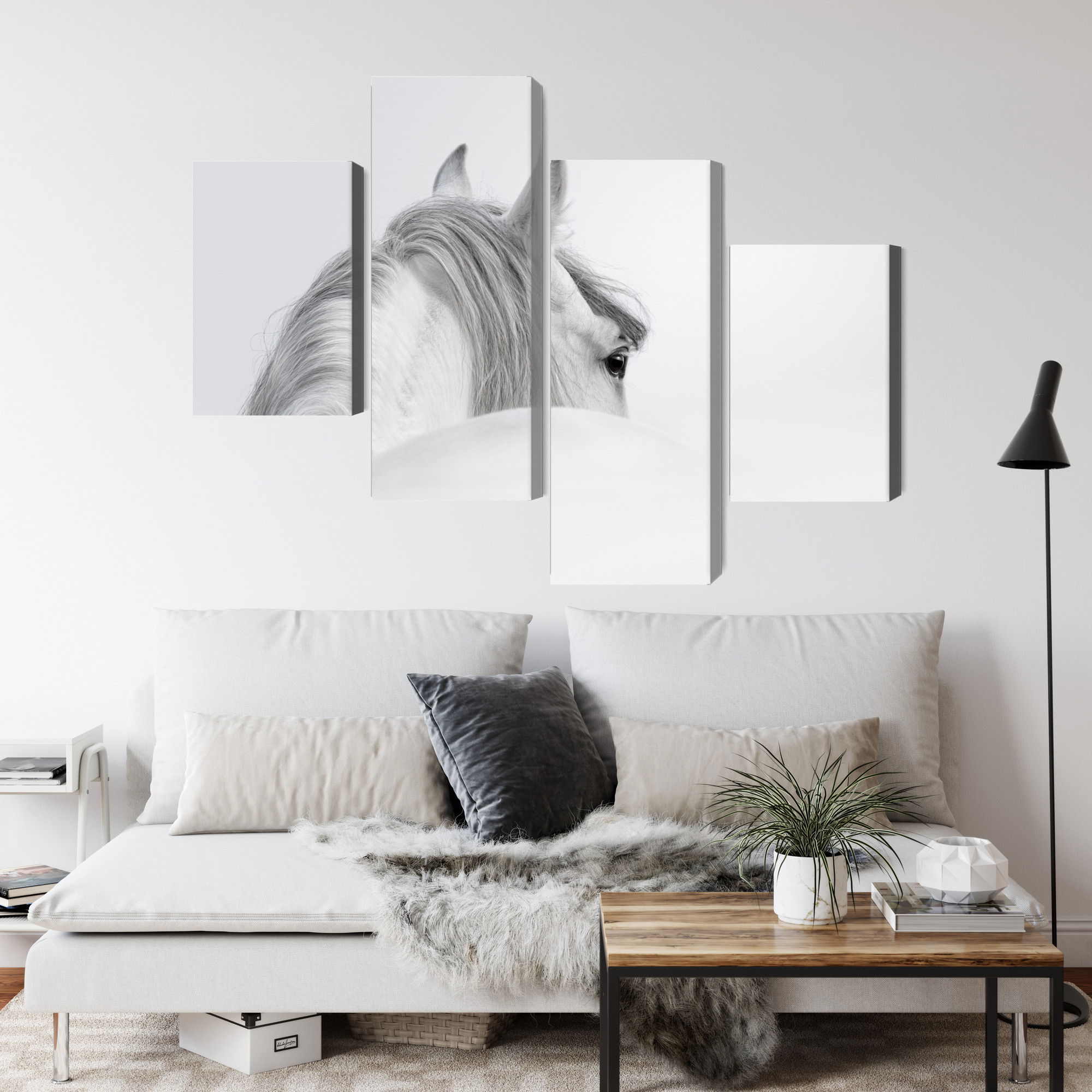 Varje tavla monteras på en massiv fururam. Format upp till 70×50 cm har en ram på 15 mm, medan format från 90×60 cm och uppåt har en ram på 20 mm. Den exakta dukspänningen gör att tavlan håller sin form över tid. Motivet Andalusian horse in the fog trycks runt hela ramen vilket ger ett stilrent galleriuttryck där tavlan är lika vacker från sidan som framifrån. Kombinationen av rak dukspänning, rena linjer och korrekt tryck ger en professionell finish.