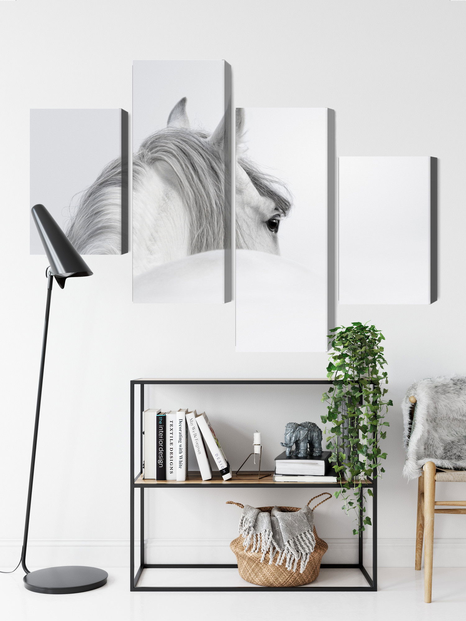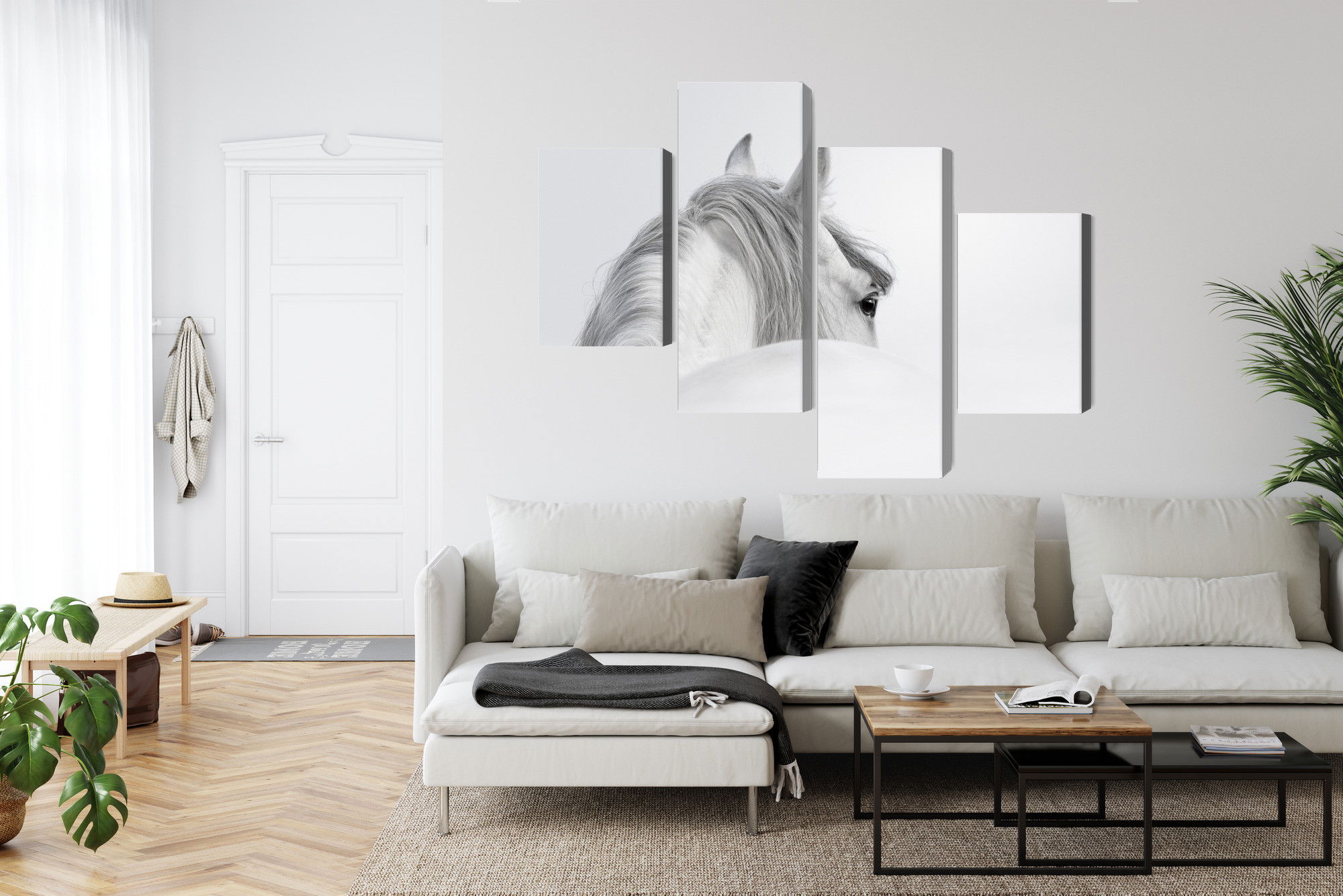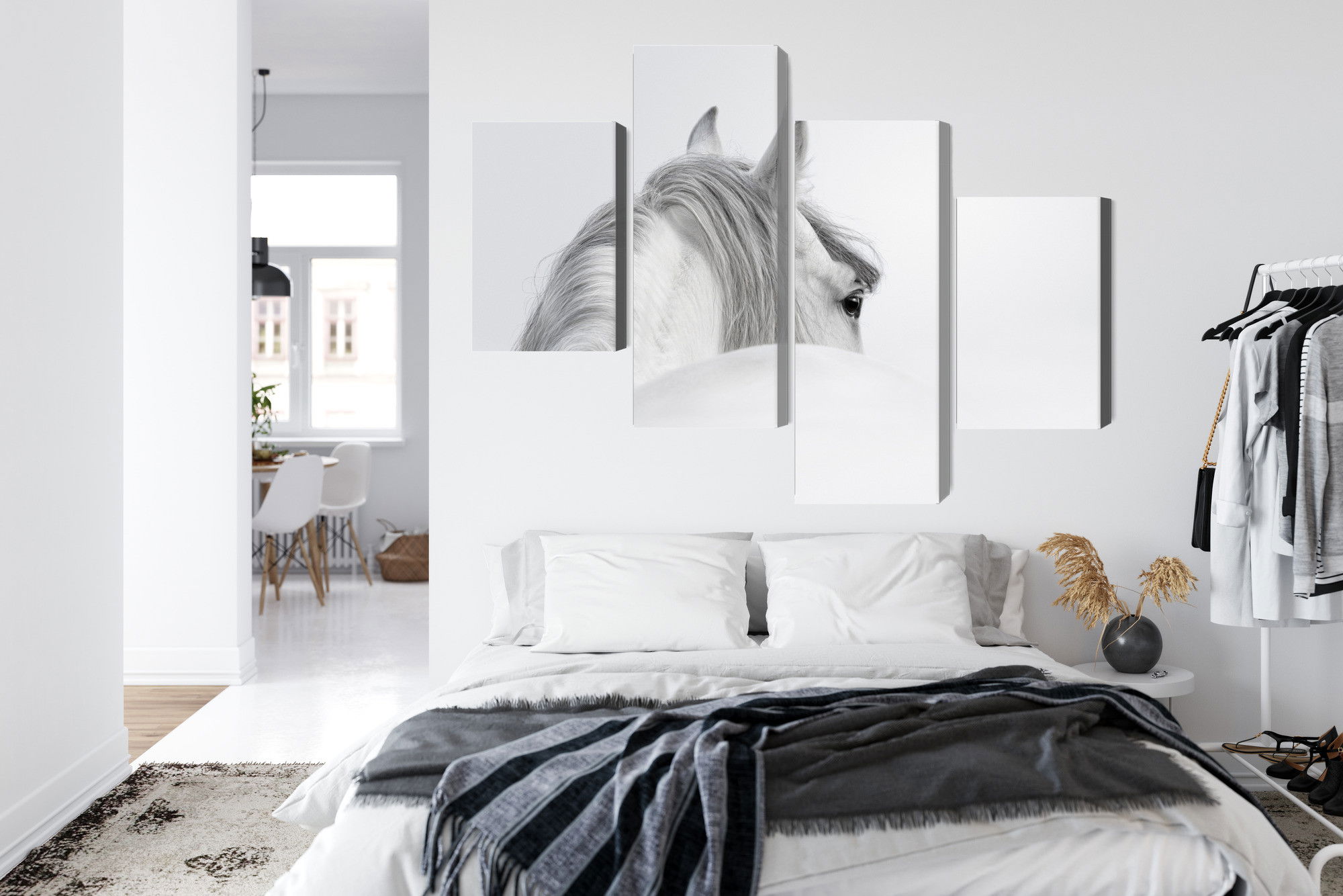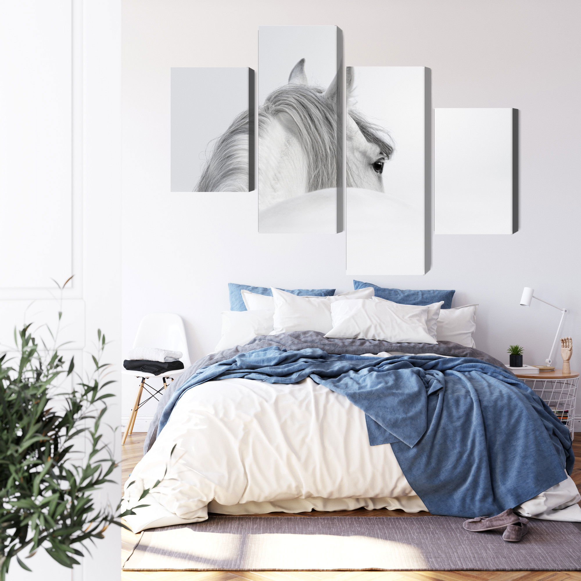 Varje tavla monteras på en massiv fururam. Format upp till 70×50 cm har en ram på 15 mm, medan format från 90×60 cm och uppåt har en ram på 20 mm. Den exakta dukspänningen gör att tavlan håller sin form över tid. Motivet Andalusian horse in the fog trycks runt hela ramen vilket ger ett stilrent galleriuttryck där tavlan är lika vacker från sidan som framifrån. Kombinationen av rak dukspänning, rena linjer och korrekt tryck ger en professionell finish.