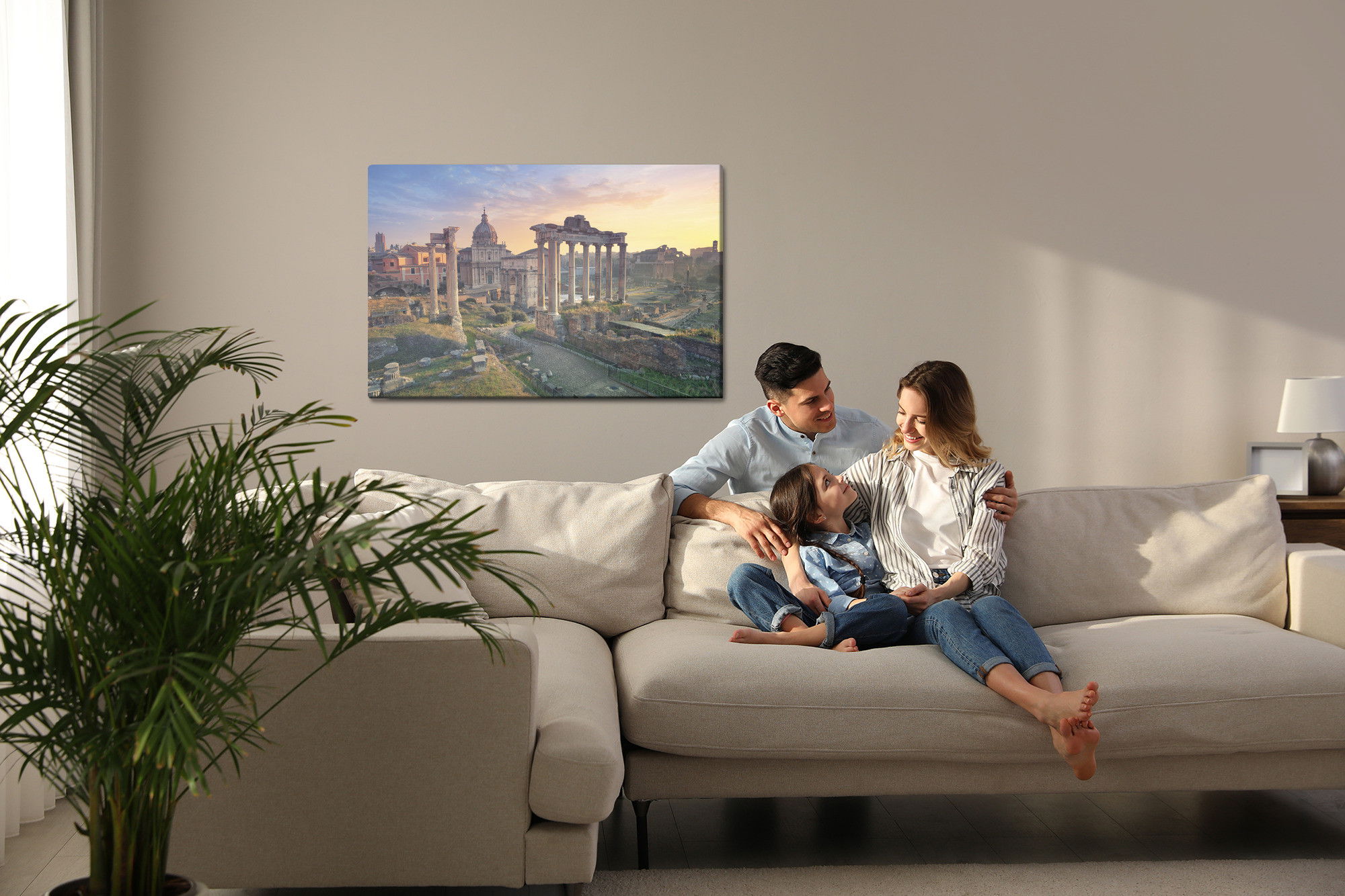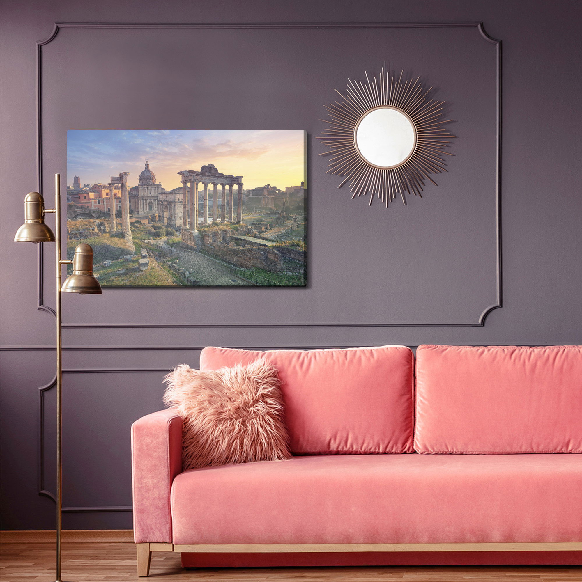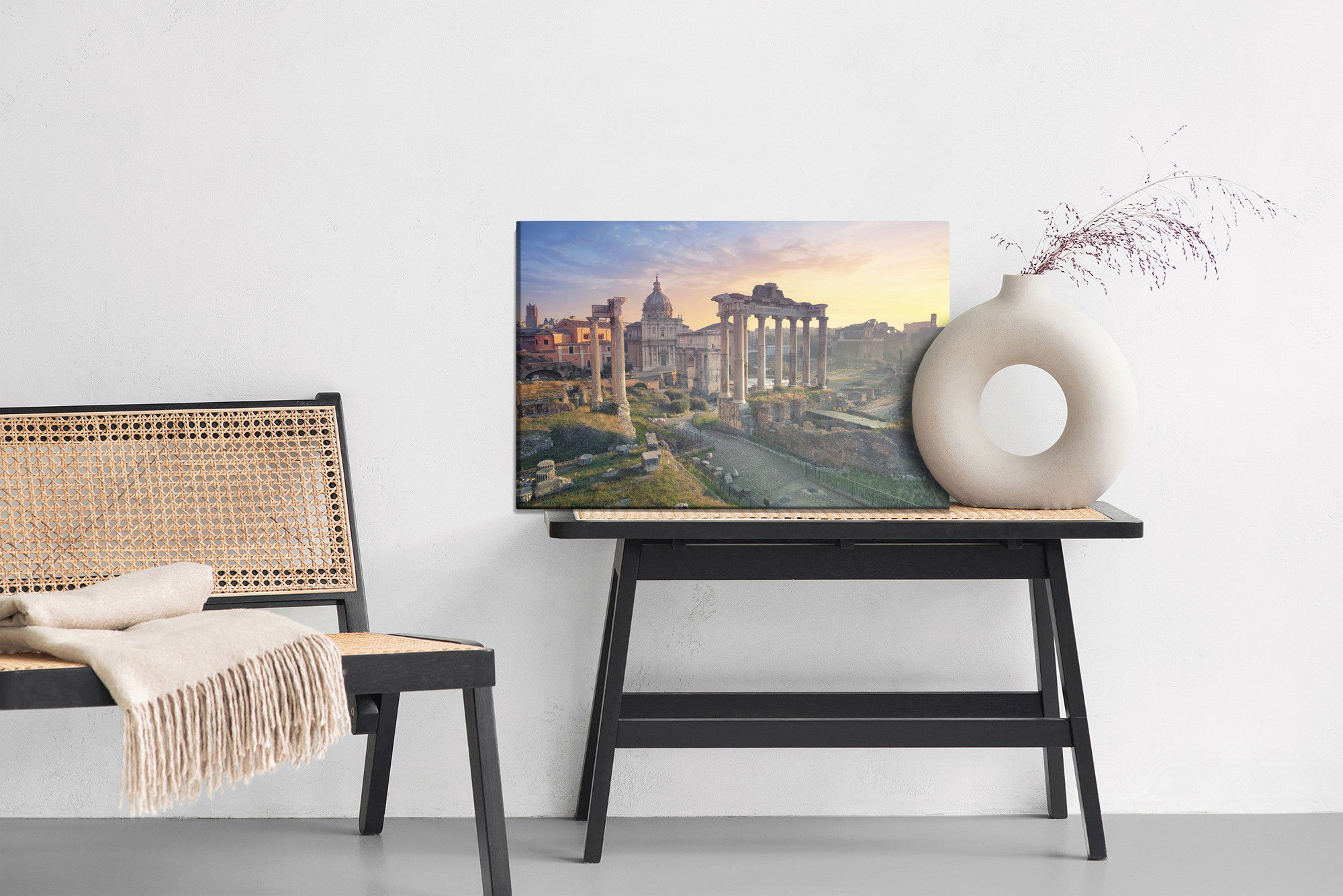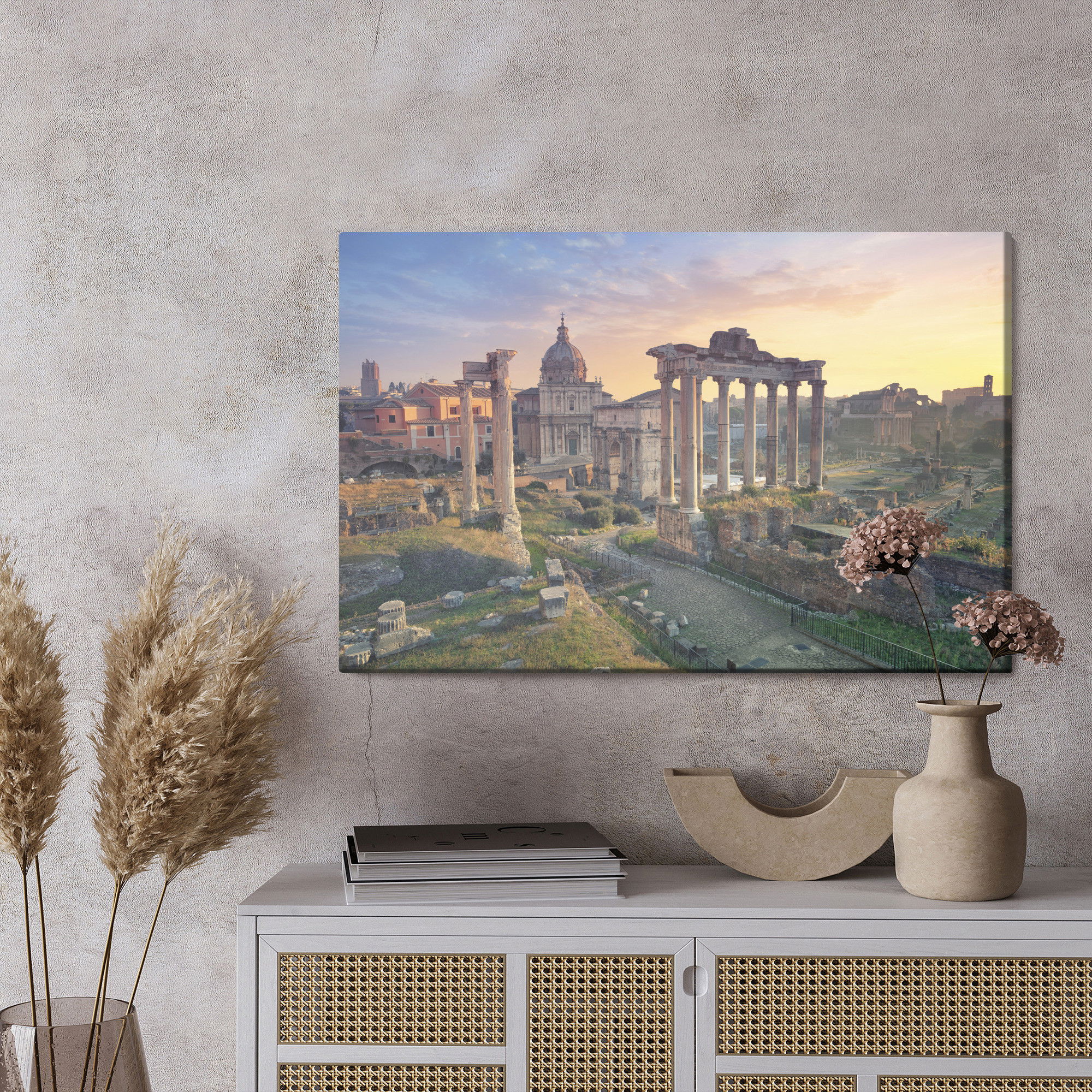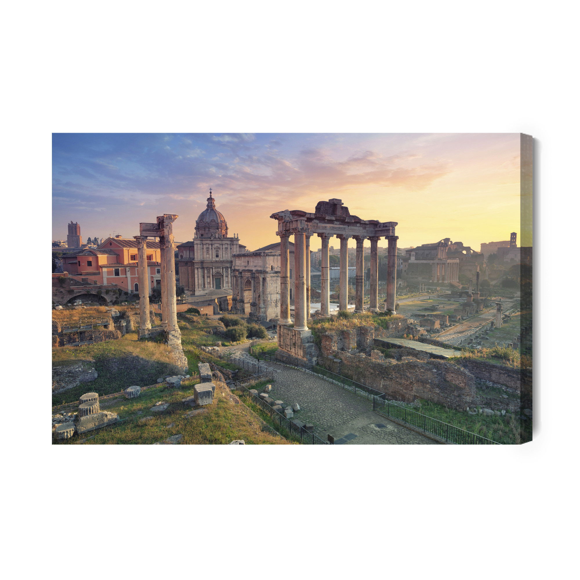 Varje tavla monteras på en massiv fururam. Format upp till 70×50 cm har en ram på 15 mm, medan format från 90×60 cm och uppåt har en ram på 20 mm. Den exakta dukspänningen gör att tavlan håller sin form över tid. Motivet Architecture of Rome trycks runt hela ramen vilket ger ett stilrent galleriuttryck där tavlan är lika vacker från sidan som framifrån. Kombinationen av rak dukspänning, rena linjer och korrekt tryck ger en professionell finish.