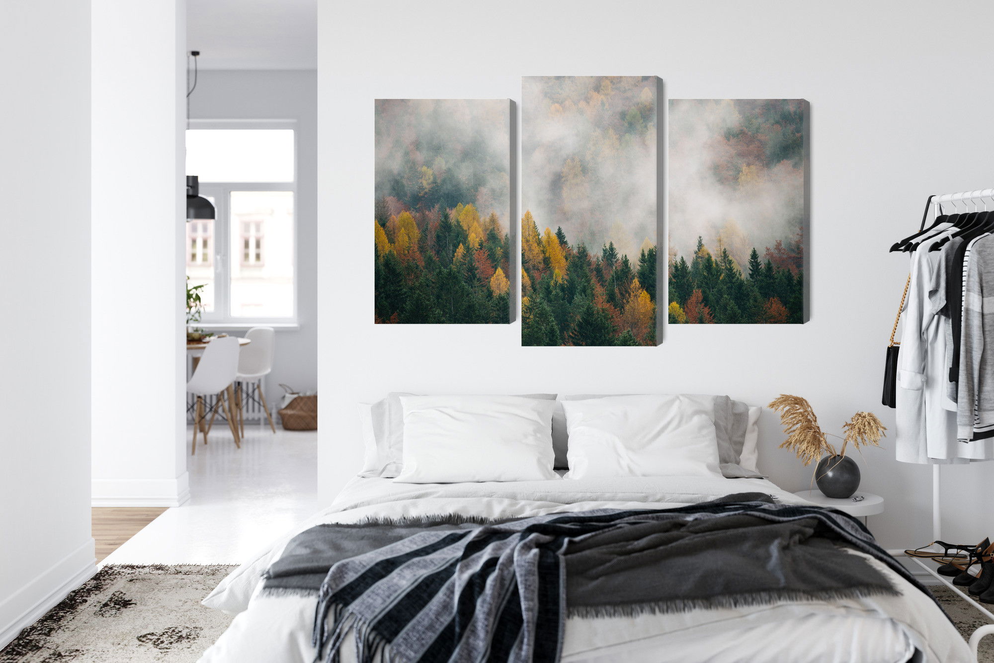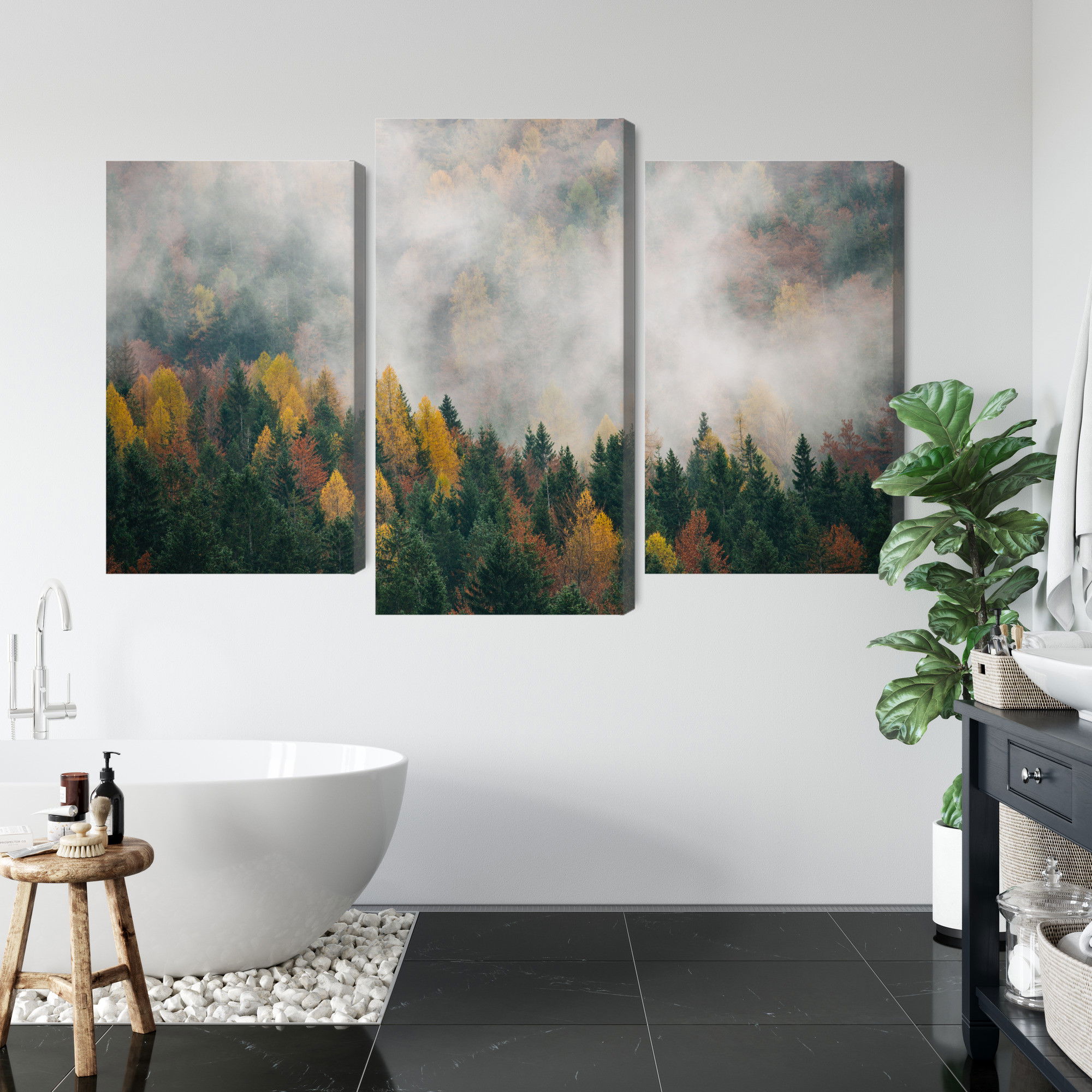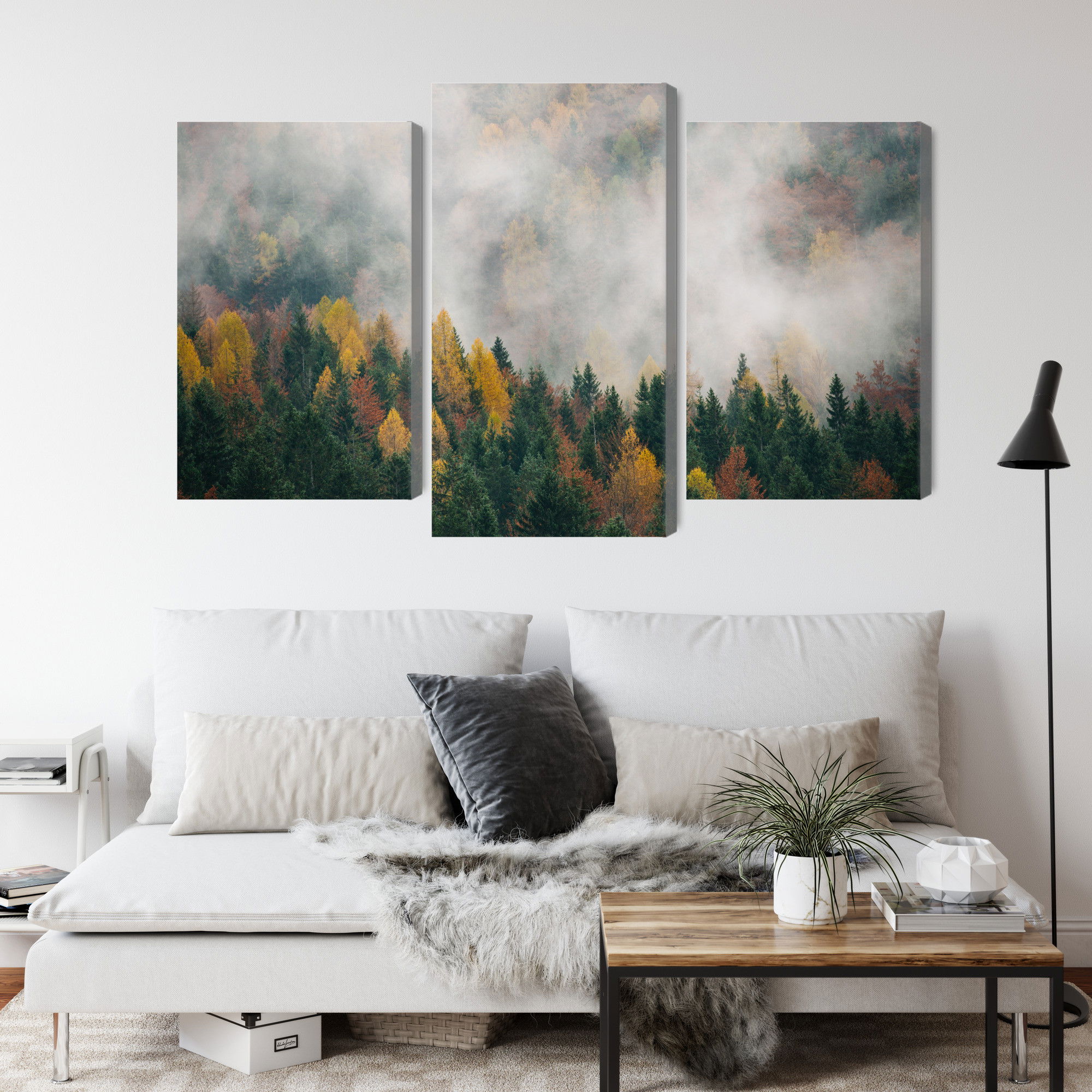 Varje tavla monteras på en massiv fururam. Format upp till 70×50 cm har en ram på 15 mm, medan format från 90×60 cm och uppåt har en ram på 20 mm. Den exakta dukspänningen gör att tavlan håller sin form över tid. Motivet Autumn forest in fog 3d trycks runt hela ramen vilket ger ett stilrent galleriuttryck där tavlan är lika vacker från sidan som framifrån. Kombinationen av rak dukspänning, rena linjer och korrekt tryck ger en professionell finish.