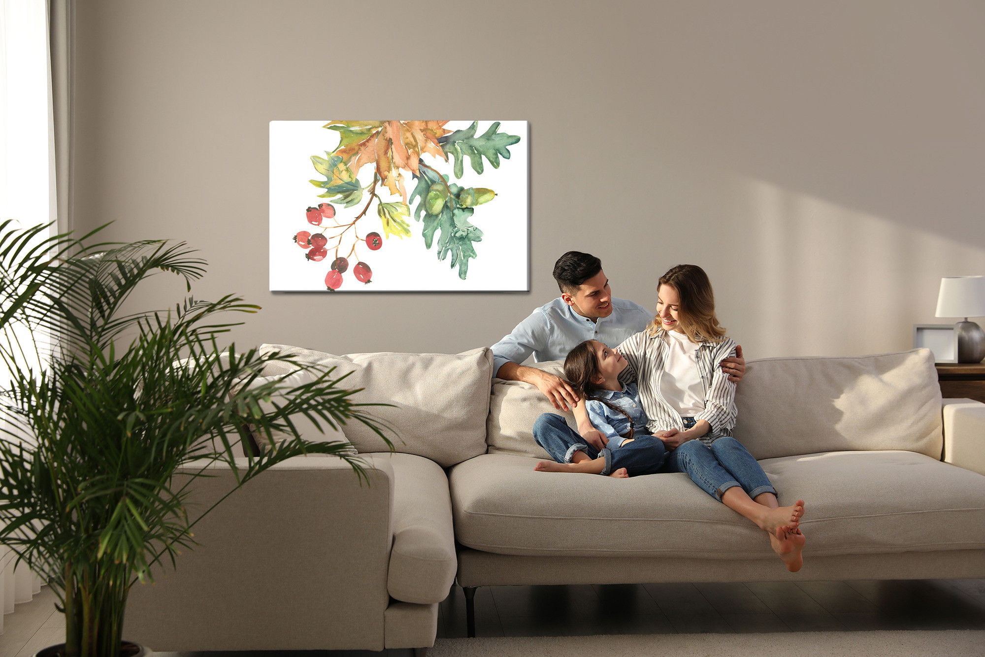 Varje tavla monteras på en massiv fururam. Format upp till 70×50 cm har en ram på 15 mm, medan format från 90×60 cm och uppåt har en ram på 20 mm. Den exakta dukspänningen gör att tavlan håller sin form över tid. Motivet Autumn leaves and fruits trycks runt hela ramen vilket ger ett stilrent galleriuttryck där tavlan är lika vacker från sidan som framifrån. Kombinationen av rak dukspänning, rena linjer och korrekt tryck ger en professionell finish.