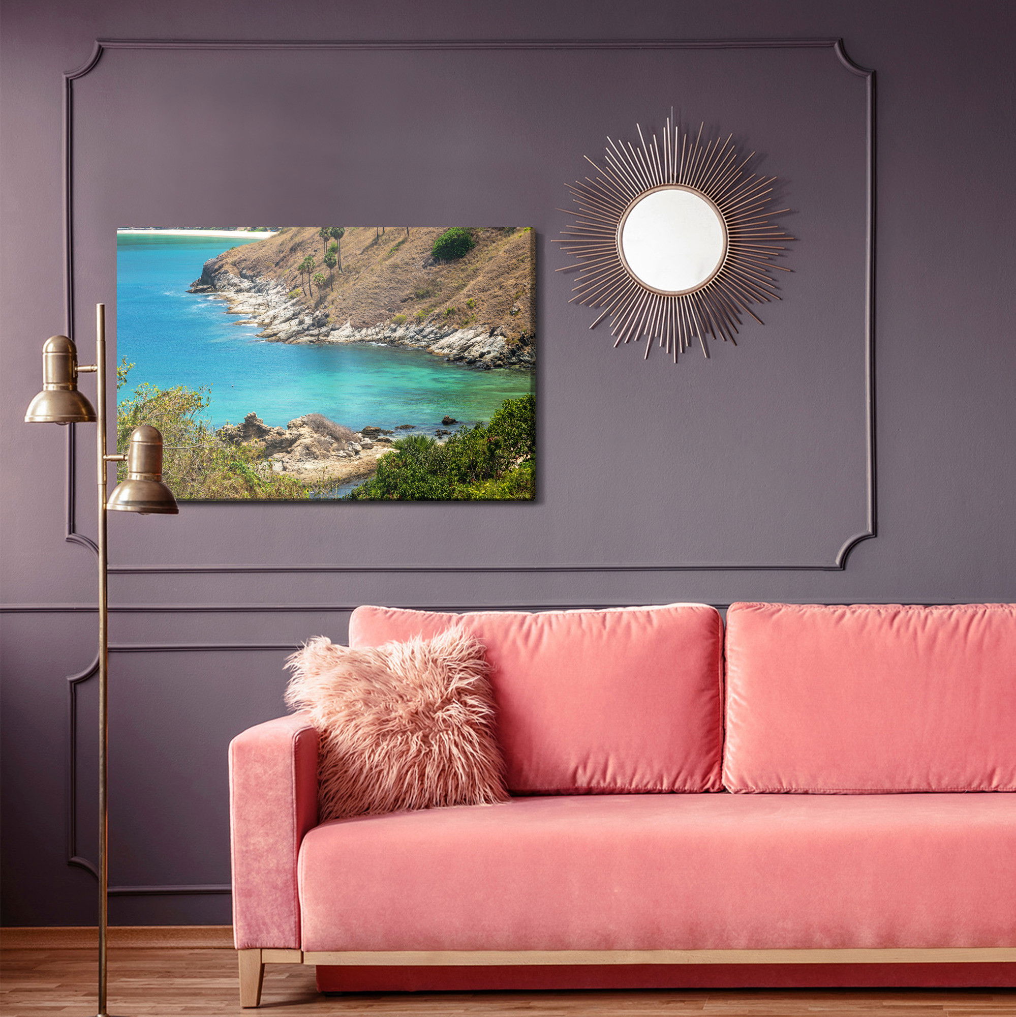 Varje tavla monteras på en massiv fururam. Format upp till 70×50 cm har en ram på 15 mm, medan format från 90×60 cm och uppåt har en ram på 20 mm. Den exakta dukspänningen gör att tavlan håller sin form över tid. Motivet Azure sea and coast trycks runt hela ramen vilket ger ett stilrent galleriuttryck där tavlan är lika vacker från sidan som framifrån. Kombinationen av rak dukspänning, rena linjer och korrekt tryck ger en professionell finish.