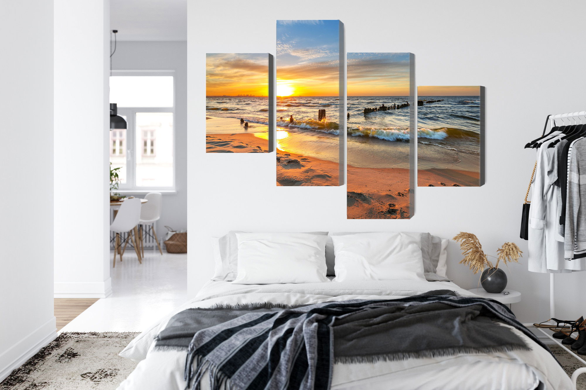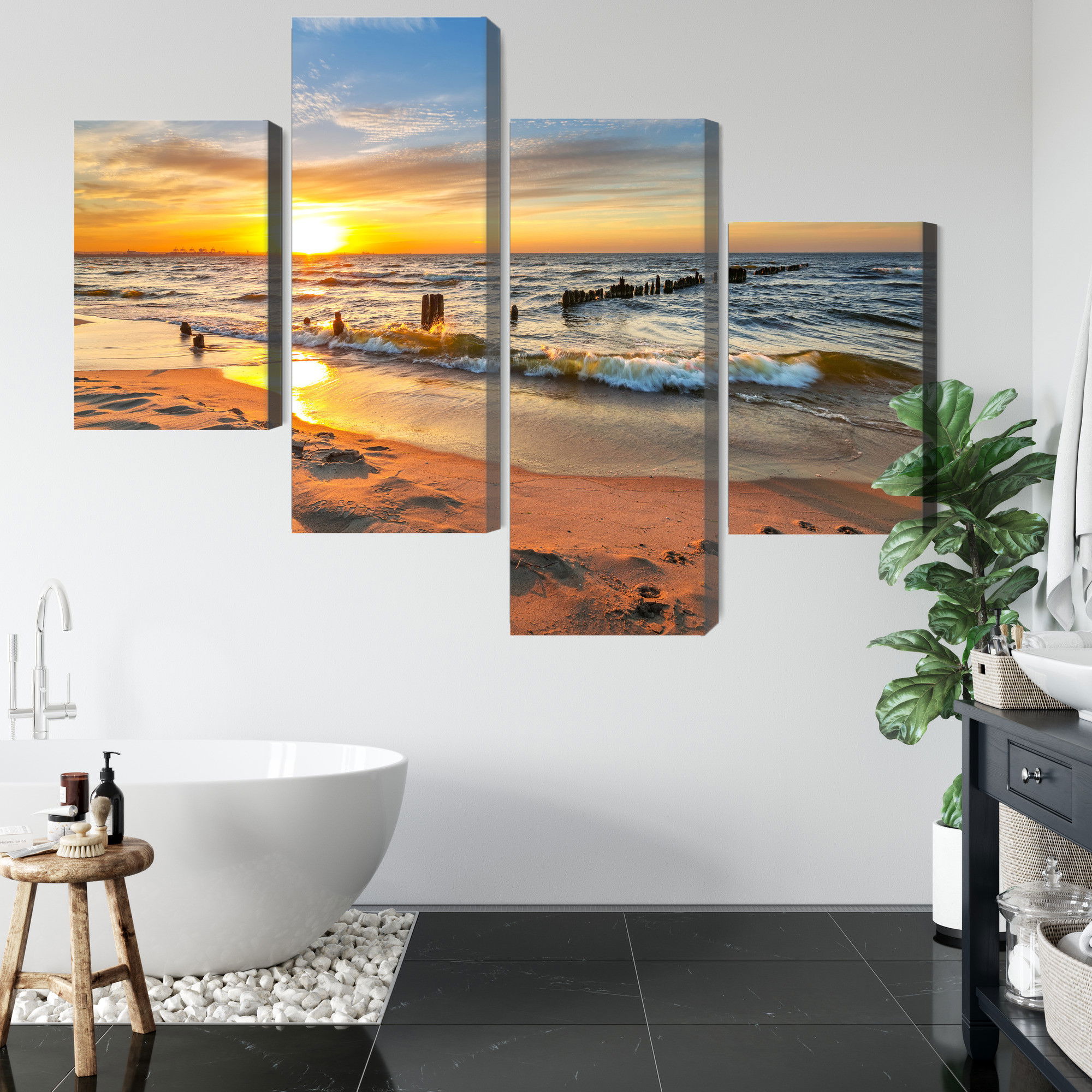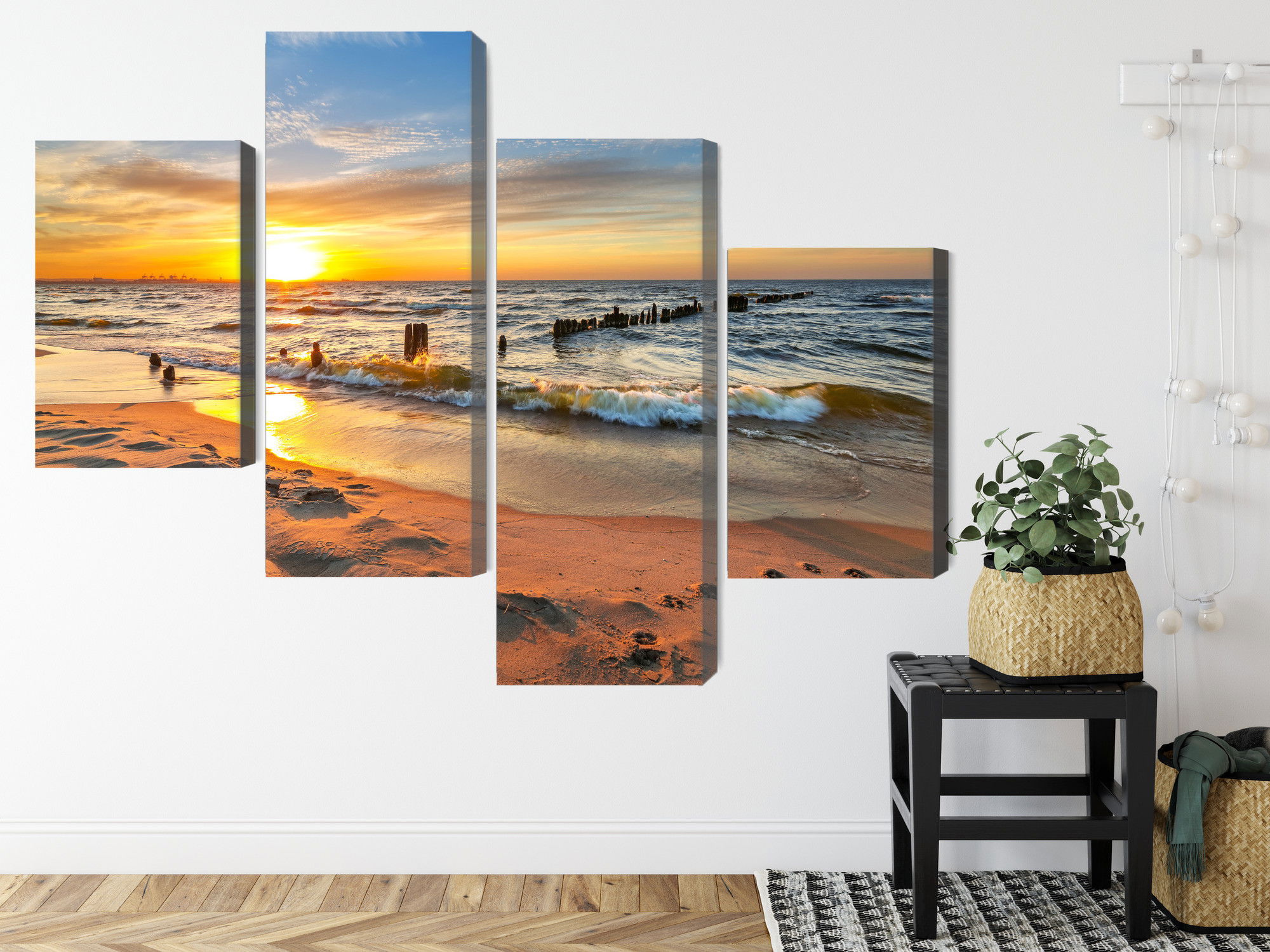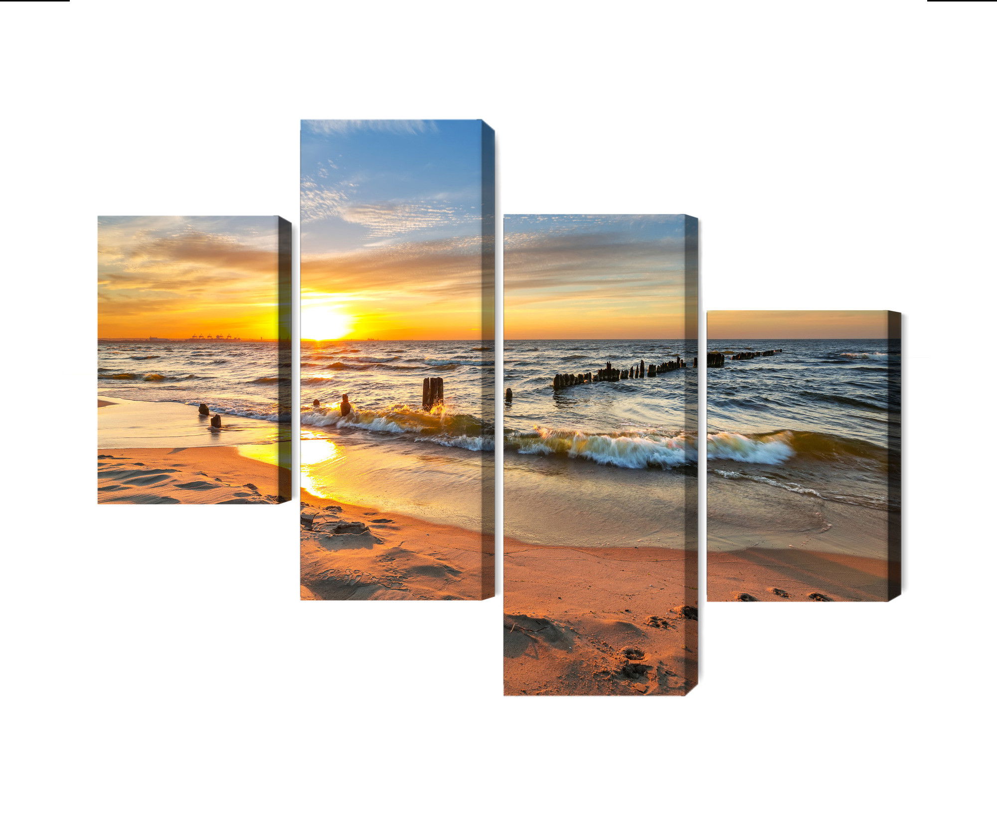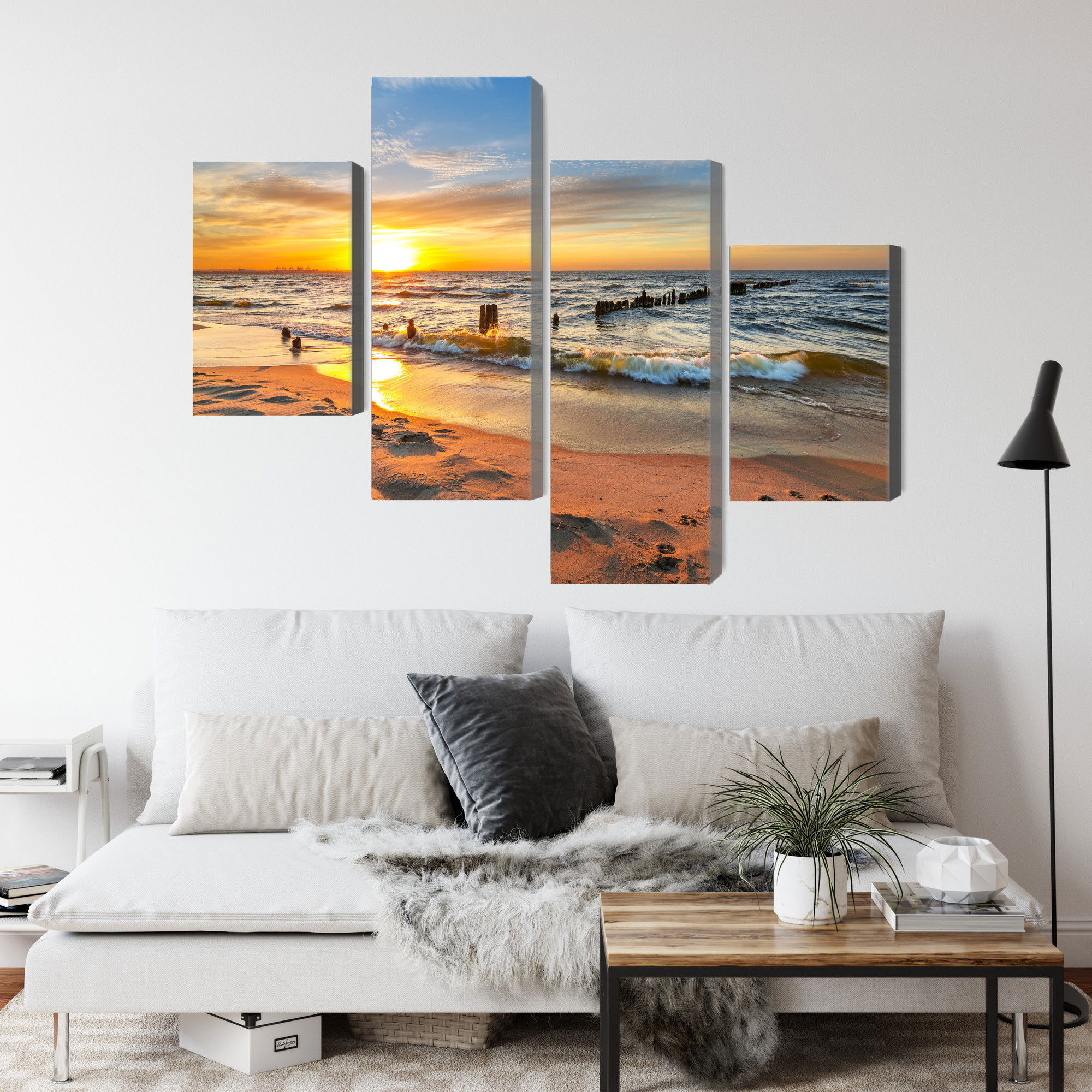 Varje tavla monteras på en massiv fururam. Format upp till 70×50 cm har en ram på 15 mm, medan format från 90×60 cm och uppåt har en ram på 20 mm. Den exakta dukspänningen gör att tavlan håller sin form över tid. Motivet Baltic sea at sunset trycks runt hela ramen vilket ger ett stilrent galleriuttryck där tavlan är lika vacker från sidan som framifrån. Kombinationen av rak dukspänning, rena linjer och korrekt tryck ger en professionell finish.