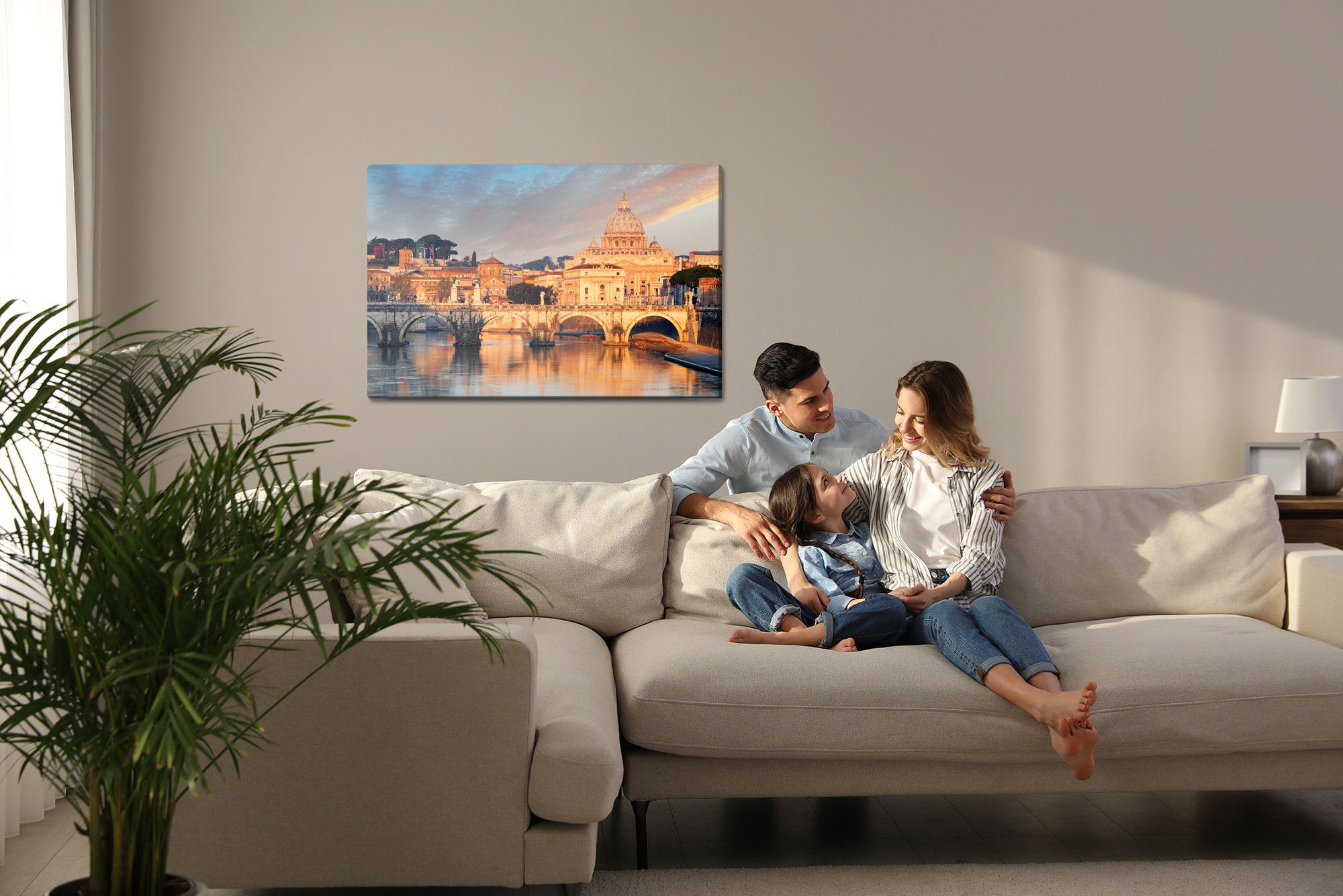 Motivet Basilica of st. peter in Rome återges med hög färgprecision och detaljrikedom tack vare HP Latex-teknologi. Trycket sker med vattenbaserade, luktfria och GREENGUARD Gold-certifierade bläck som ger en upplösning på upp till 300 DPI. Färgerna är UV-beständiga och behåller sin styrka även i ljusa rum, vilket gör tavlan lämplig för både hem- och offentliga miljöer.