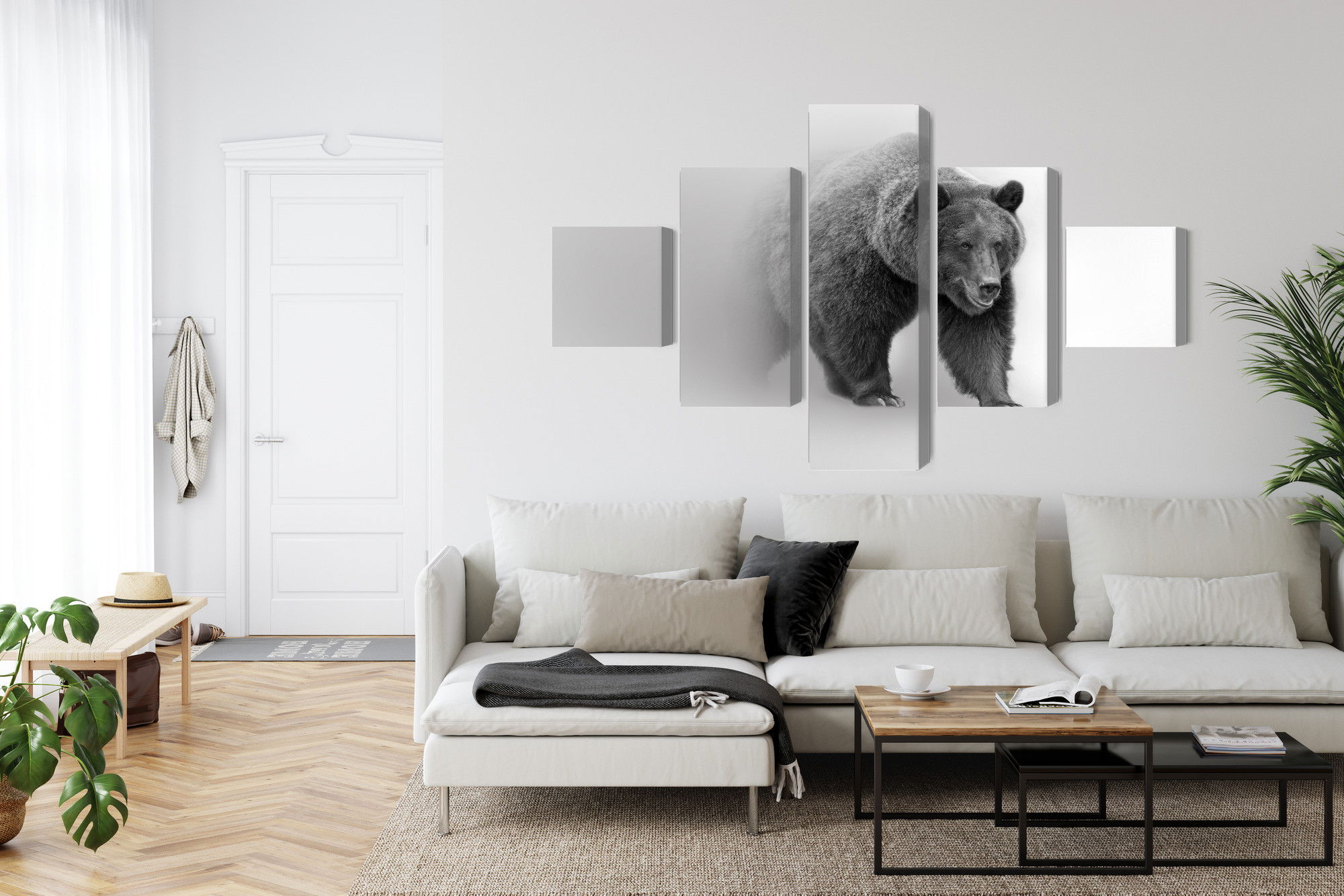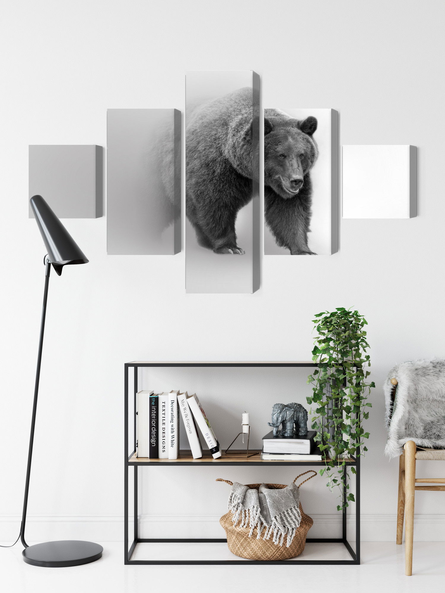 Varje tavla monteras på en massiv fururam. Format upp till 70×50 cm har en ram på 15 mm, medan format från 90×60 cm och uppåt har en ram på 20 mm. Den exakta dukspänningen gör att tavlan håller sin form över tid. Motivet Bear in the fog 3d trycks runt hela ramen vilket ger ett stilrent galleriuttryck där tavlan är lika vacker från sidan som framifrån. Kombinationen av rak dukspänning, rena linjer och korrekt tryck ger en professionell finish.