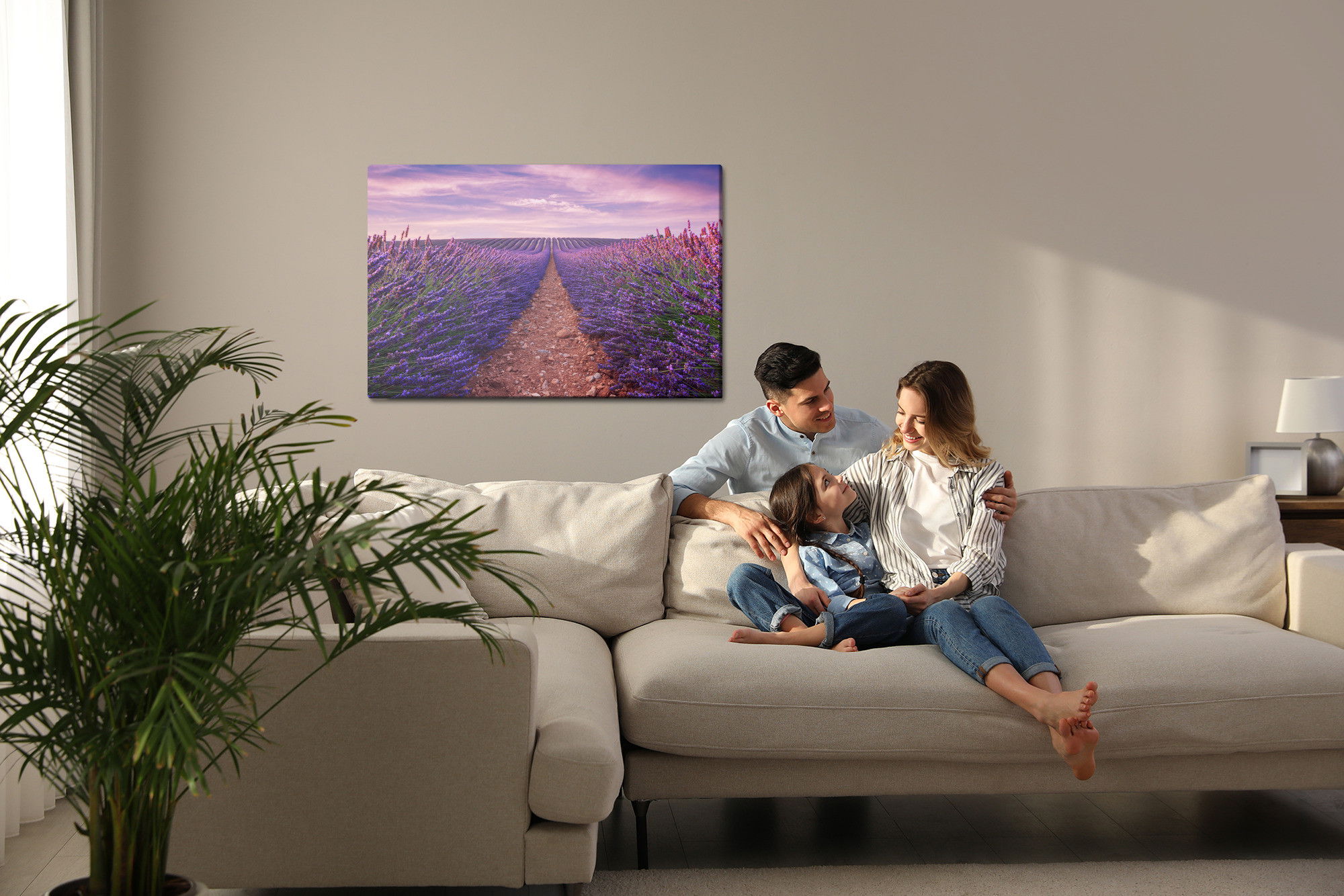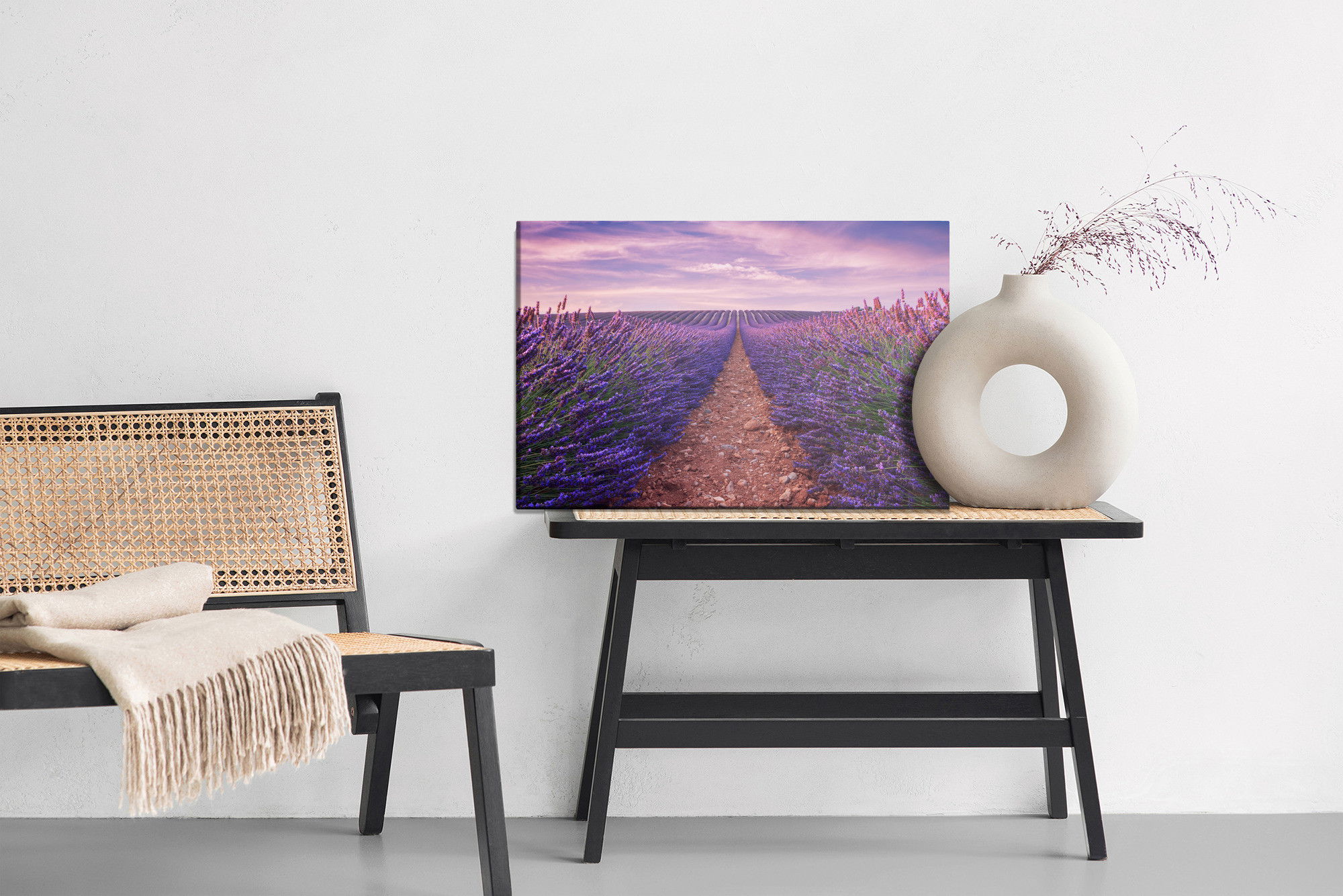 Varje tavla monteras på en massiv fururam. Format upp till 70×50 cm har en ram på 15 mm, medan format från 90×60 cm och uppåt har en ram på 20 mm. Den exakta dukspänningen gör att tavlan håller sin form över tid. Motivet Beautiful lavender field trycks runt hela ramen vilket ger ett stilrent galleriuttryck där tavlan är lika vacker från sidan som framifrån. Kombinationen av rak dukspänning, rena linjer och korrekt tryck ger en professionell finish.