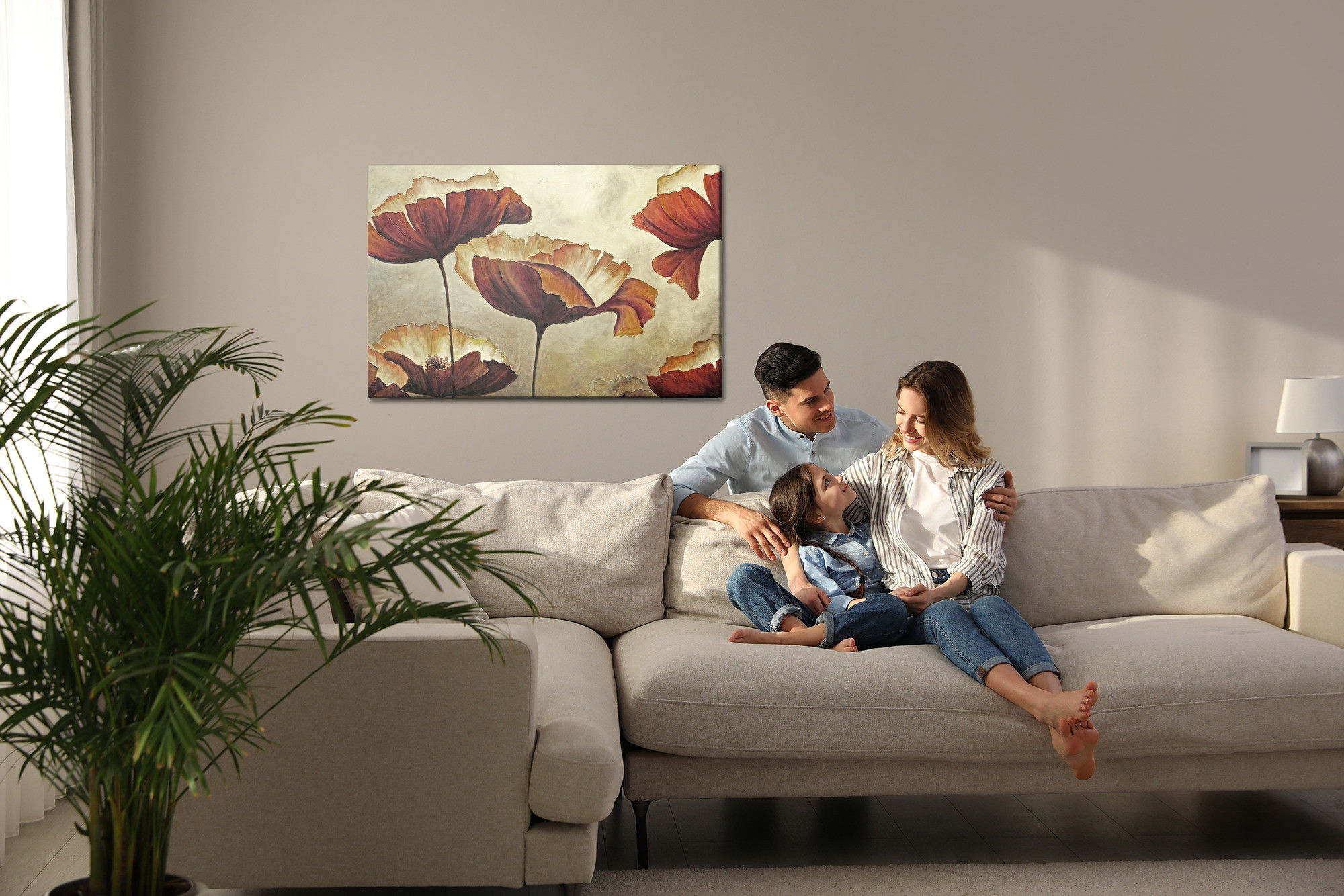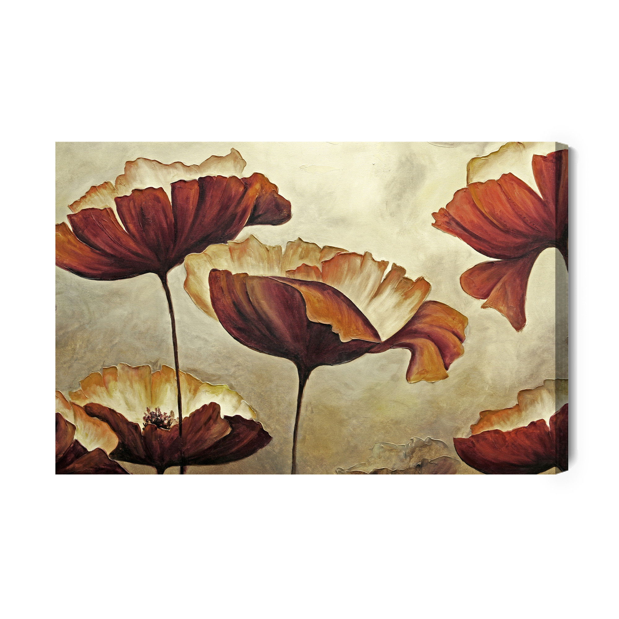 Varje tavla monteras på en massiv fururam. Format upp till 70×50 cm har en ram på 15 mm, medan format från 90×60 cm och uppåt har en ram på 20 mm. Den exakta dukspänningen gör att tavlan håller sin form över tid. Motivet Beautiful poppy flowers trycks runt hela ramen vilket ger ett stilrent galleriuttryck där tavlan är lika vacker från sidan som framifrån. Kombinationen av rak dukspänning, rena linjer och korrekt tryck ger en professionell finish.