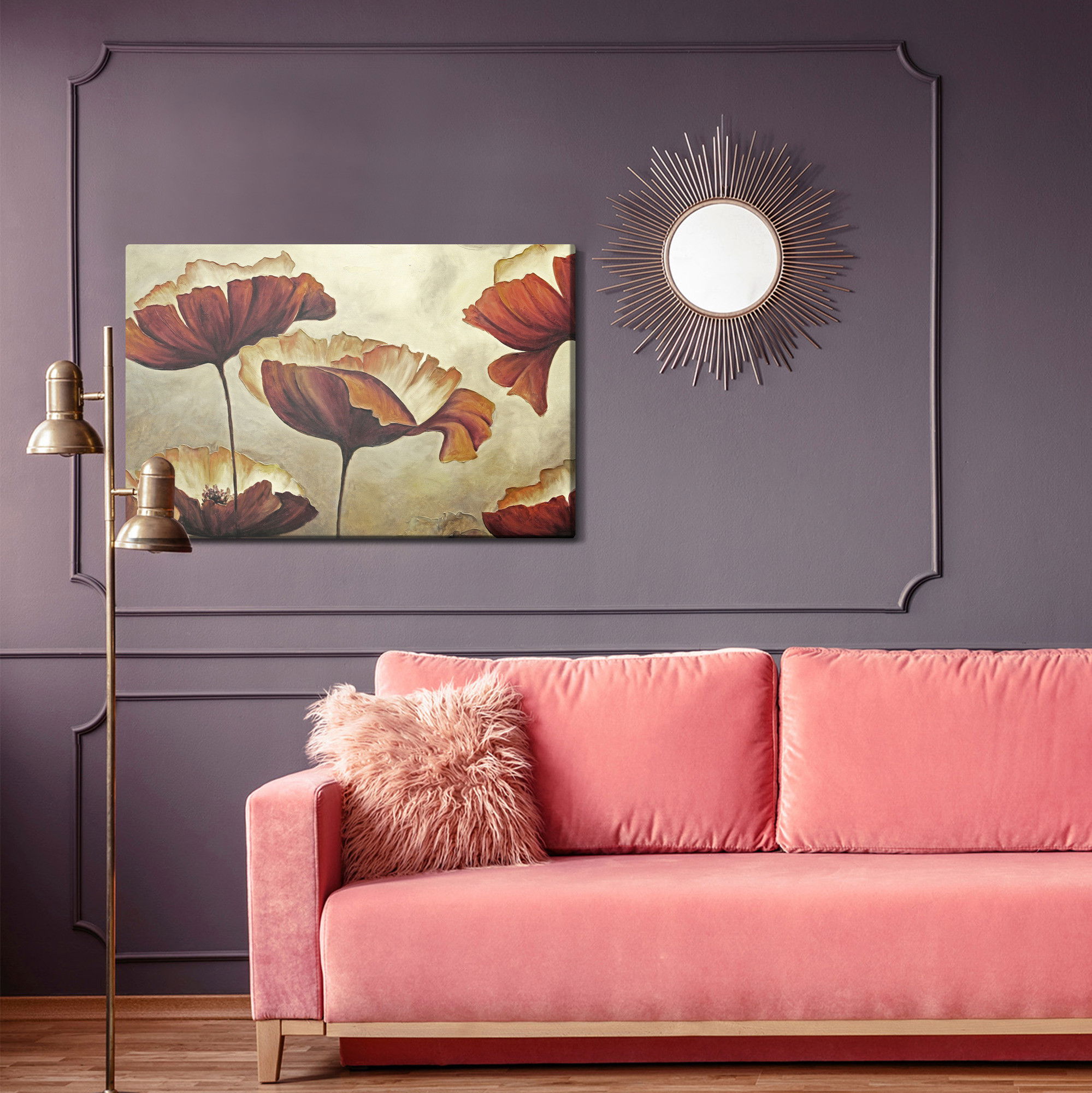 SilentDirects ljuddämpande tavla Beautiful poppy flowers kombinerar ett högupplöst motiv med avancerad akustikteknik. Varje tavla monteras i Sverige och bygger på en stabil canvastavla med fururam, där insidan av ramen fylls med en ljudabsorberande kärna av återvunnen polyester. Konstruktionen gör tavlan till ett både estetiskt och funktionellt inslag i rummet.