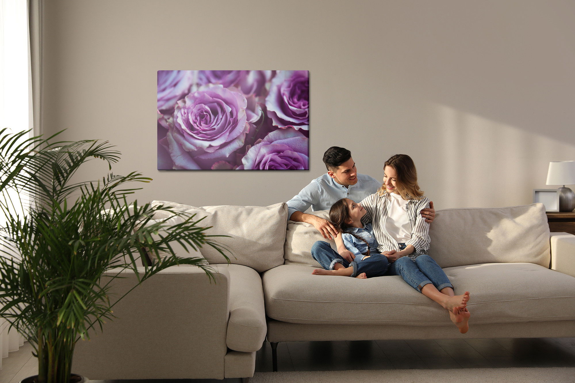Motivet Beautiful purple roses återges med hög färgprecision och detaljrikedom tack vare HP Latex-teknologi. Trycket sker med vattenbaserade, luktfria och GREENGUARD Gold-certifierade bläck som ger en upplösning på upp till 300 DPI. Färgerna är UV-beständiga och behåller sin styrka även i ljusa rum, vilket gör tavlan lämplig för både hem- och offentliga miljöer.