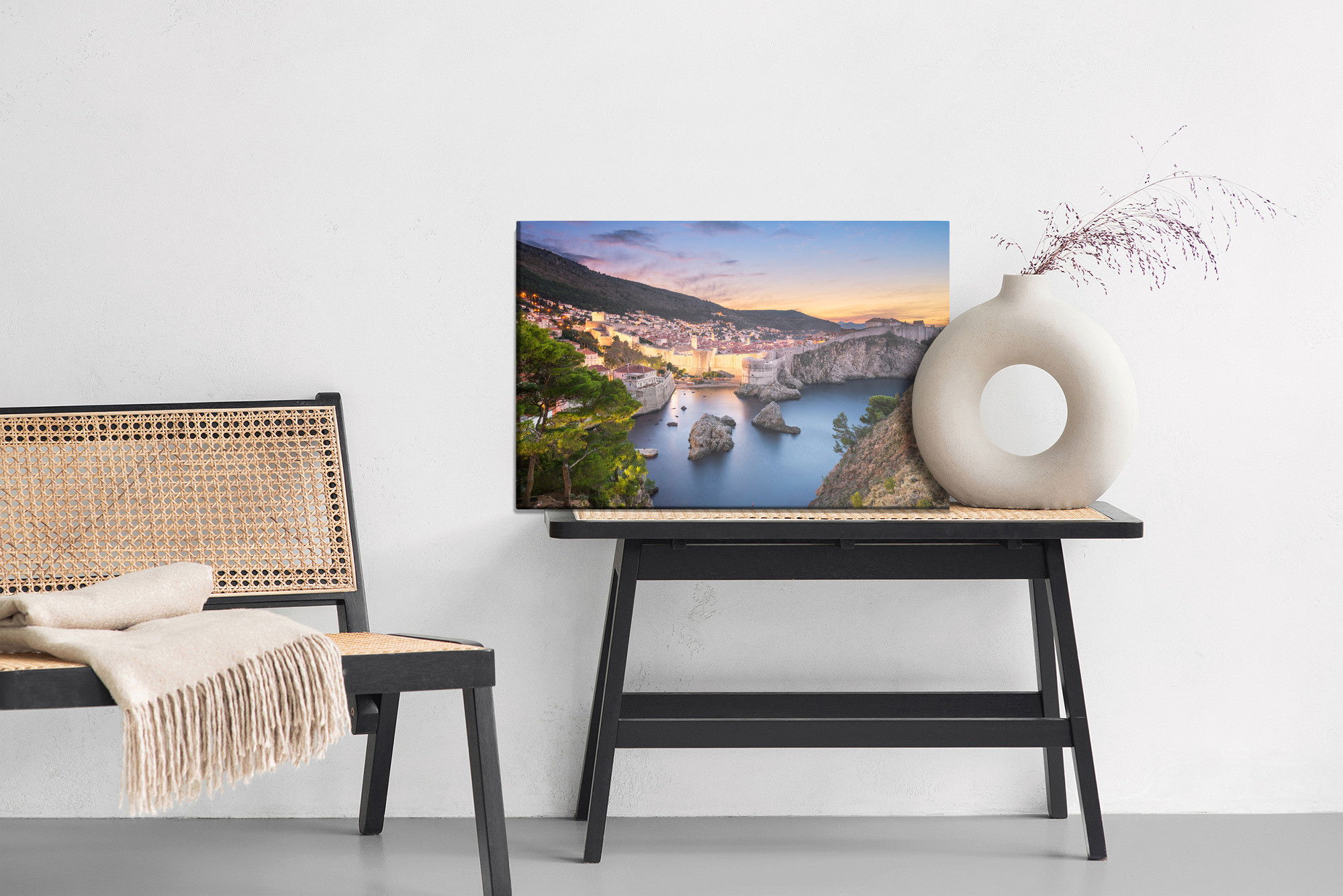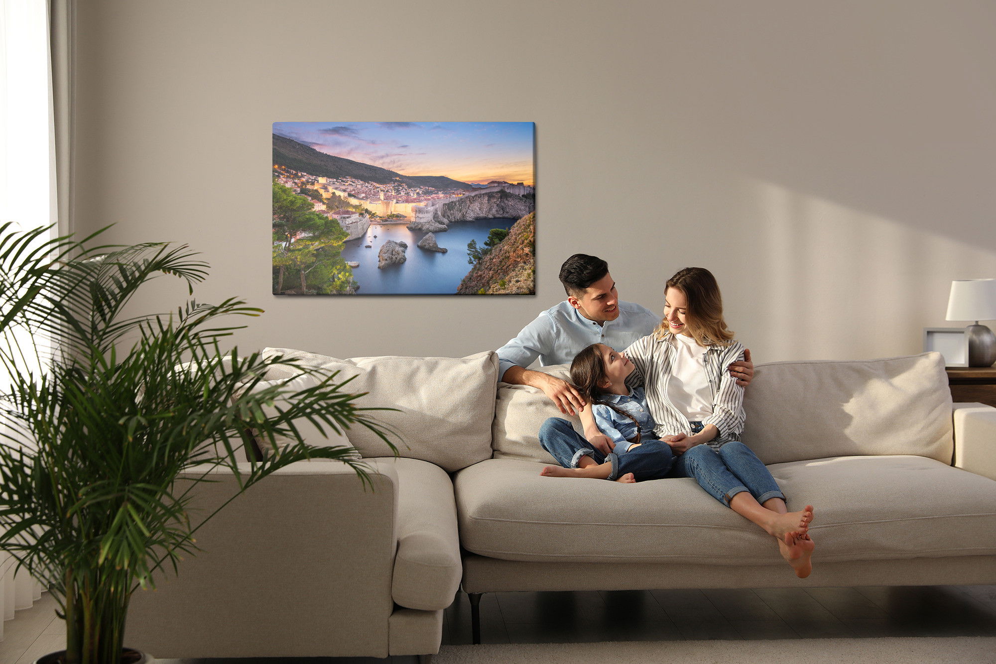 Varje tavla monteras på en massiv fururam. Format upp till 70×50 cm har en ram på 15 mm, medan format från 90×60 cm och uppåt har en ram på 20 mm. Den exakta dukspänningen gör att tavlan håller sin form över tid. Motivet Beautiful sea bay trycks runt hela ramen vilket ger ett stilrent galleriuttryck där tavlan är lika vacker från sidan som framifrån. Kombinationen av rak dukspänning, rena linjer och korrekt tryck ger en professionell finish.