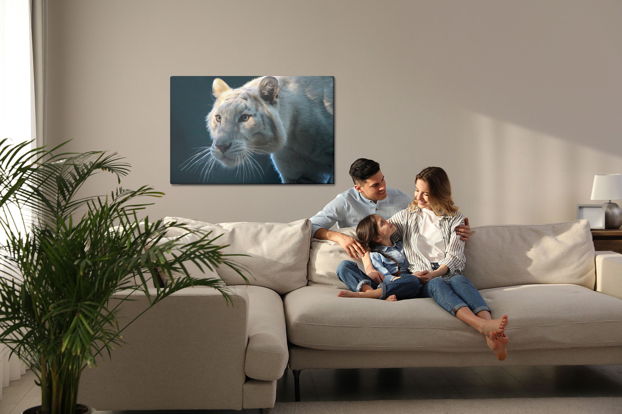 Motivet Beautiful white tiger återges med hög färgprecision och detaljrikedom tack vare HP Latex-teknologi. Trycket sker med vattenbaserade, luktfria och GREENGUARD Gold-certifierade bläck som ger en upplösning på upp till 300 DPI. Färgerna är UV-beständiga och behåller sin styrka även i ljusa rum, vilket gör tavlan lämplig för både hem- och offentliga miljöer.