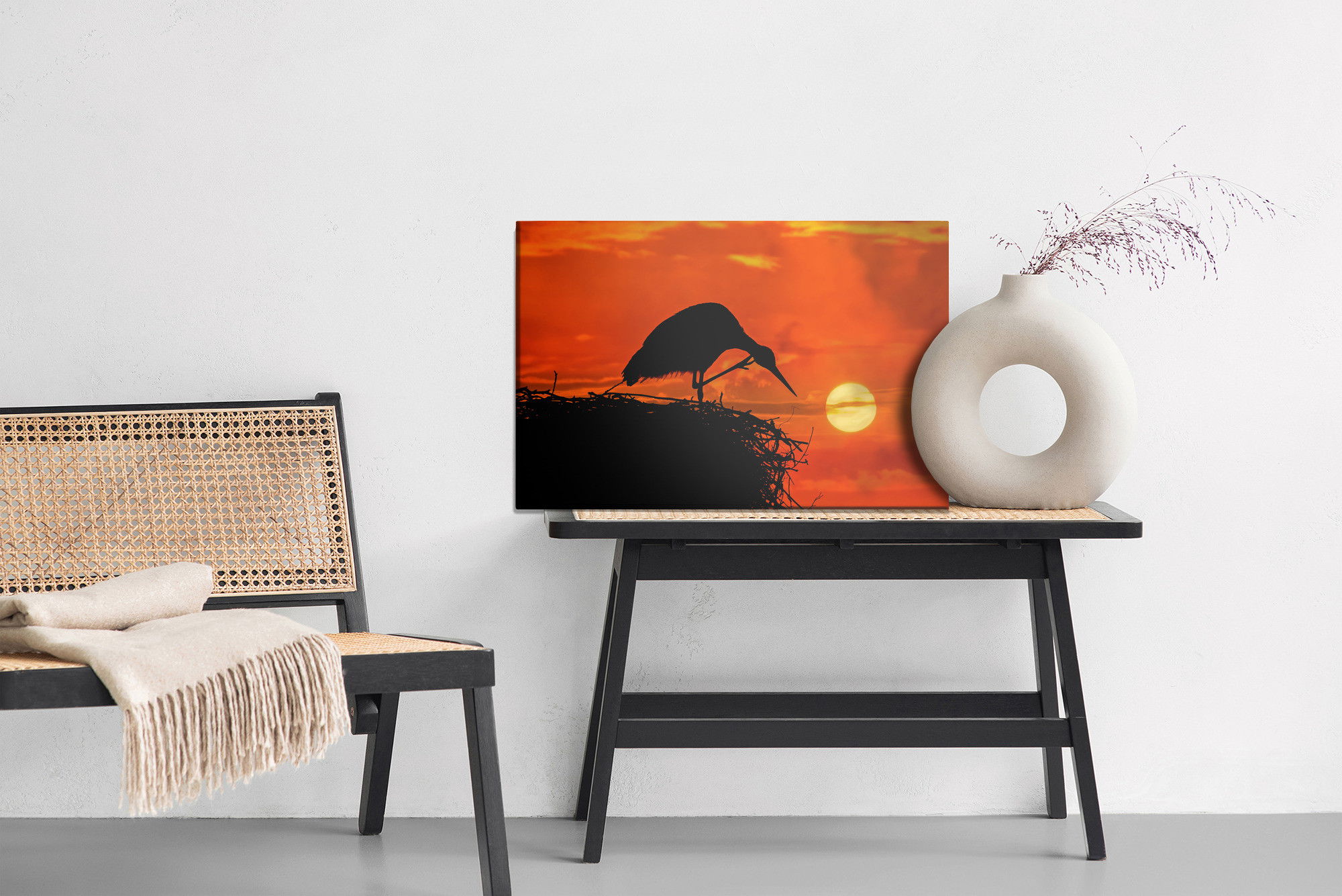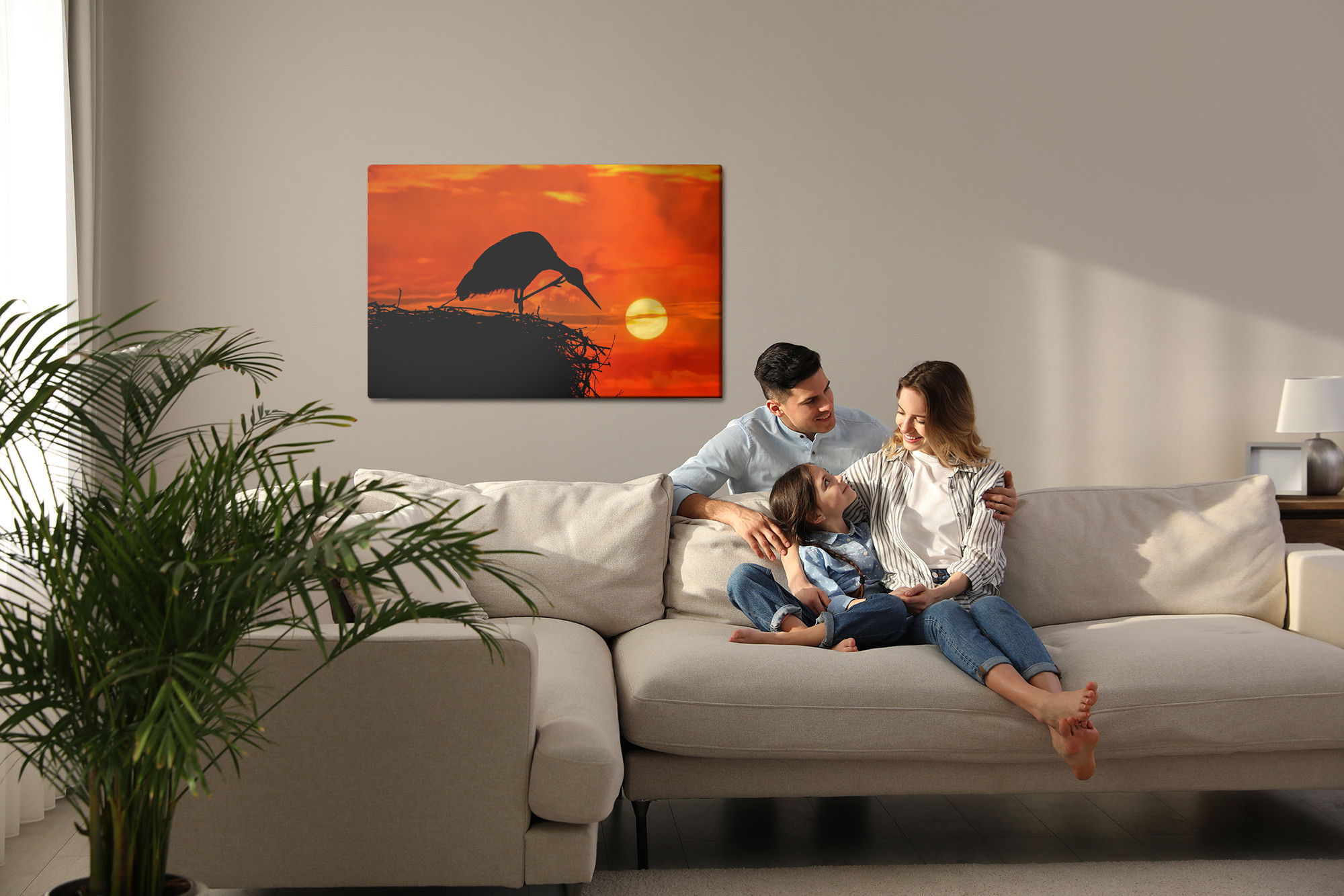Varje tavla monteras på en massiv fururam. Format upp till 70×50 cm har en ram på 15 mm, medan format från 90×60 cm och uppåt har en ram på 20 mm. Den exakta dukspänningen gör att tavlan håller sin form över tid. Motivet Bird in the nest trycks runt hela ramen vilket ger ett stilrent galleriuttryck där tavlan är lika vacker från sidan som framifrån. Kombinationen av rak dukspänning, rena linjer och korrekt tryck ger en professionell finish.
