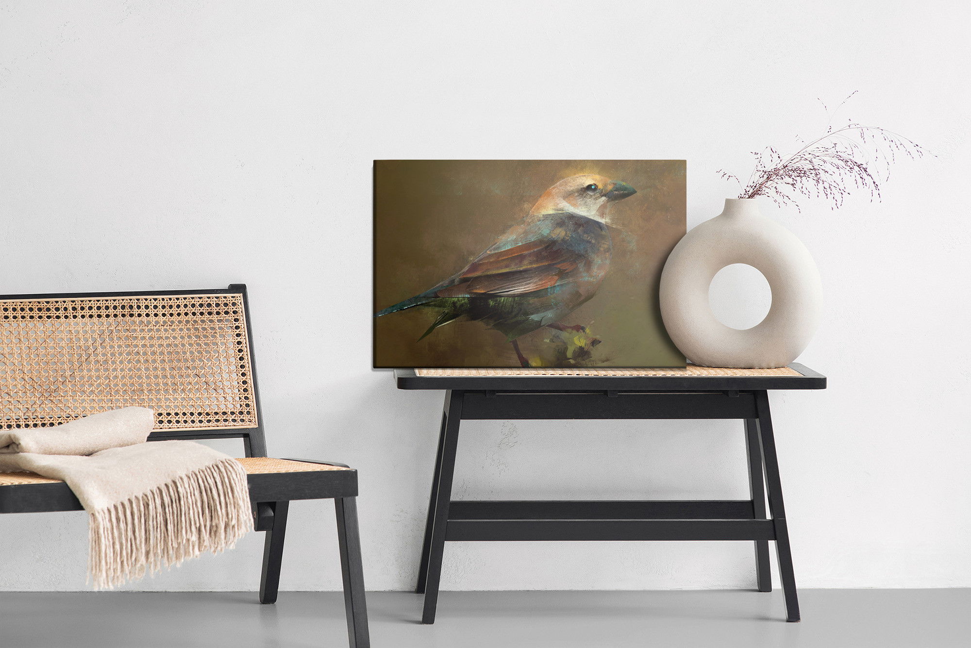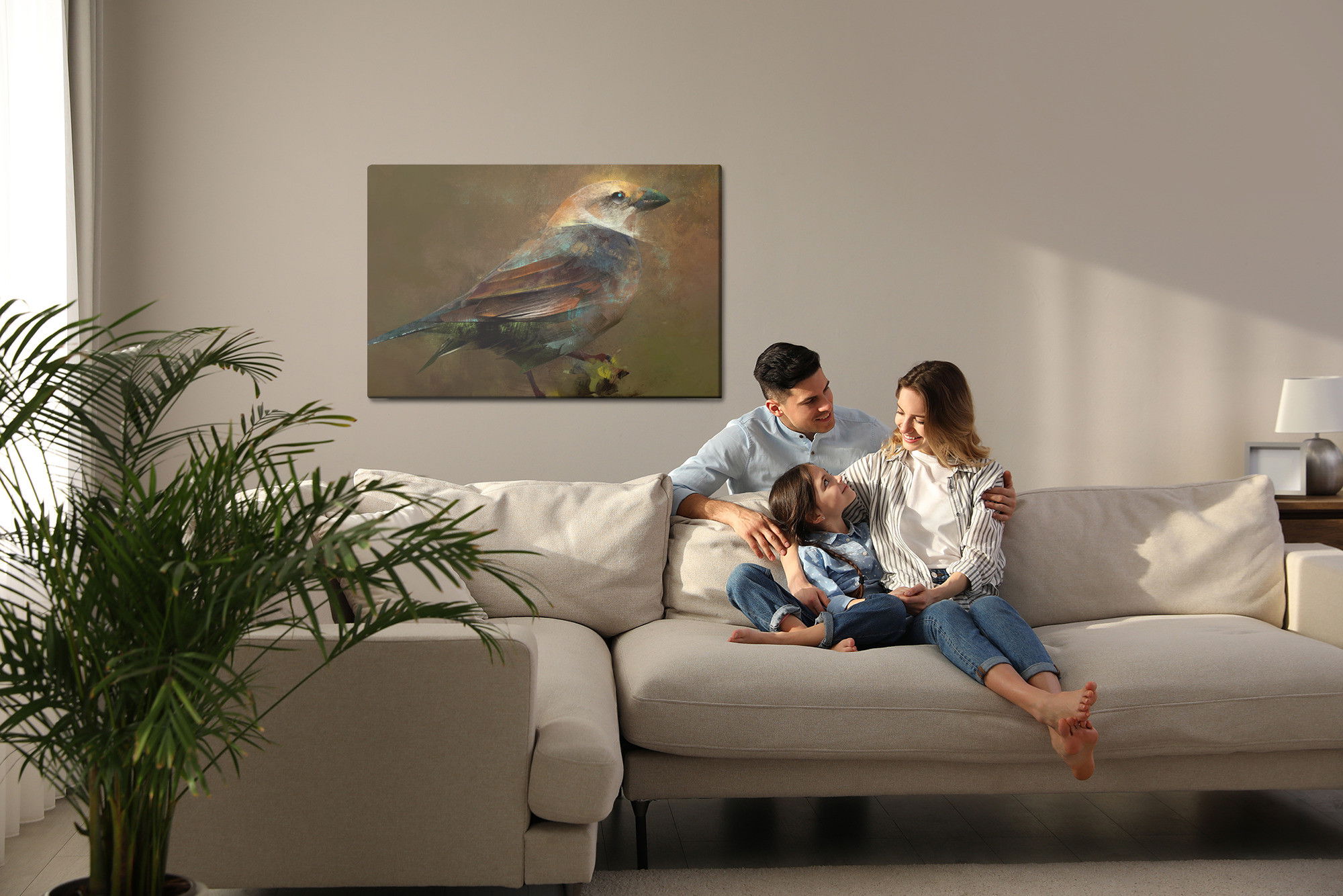 Varje tavla monteras på en massiv fururam. Format upp till 70×50 cm har en ram på 15 mm, medan format från 90×60 cm och uppåt har en ram på 20 mm. Den exakta dukspänningen gör att tavlan håller sin form över tid. Motivet Bird sitting on a branch trycks runt hela ramen vilket ger ett stilrent galleriuttryck där tavlan är lika vacker från sidan som framifrån. Kombinationen av rak dukspänning, rena linjer och korrekt tryck ger en professionell finish.