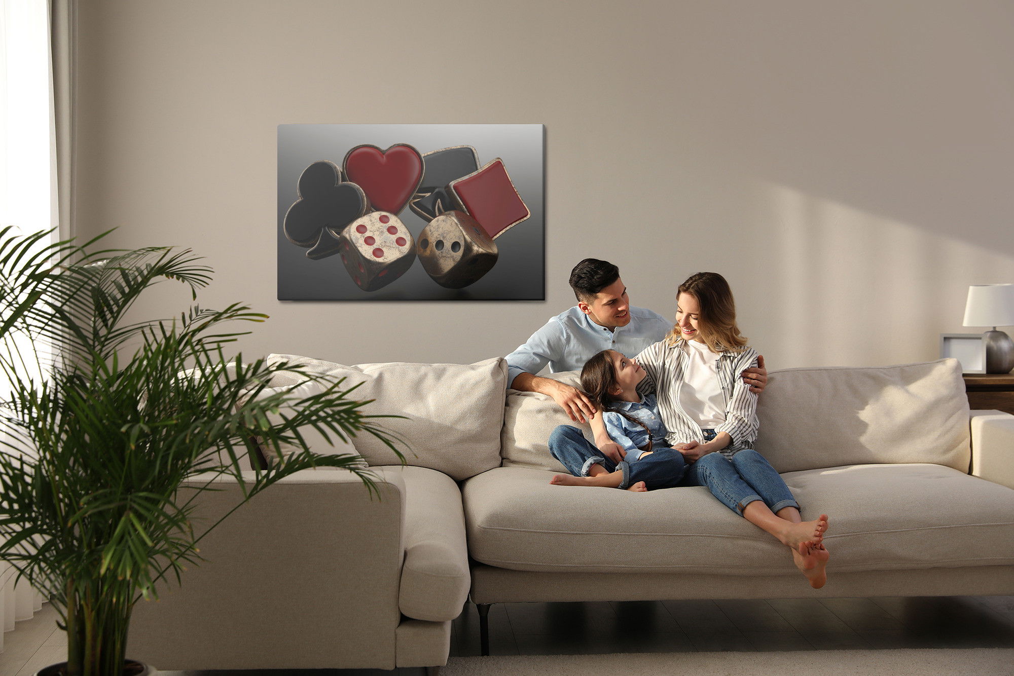 Varje tavla monteras på en massiv fururam. Format upp till 70×50 cm har en ram på 15 mm, medan format från 90×60 cm och uppåt har en ram på 20 mm. Den exakta dukspänningen gör att tavlan håller sin form över tid. Motivet Black and red card symbols trycks runt hela ramen vilket ger ett stilrent galleriuttryck där tavlan är lika vacker från sidan som framifrån. Kombinationen av rak dukspänning, rena linjer och korrekt tryck ger en professionell finish.