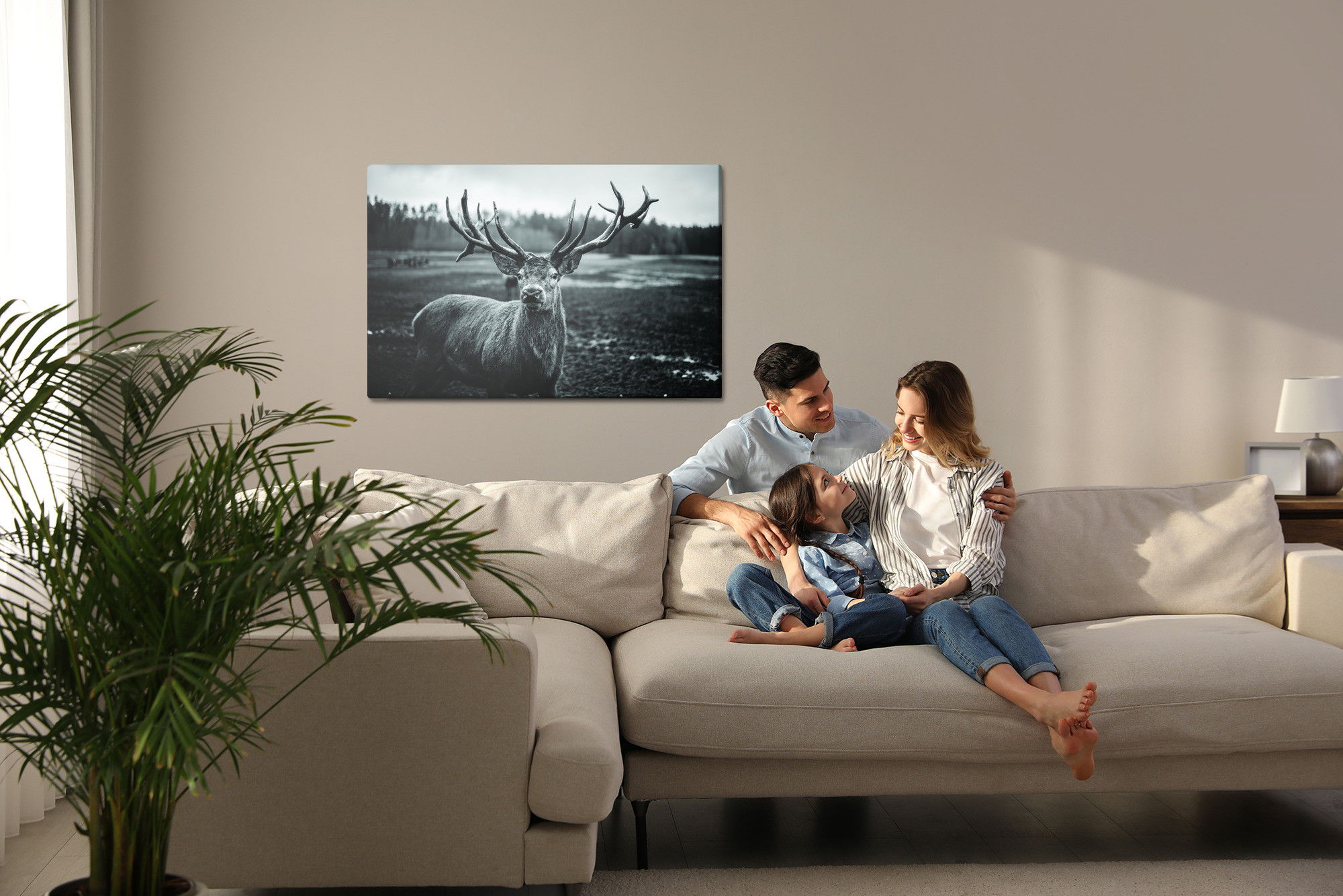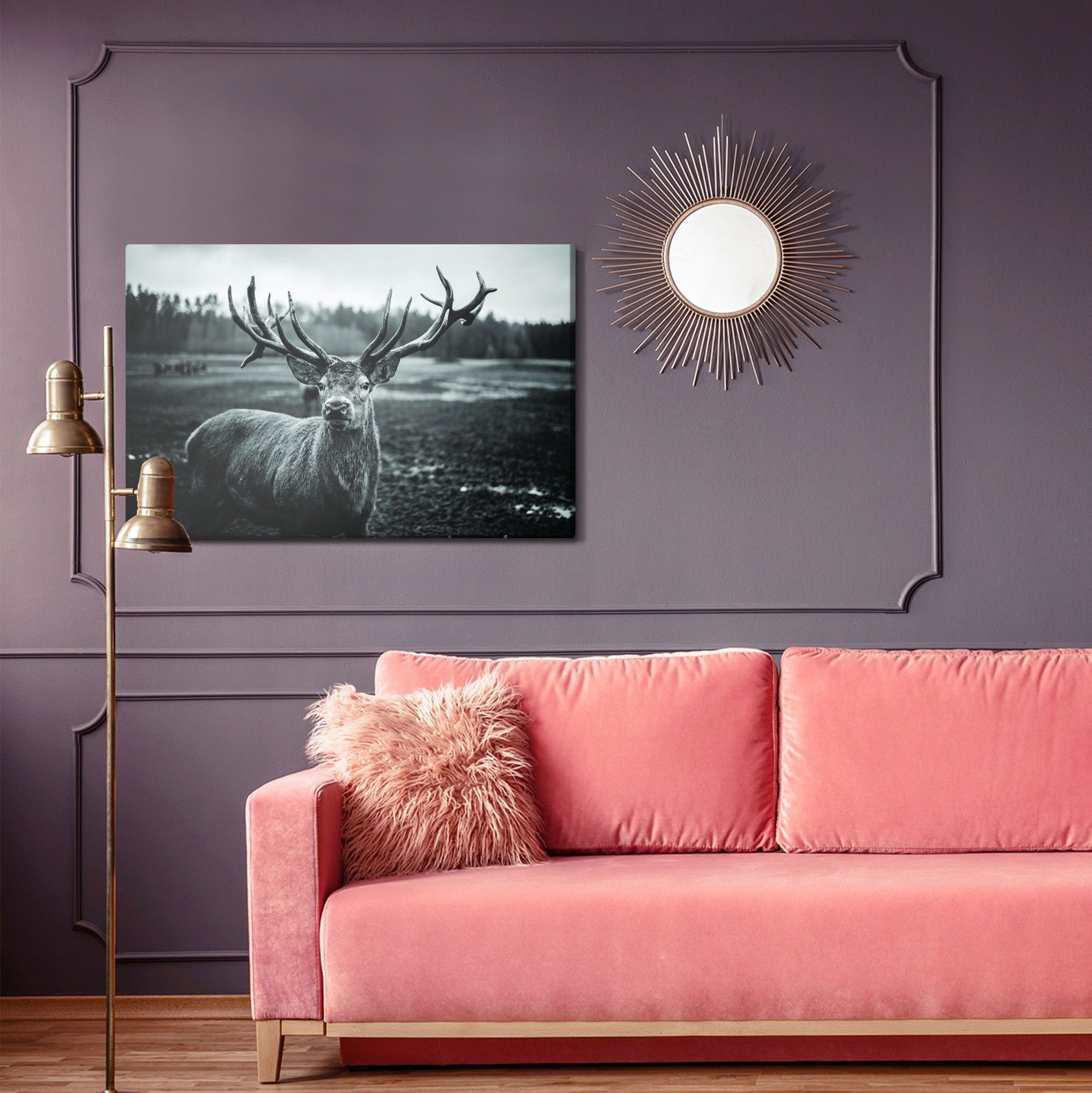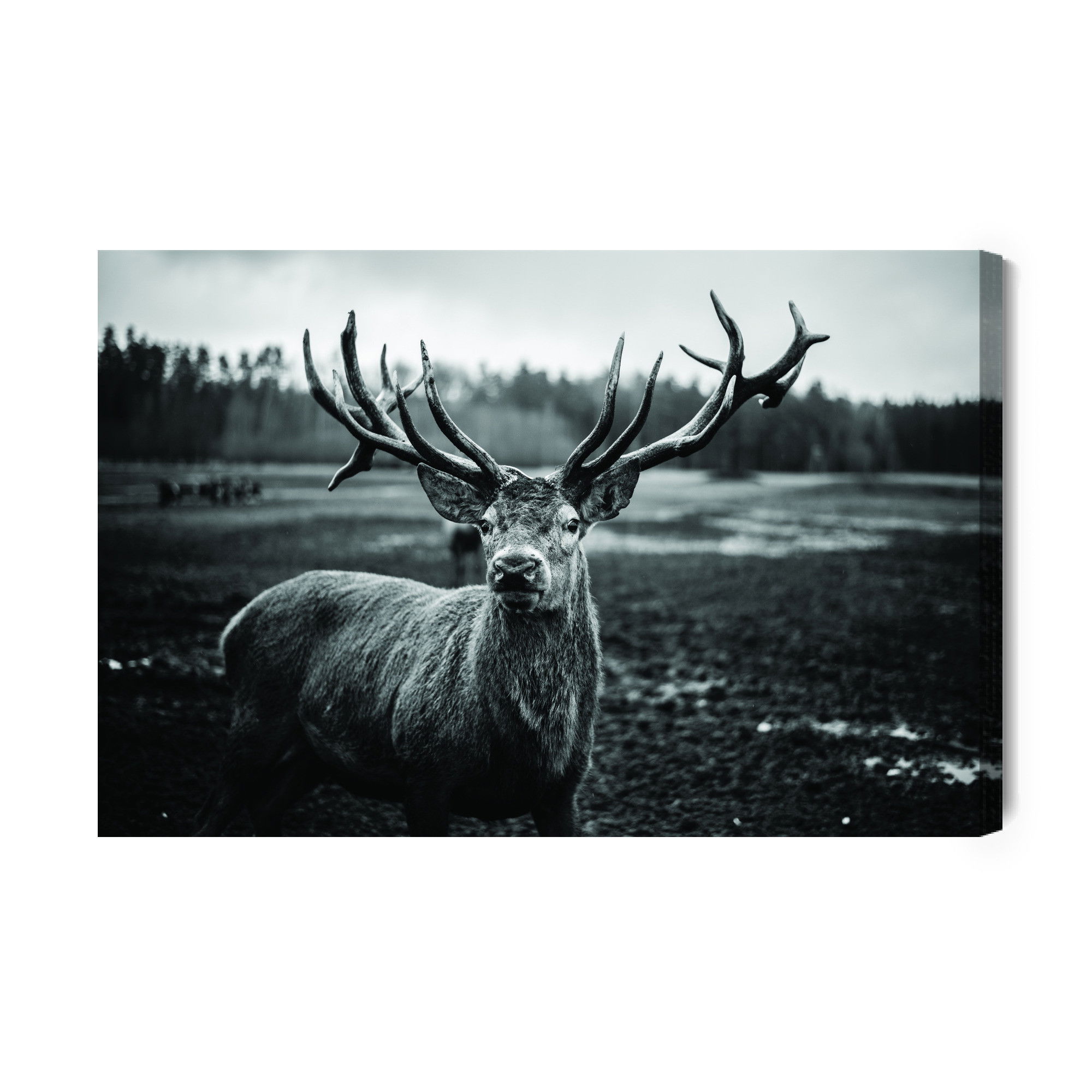 Varje tavla monteras på en massiv fururam. Format upp till 70×50 cm har en ram på 15 mm, medan format från 90×60 cm och uppåt har en ram på 20 mm. Den exakta dukspänningen gör att tavlan håller sin form över tid. Motivet Black and white deer trycks runt hela ramen vilket ger ett stilrent galleriuttryck där tavlan är lika vacker från sidan som framifrån. Kombinationen av rak dukspänning, rena linjer och korrekt tryck ger en professionell finish.