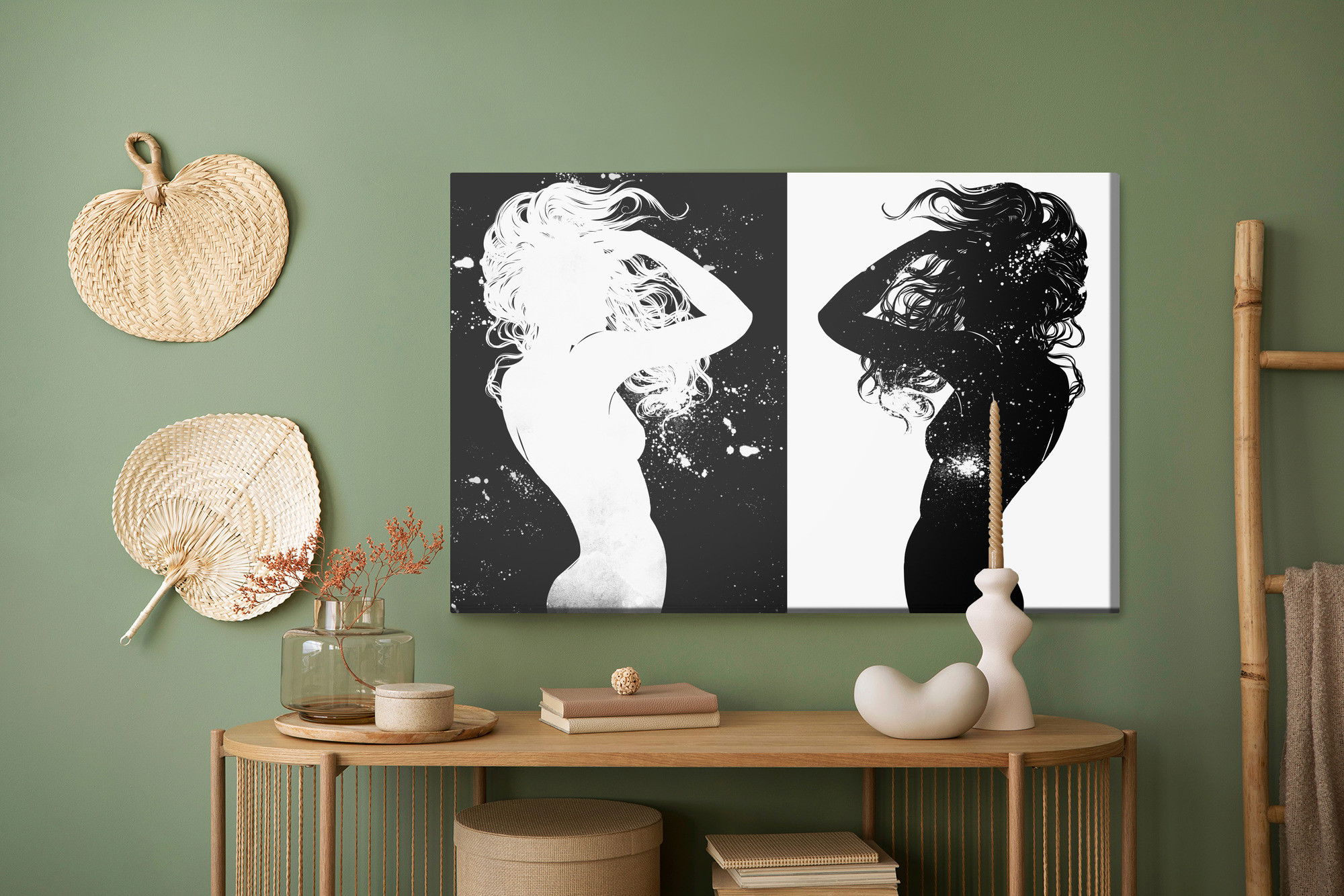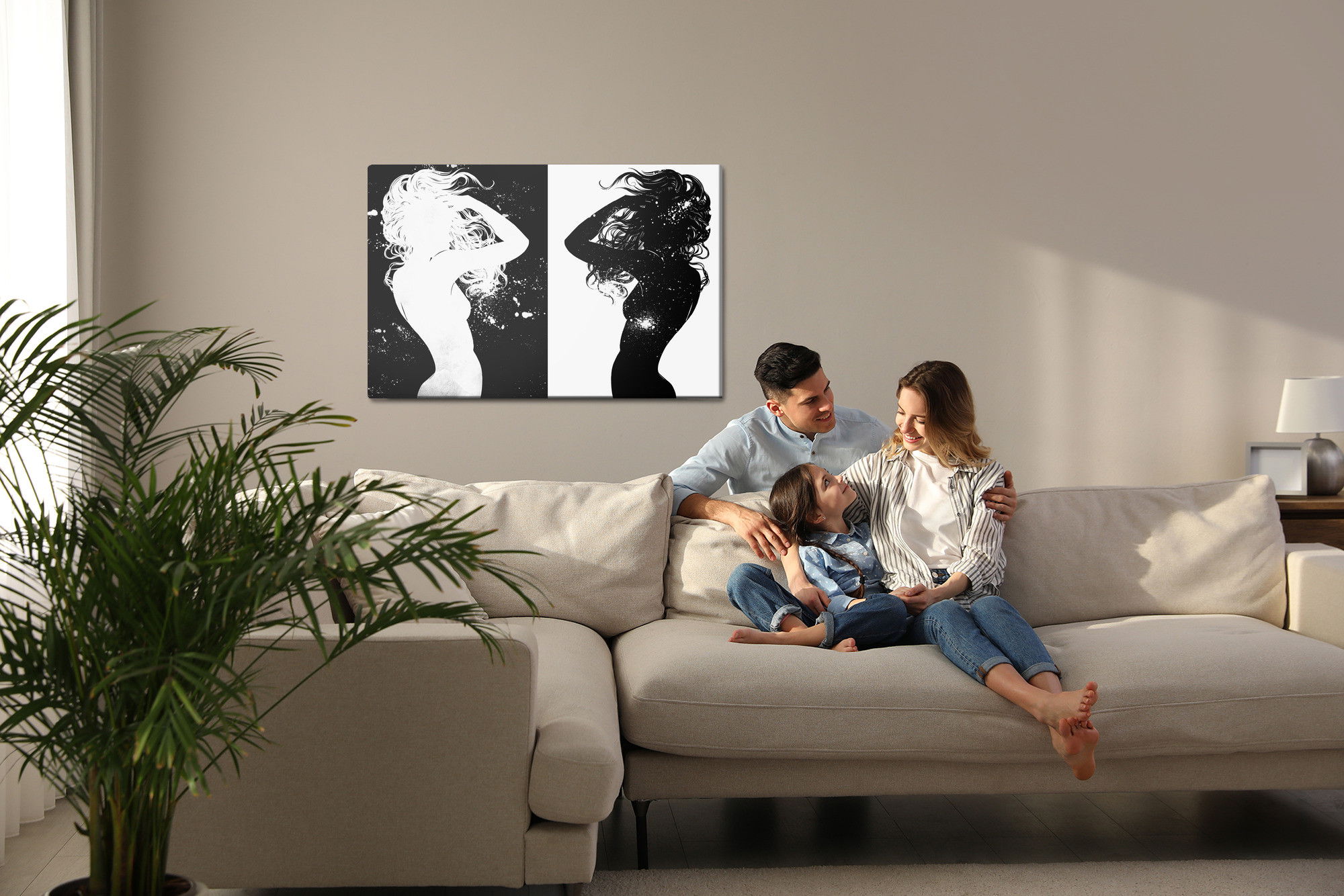 Varje tavla monteras på en massiv fururam. Format upp till 70×50 cm har en ram på 15 mm, medan format från 90×60 cm och uppåt har en ram på 20 mm. Den exakta dukspänningen gör att tavlan håller sin form över tid. Motivet Black and white female trycks runt hela ramen vilket ger ett stilrent galleriuttryck där tavlan är lika vacker från sidan som framifrån. Kombinationen av rak dukspänning, rena linjer och korrekt tryck ger en professionell finish.