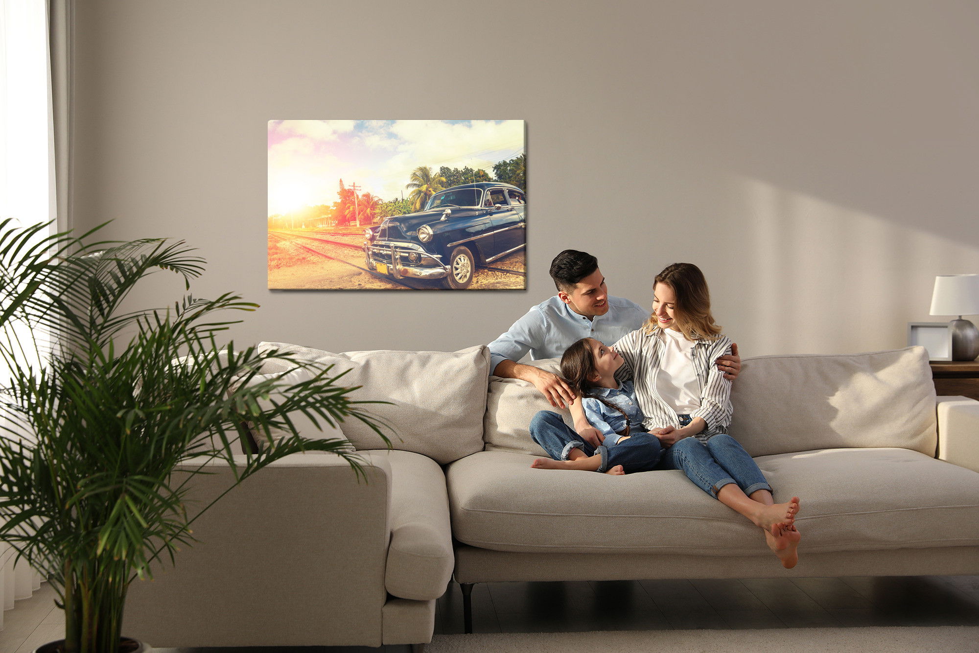 Varje tavla monteras på en massiv fururam. Format upp till 70×50 cm har en ram på 15 mm, medan format från 90×60 cm och uppåt har en ram på 20 mm. Den exakta dukspänningen gör att tavlan håller sin form över tid. Motivet Black car in retro style trycks runt hela ramen vilket ger ett stilrent galleriuttryck där tavlan är lika vacker från sidan som framifrån. Kombinationen av rak dukspänning, rena linjer och korrekt tryck ger en professionell finish.