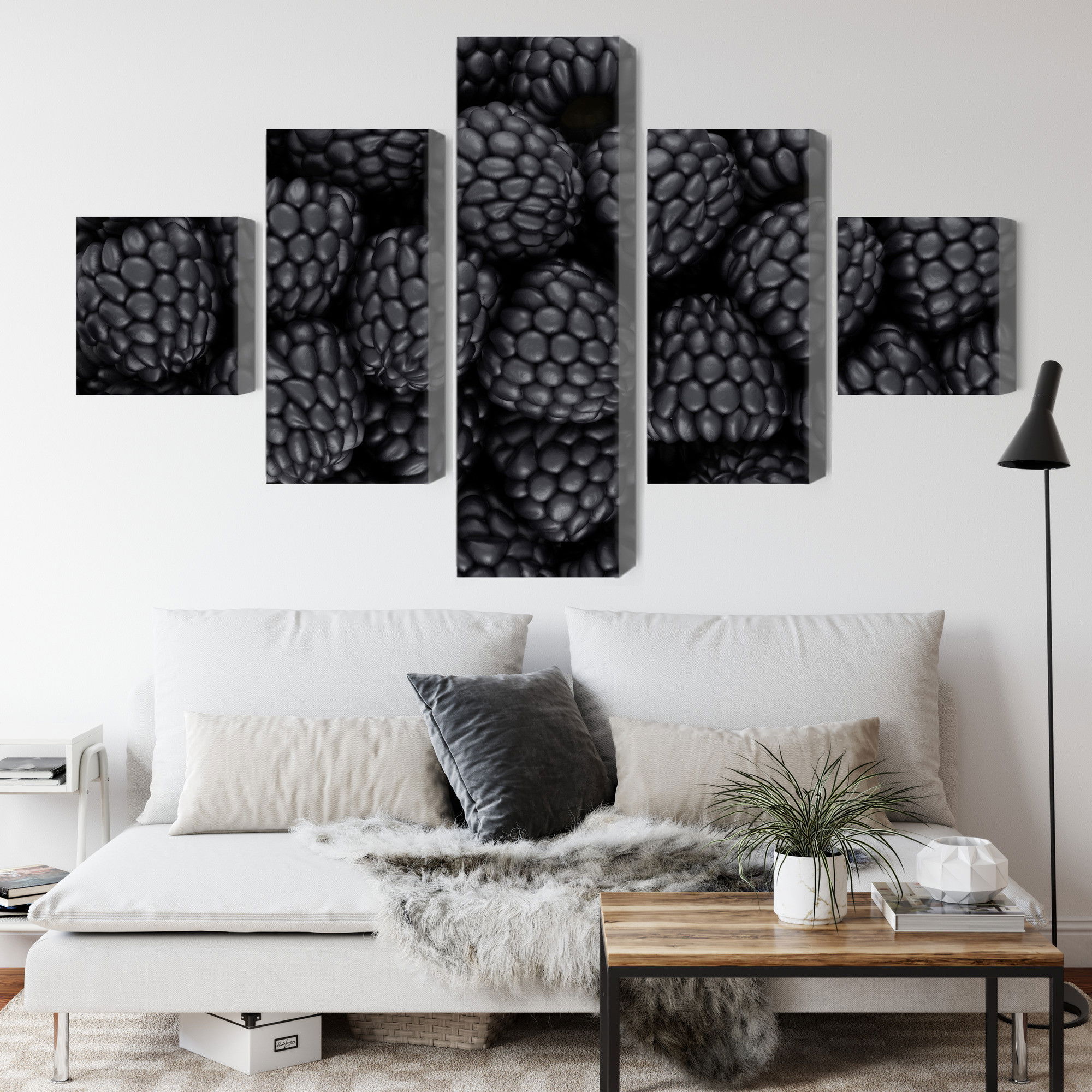 Med SilentDirects ljuddämpande tavla Blackberries on a macro scale får du både ett stilrent motiv och en akustisk lösning i samma produkt. Tavlan byggs i Sverige och utgår från en canvastavla med fururam som fylls med en återvunnen polyestercell för effektiv ljudabsorption.