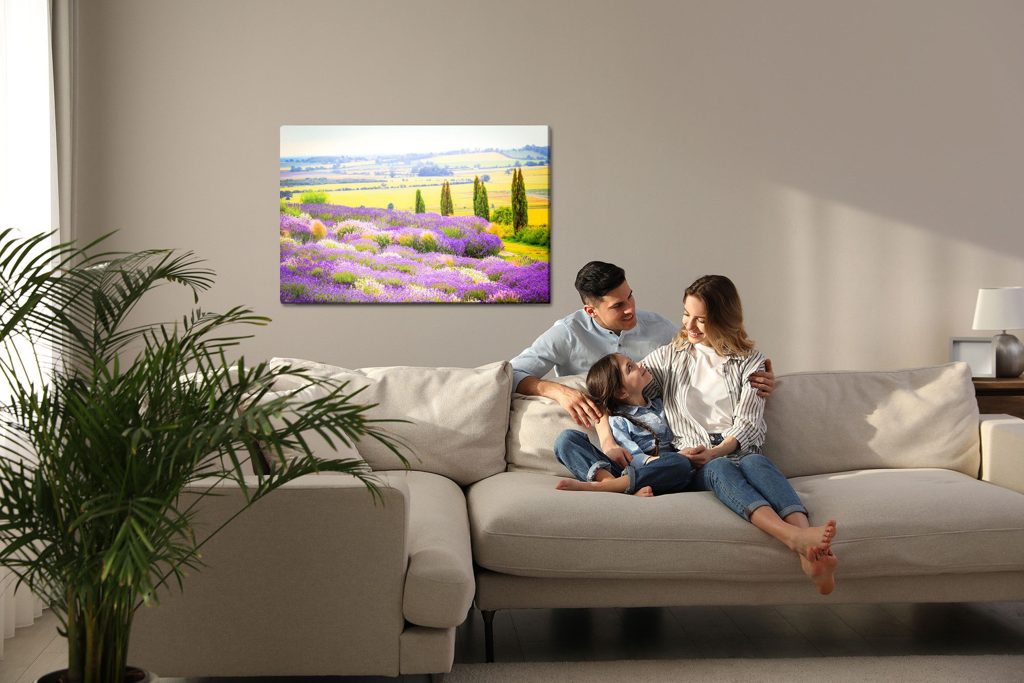 Varje tavla monteras på en massiv fururam. Format upp till 70×50 cm har en ram på 15 mm, medan format från 90×60 cm och uppåt har en ram på 20 mm. Den exakta dukspänningen gör att tavlan håller sin form över tid. Motivet Blooming lavender field trycks runt hela ramen vilket ger ett stilrent galleriuttryck där tavlan är lika vacker från sidan som framifrån. Kombinationen av rak dukspänning, rena linjer och korrekt tryck ger en professionell finish.