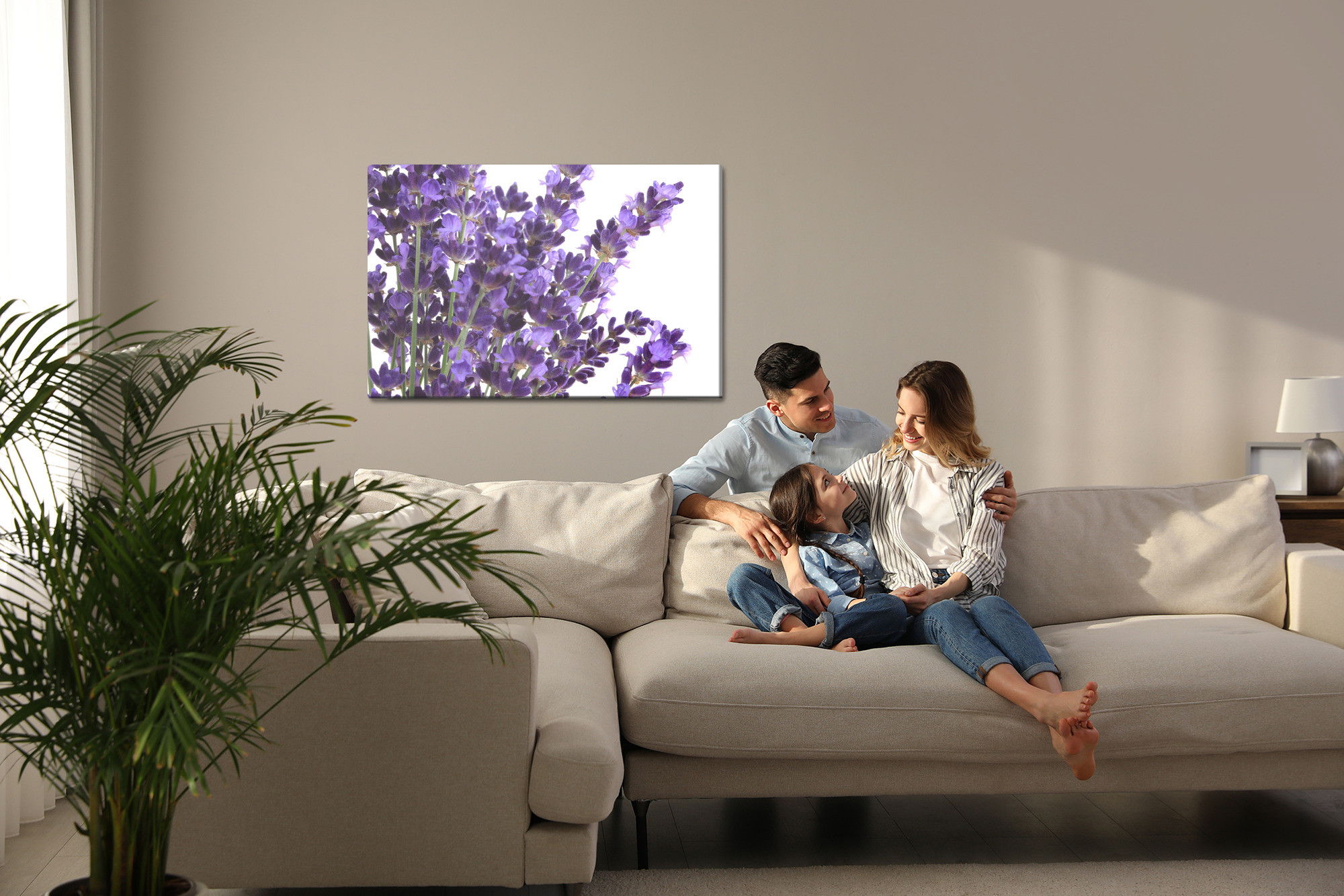 Motivet Blooming lavender flowers återges med hög färgprecision och detaljrikedom tack vare HP Latex-teknologi. Trycket sker med vattenbaserade, luktfria och GREENGUARD Gold-certifierade bläck som ger en upplösning på upp till 300 DPI. Färgerna är UV-beständiga och behåller sin styrka även i ljusa rum, vilket gör tavlan lämplig för både hem- och offentliga miljöer.