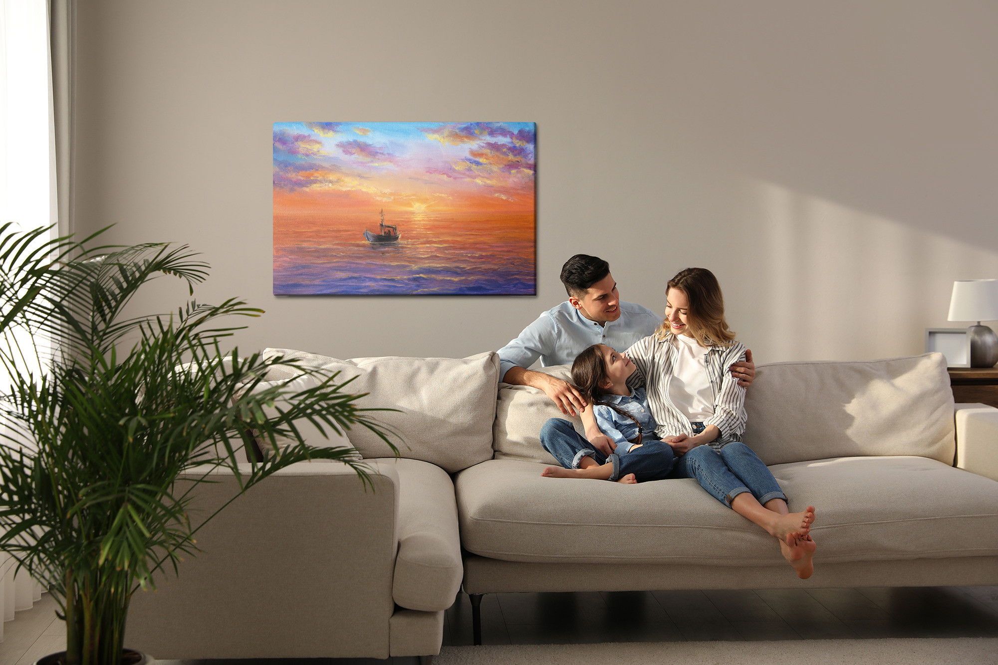 Varje tavla monteras på en massiv fururam. Format upp till 70×50 cm har en ram på 15 mm, medan format från 90×60 cm och uppåt har en ram på 20 mm. Den exakta dukspänningen gör att tavlan håller sin form över tid. Motivet Boat on the sea trycks runt hela ramen vilket ger ett stilrent galleriuttryck där tavlan är lika vacker från sidan som framifrån. Kombinationen av rak dukspänning, rena linjer och korrekt tryck ger en professionell finish.