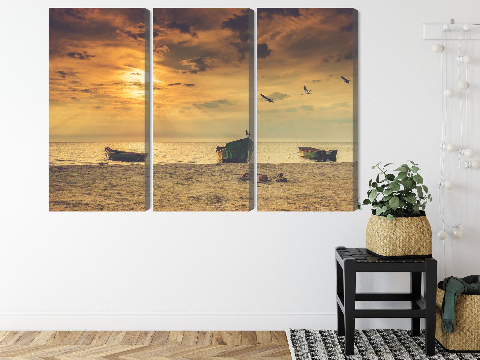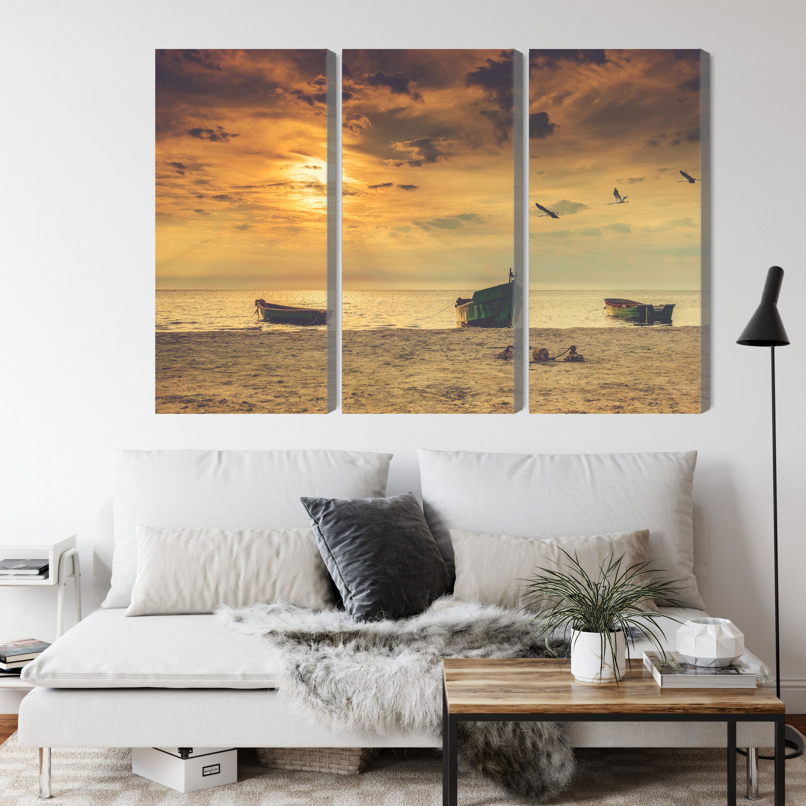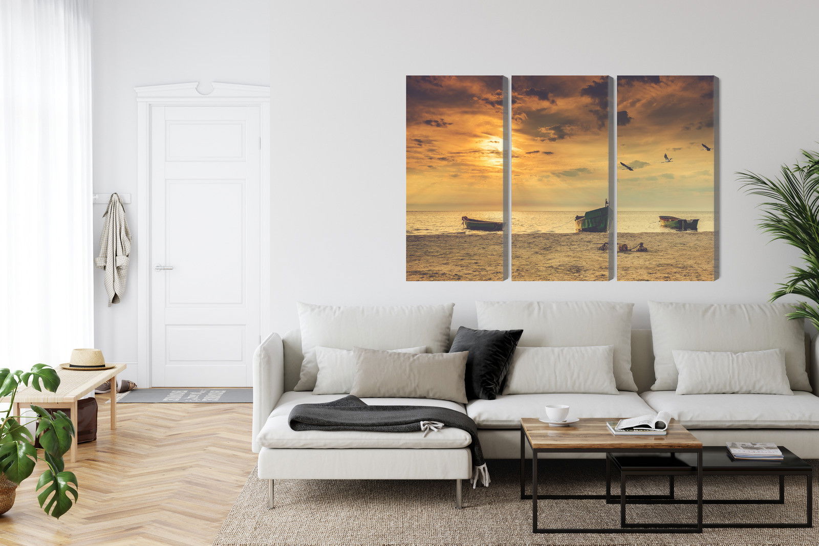 Ljuddämpande tavla – Boats on the beach at sunset för lugnare rum och mjukare akustik