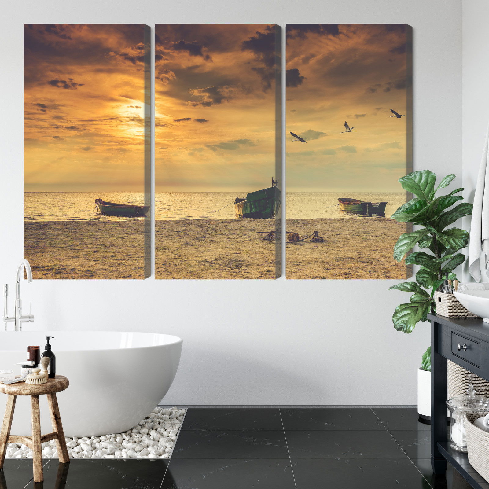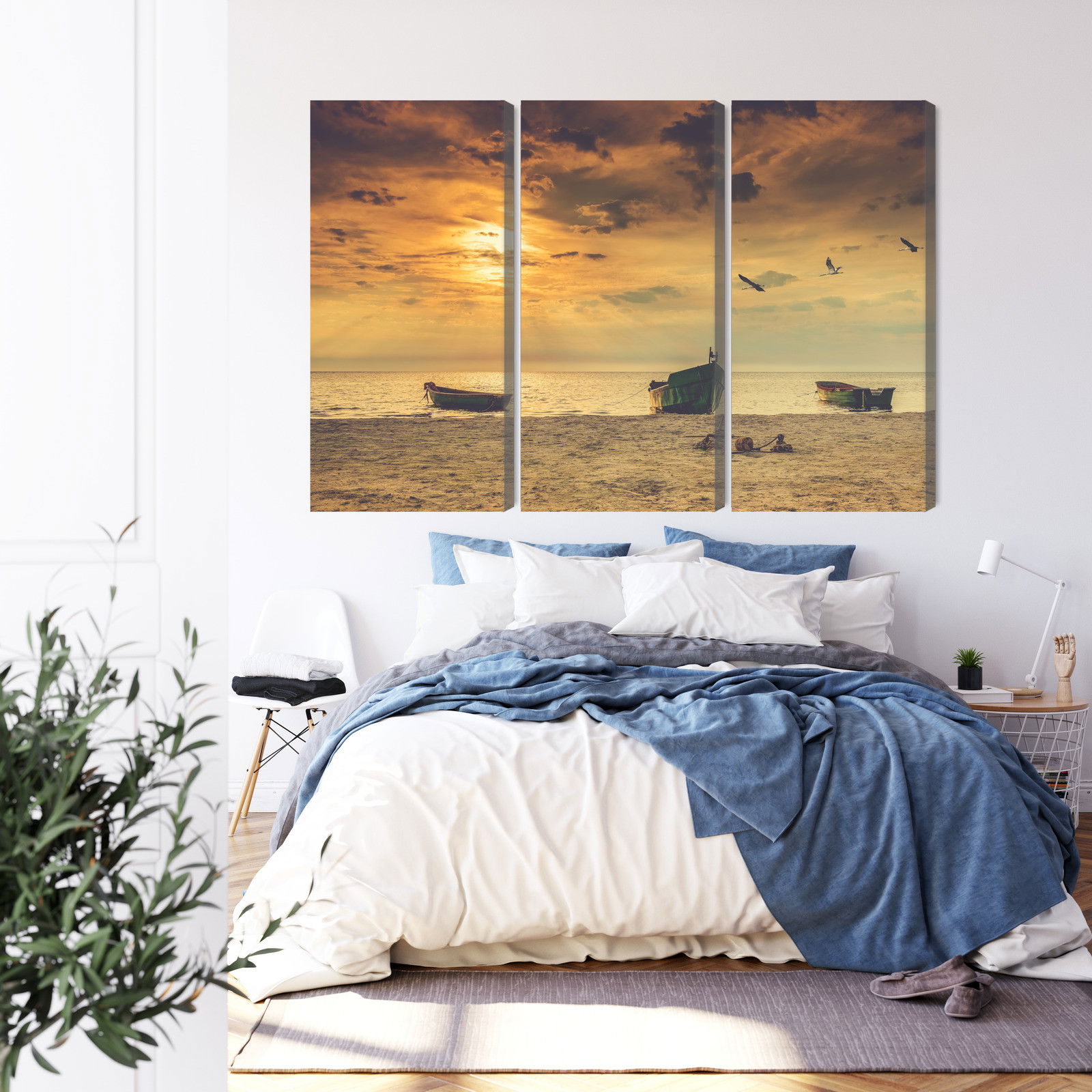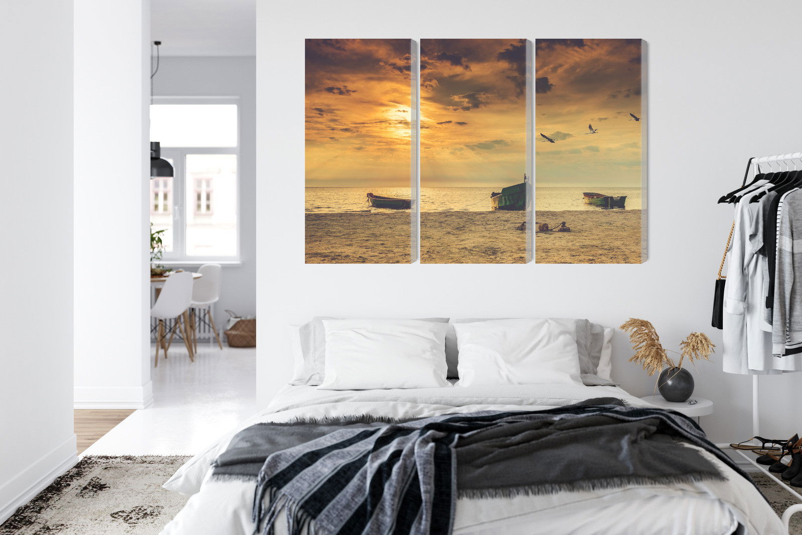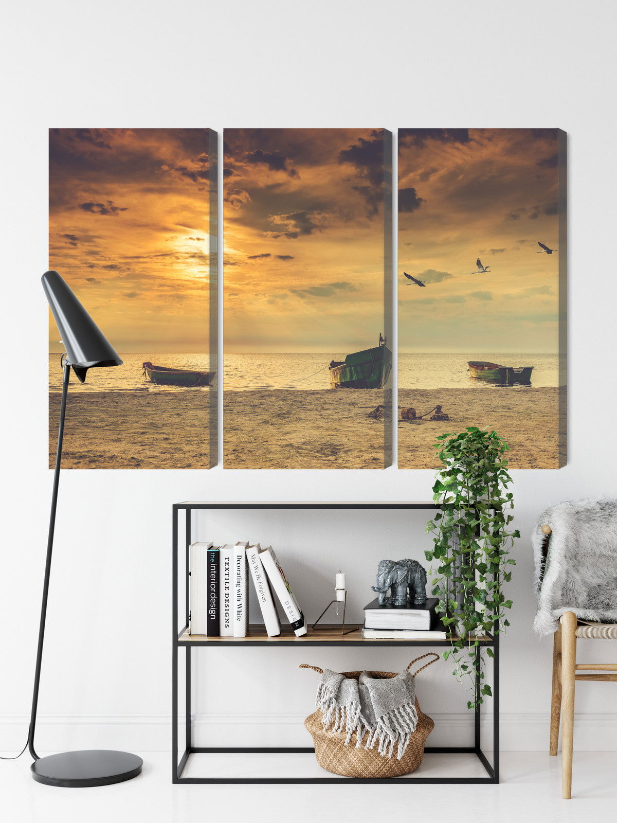 Ljuddämpande tavla – Boats on the beach at sunset för lugnare rum och mjukare akustik