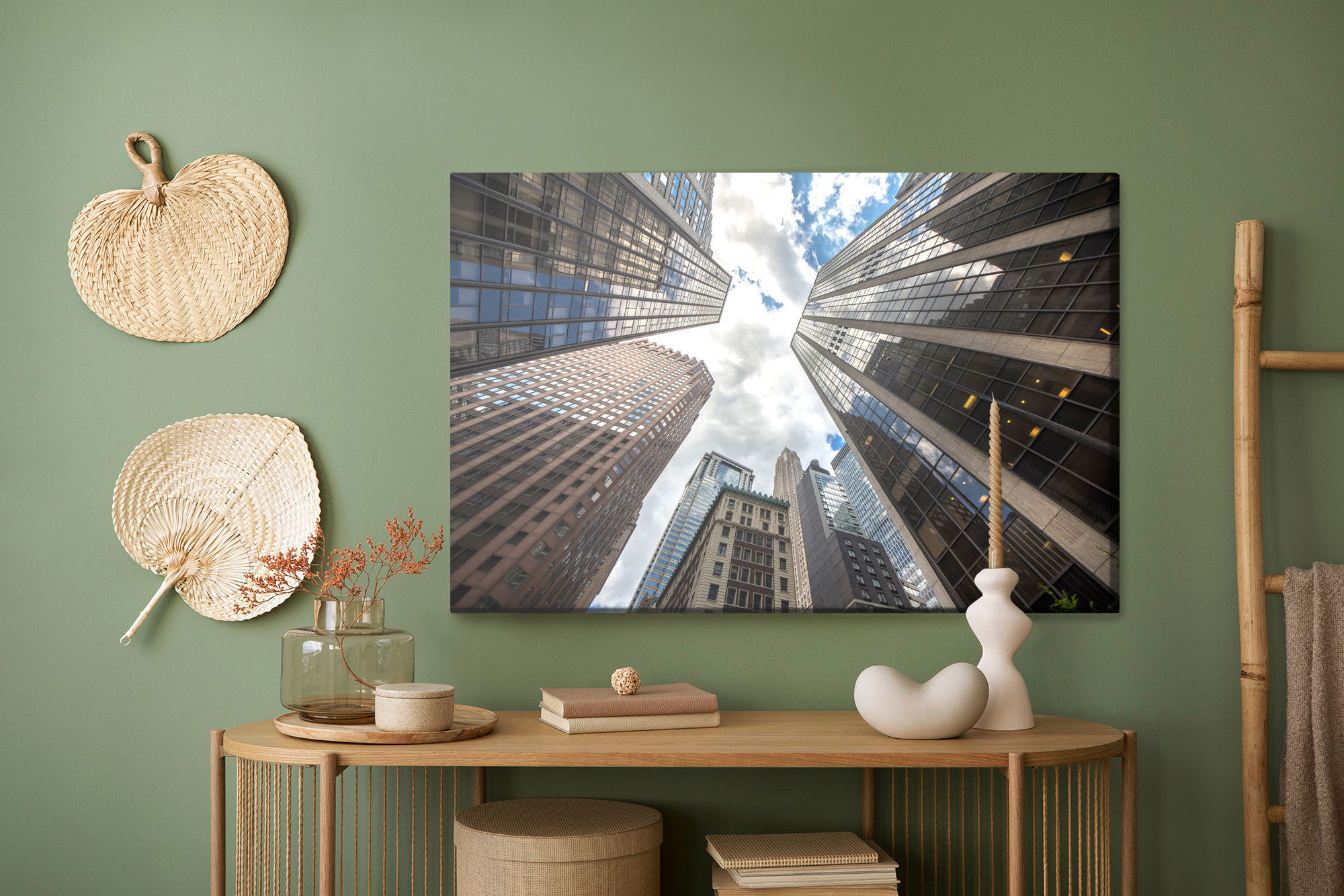Motivet Bottom view of New York återges med hög färgprecision och detaljrikedom tack vare HP Latex-teknologi. Trycket sker med vattenbaserade, luktfria och GREENGUARD Gold-certifierade bläck som ger en upplösning på upp till 300 DPI. Färgerna är UV-beständiga och behåller sin styrka även i ljusa rum, vilket gör tavlan lämplig för både hem- och offentliga miljöer.