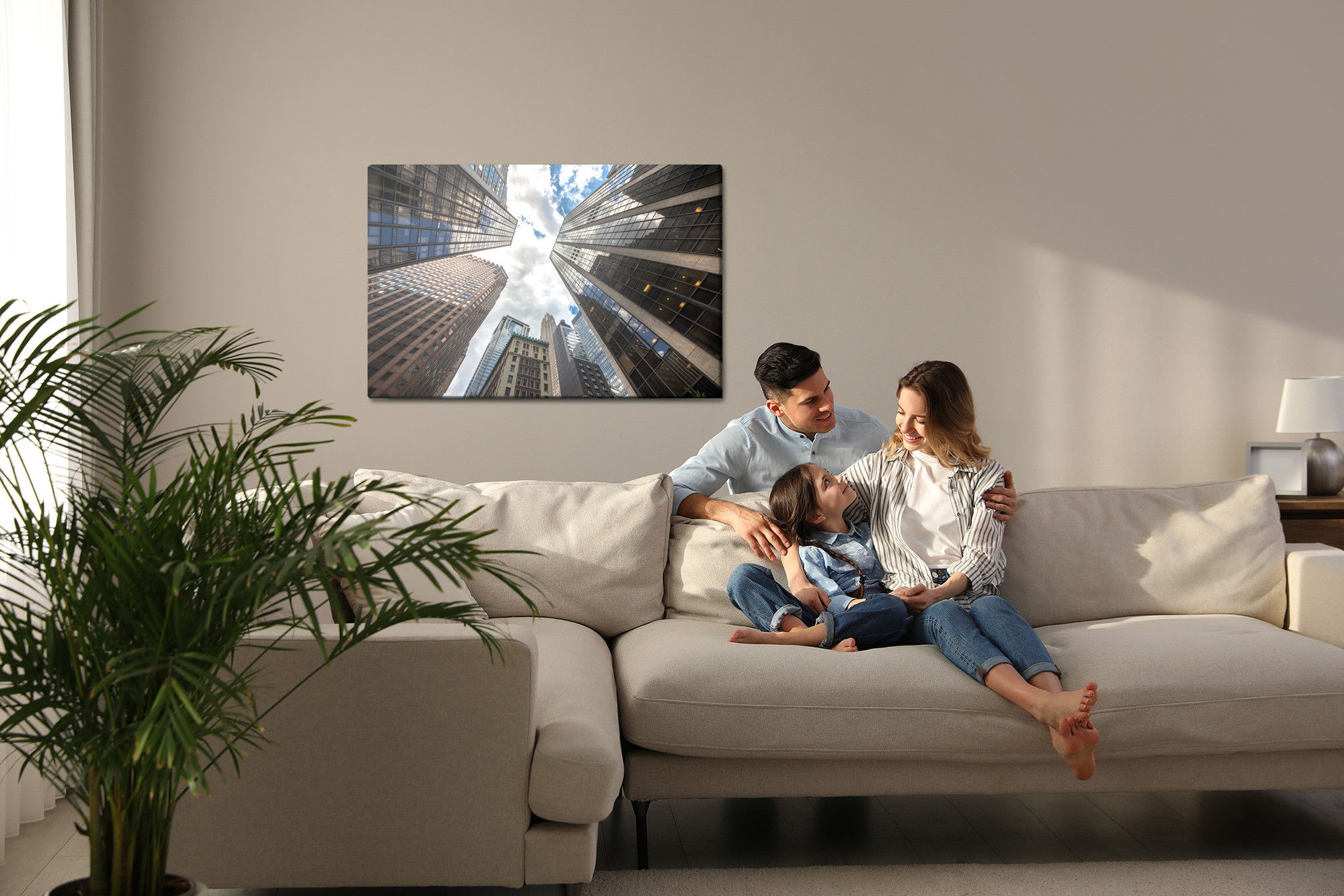 Varje tavla monteras på en massiv fururam. Format upp till 70×50 cm har en ram på 15 mm, medan format från 90×60 cm och uppåt har en ram på 20 mm. Den exakta dukspänningen gör att tavlan håller sin form över tid. Motivet Bottom view of New York trycks runt hela ramen vilket ger ett stilrent galleriuttryck där tavlan är lika vacker från sidan som framifrån. Kombinationen av rak dukspänning, rena linjer och korrekt tryck ger en professionell finish.