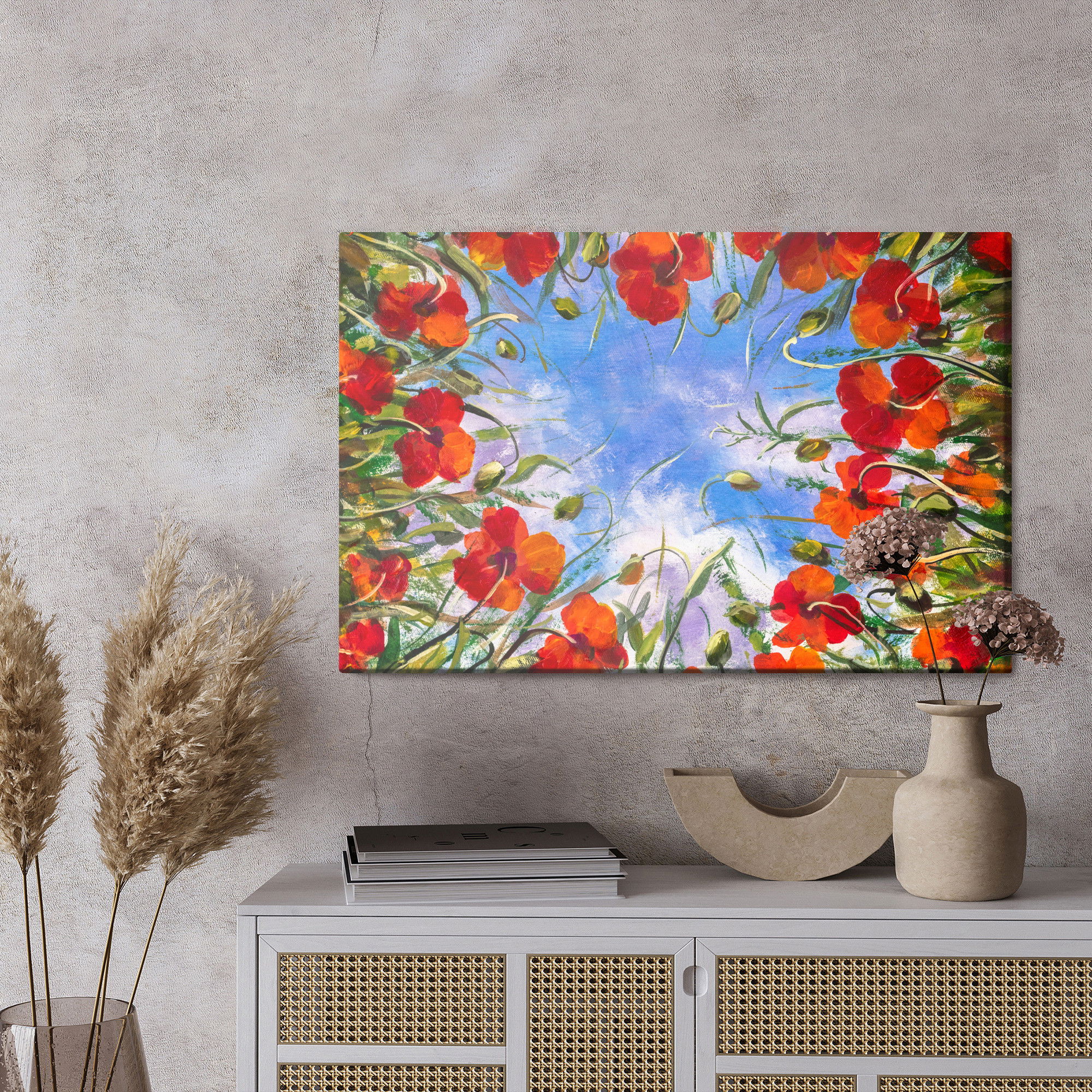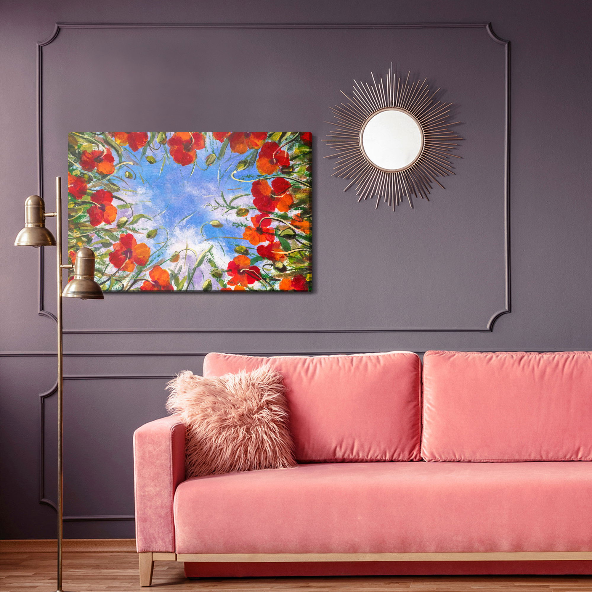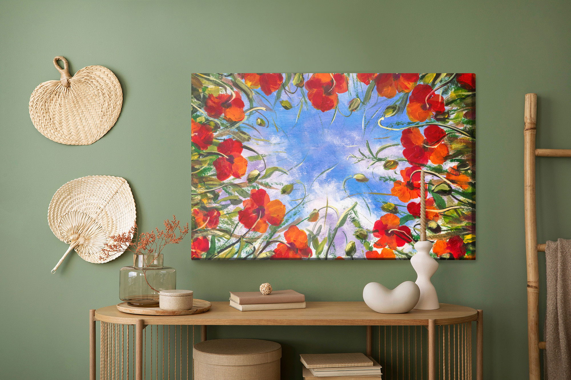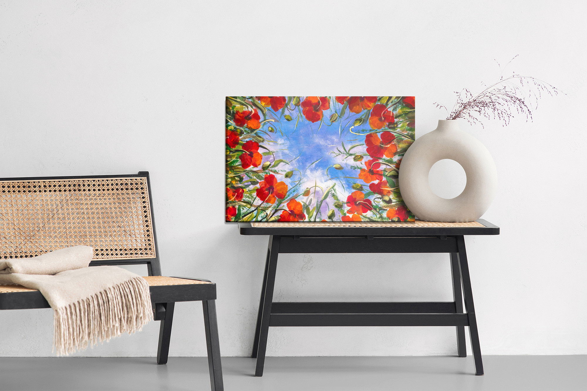 Motivet Bottom view of painted red återges med hög färgprecision och detaljrikedom tack vare HP Latex-teknologi. Trycket sker med vattenbaserade, luktfria och GREENGUARD Gold-certifierade bläck som ger en upplösning på upp till 300 DPI. Färgerna är UV-beständiga och behåller sin styrka även i ljusa rum, vilket gör tavlan lämplig för både hem- och offentliga miljöer.