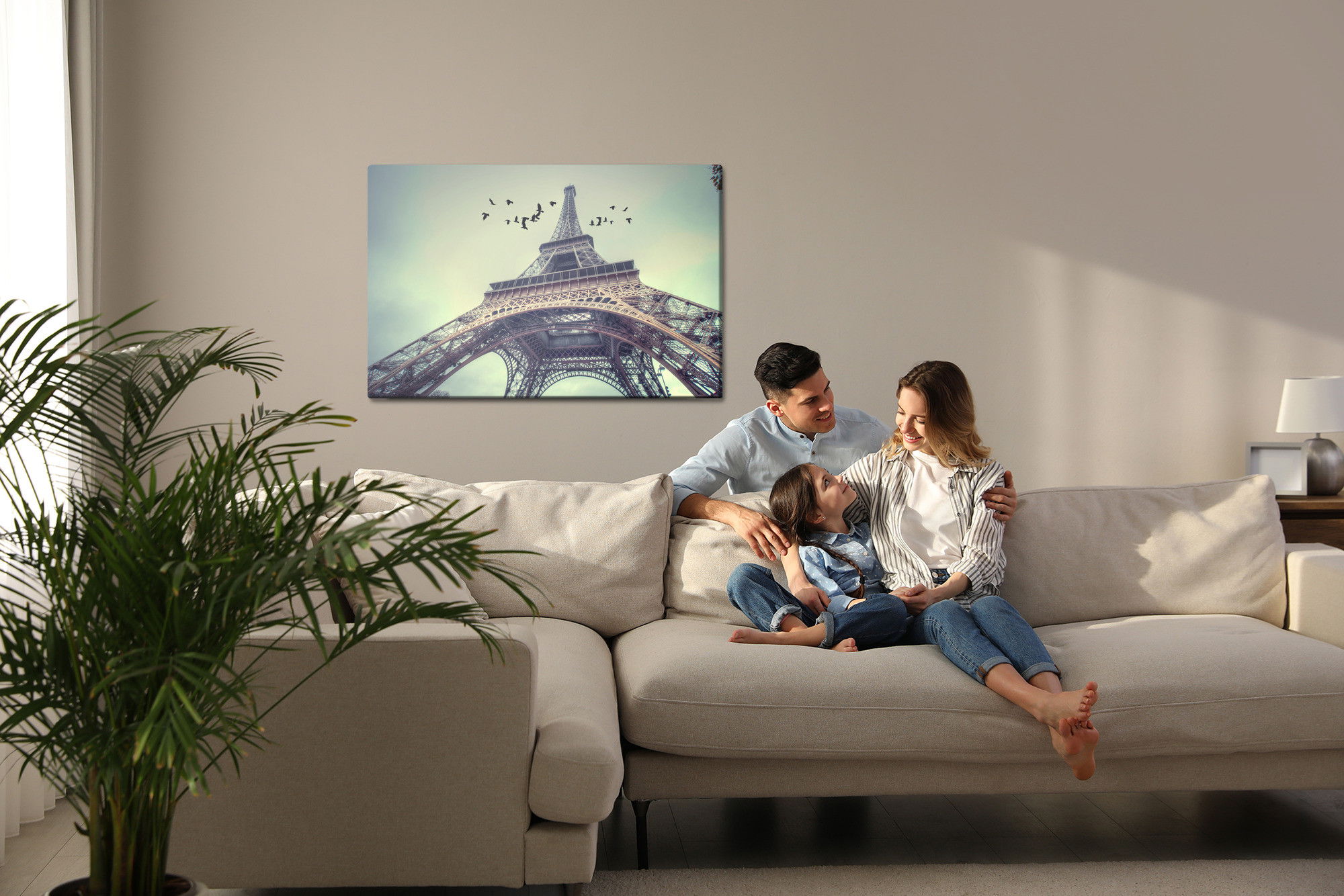 Varje tavla monteras på en massiv fururam. Format upp till 70×50 cm har en ram på 15 mm, medan format från 90×60 cm och uppåt har en ram på 20 mm. Den exakta dukspänningen gör att tavlan håller sin form över tid. Motivet Bottom view of the eiffel trycks runt hela ramen vilket ger ett stilrent galleriuttryck där tavlan är lika vacker från sidan som framifrån. Kombinationen av rak dukspänning, rena linjer och korrekt tryck ger en professionell finish.