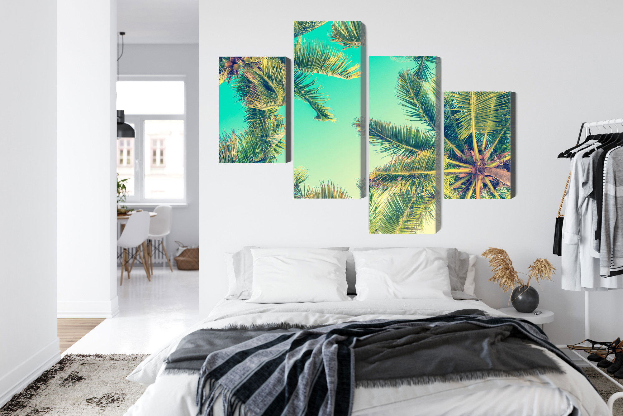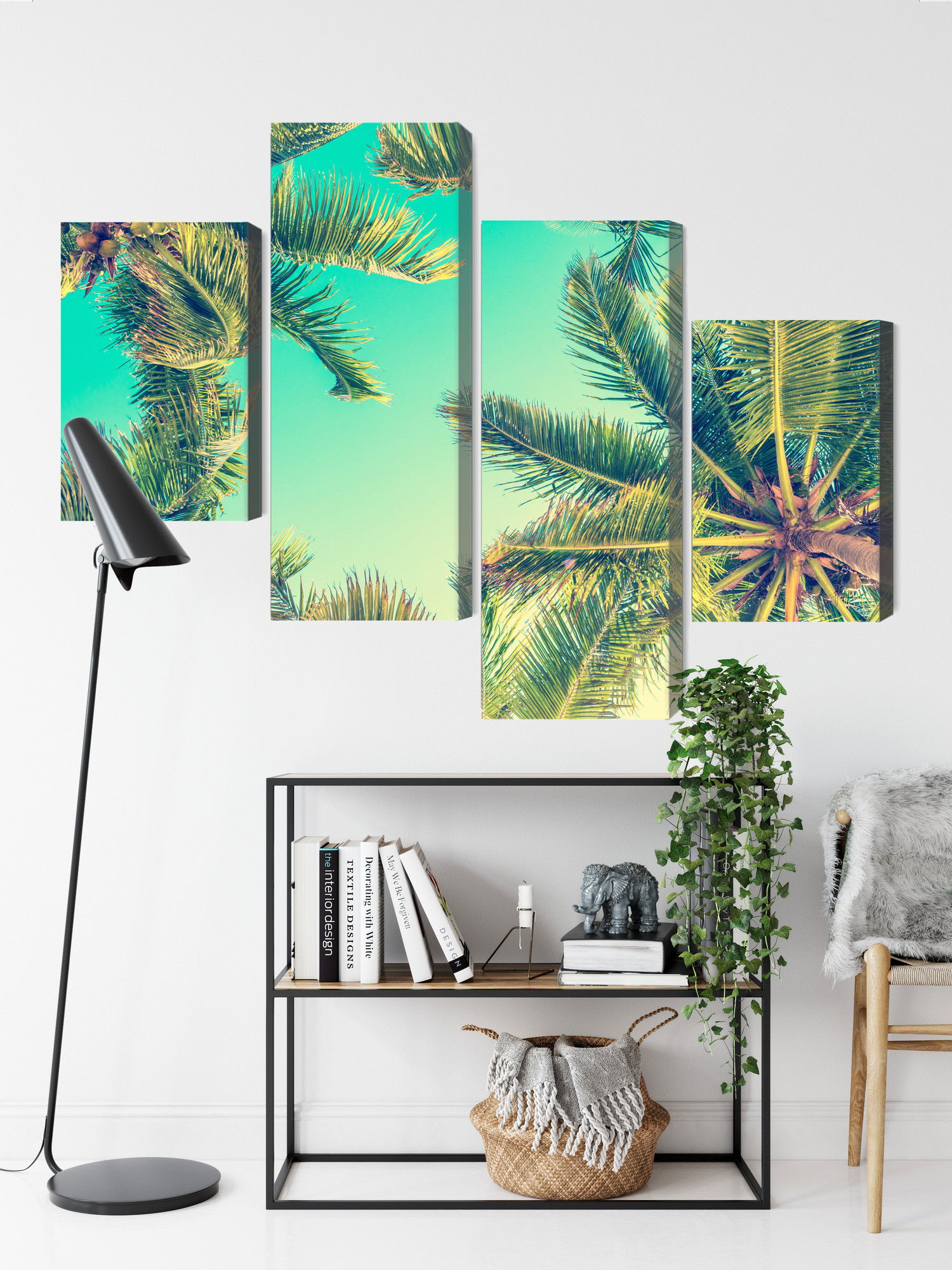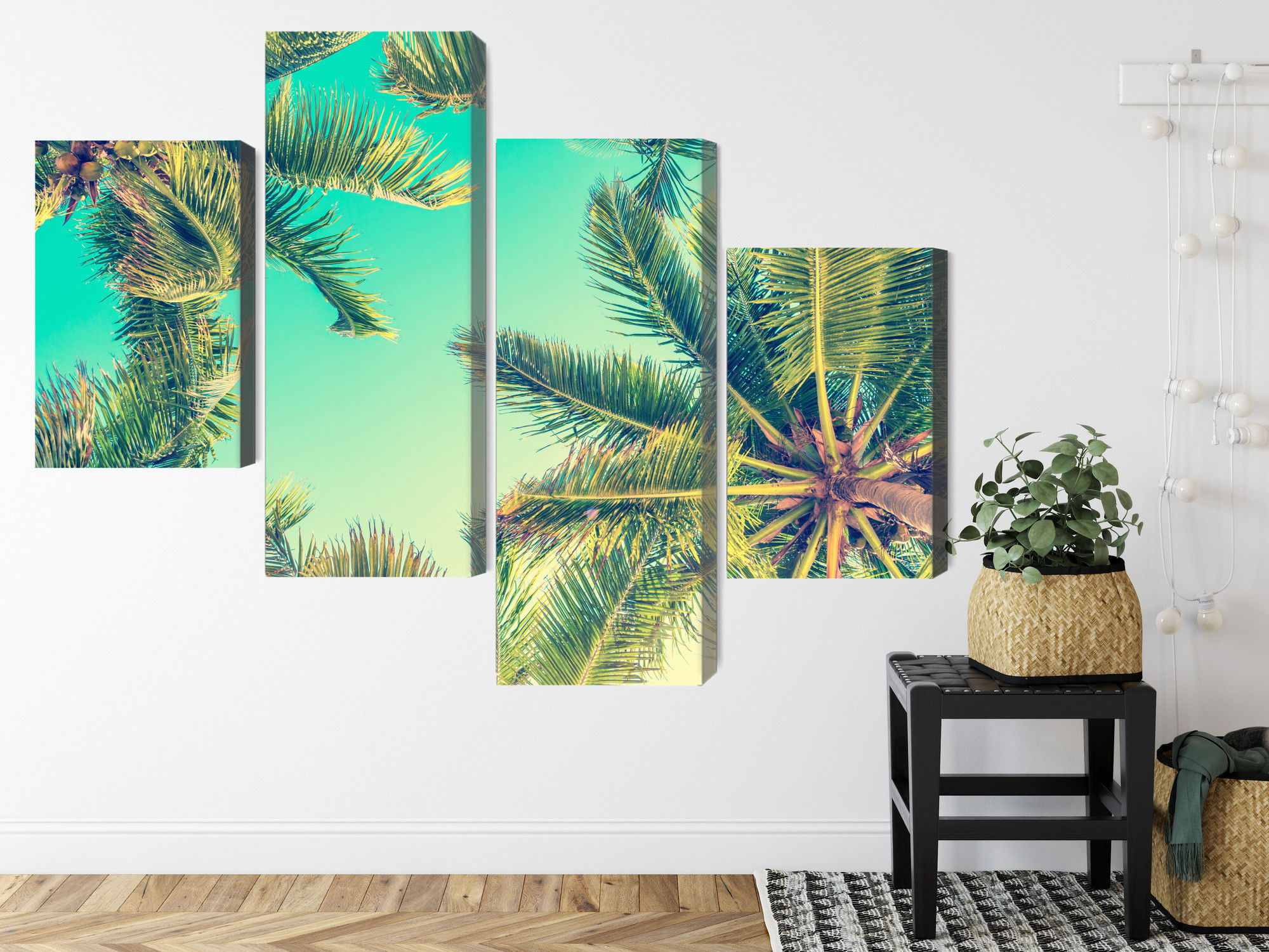Motivet Bottom view of the palm trees återges med hög färgprecision och detaljrikedom tack vare HP Latex-teknologi. Trycket sker med vattenbaserade, luktfria och GREENGUARD Gold-certifierade bläck som ger en upplösning på upp till 300 DPI. Färgerna är UV-beständiga och behåller sin styrka även i ljusa rum, vilket gör tavlan lämplig för både hem- och offentliga miljöer.