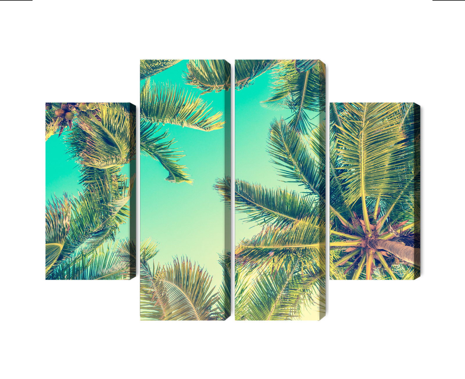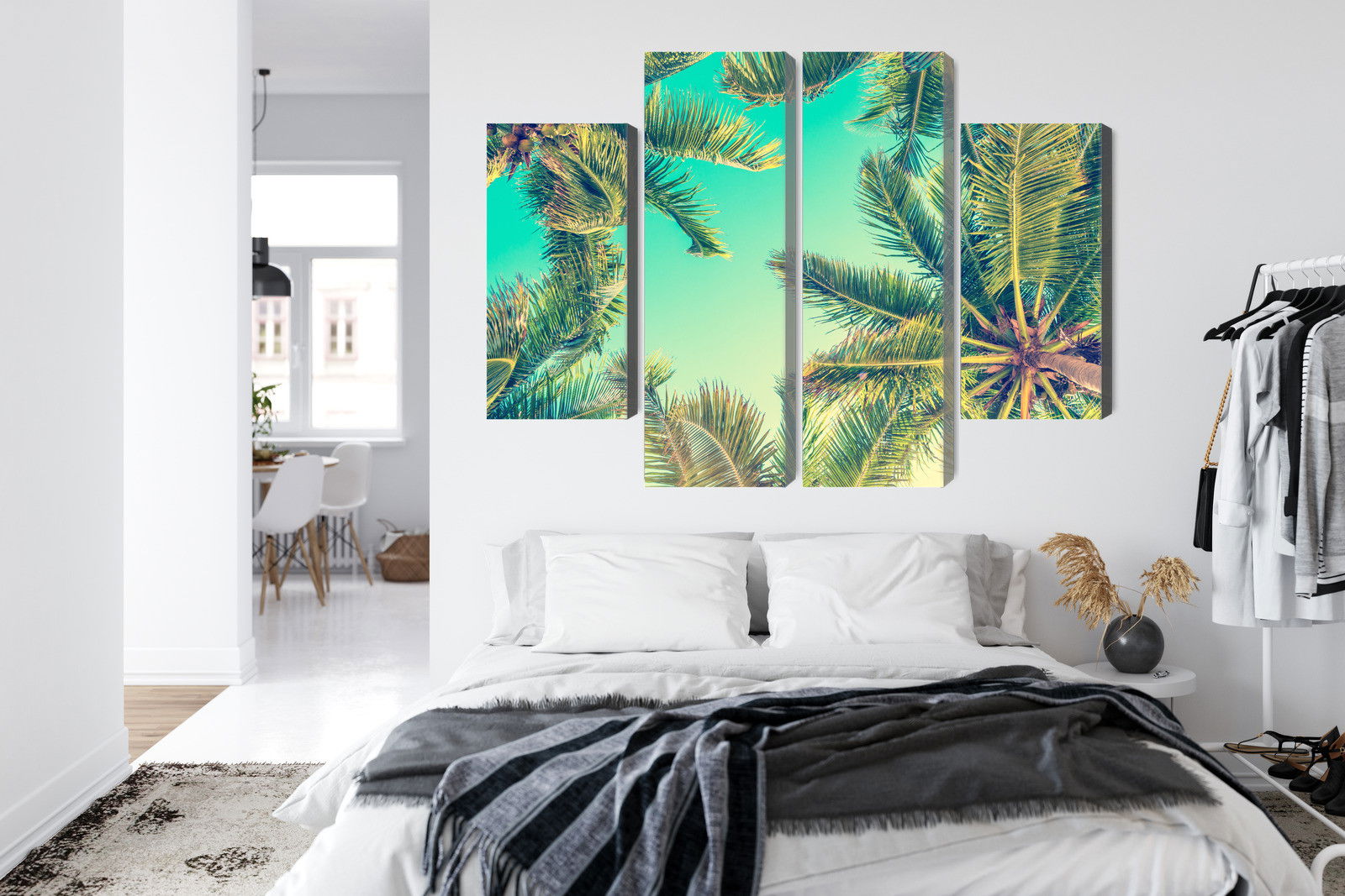 Motivet Bottom view of the palm trees återges med hög färgprecision och detaljrikedom tack vare HP Latex-teknologi. Trycket sker med vattenbaserade, luktfria och GREENGUARD Gold-certifierade bläck som ger en upplösning på upp till 300 DPI. Färgerna är UV-beständiga och behåller sin styrka även i ljusa rum, vilket gör tavlan lämplig för både hem- och offentliga miljöer.