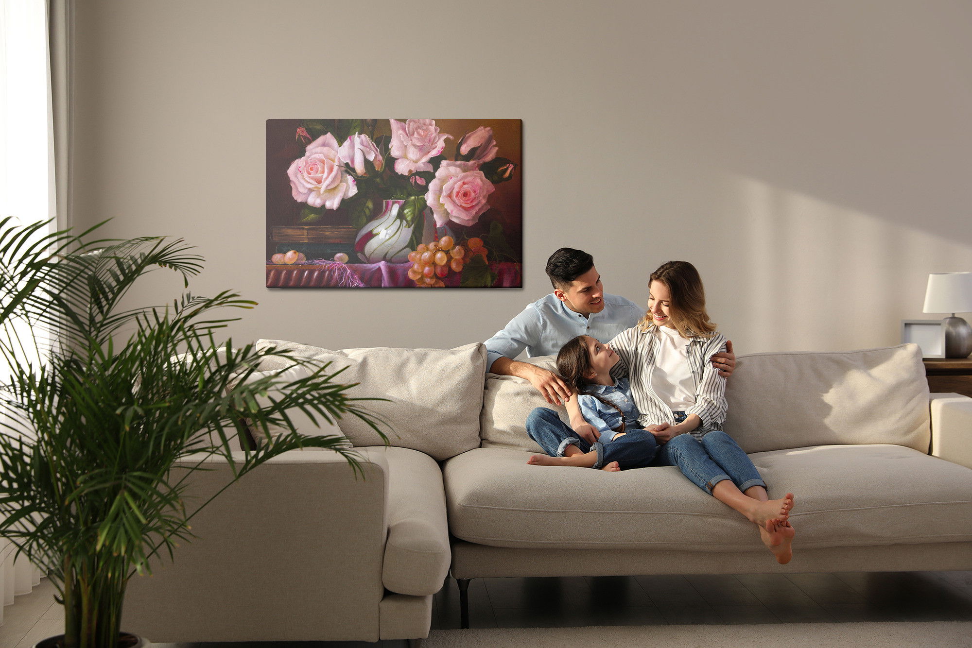 Motivet Bouquet of roses in a vase återges med hög färgprecision och detaljrikedom tack vare HP Latex-teknologi. Trycket sker med vattenbaserade, luktfria och GREENGUARD Gold-certifierade bläck som ger en upplösning på upp till 300 DPI. Färgerna är UV-beständiga och behåller sin styrka även i ljusa rum, vilket gör tavlan lämplig för både hem- och offentliga miljöer.