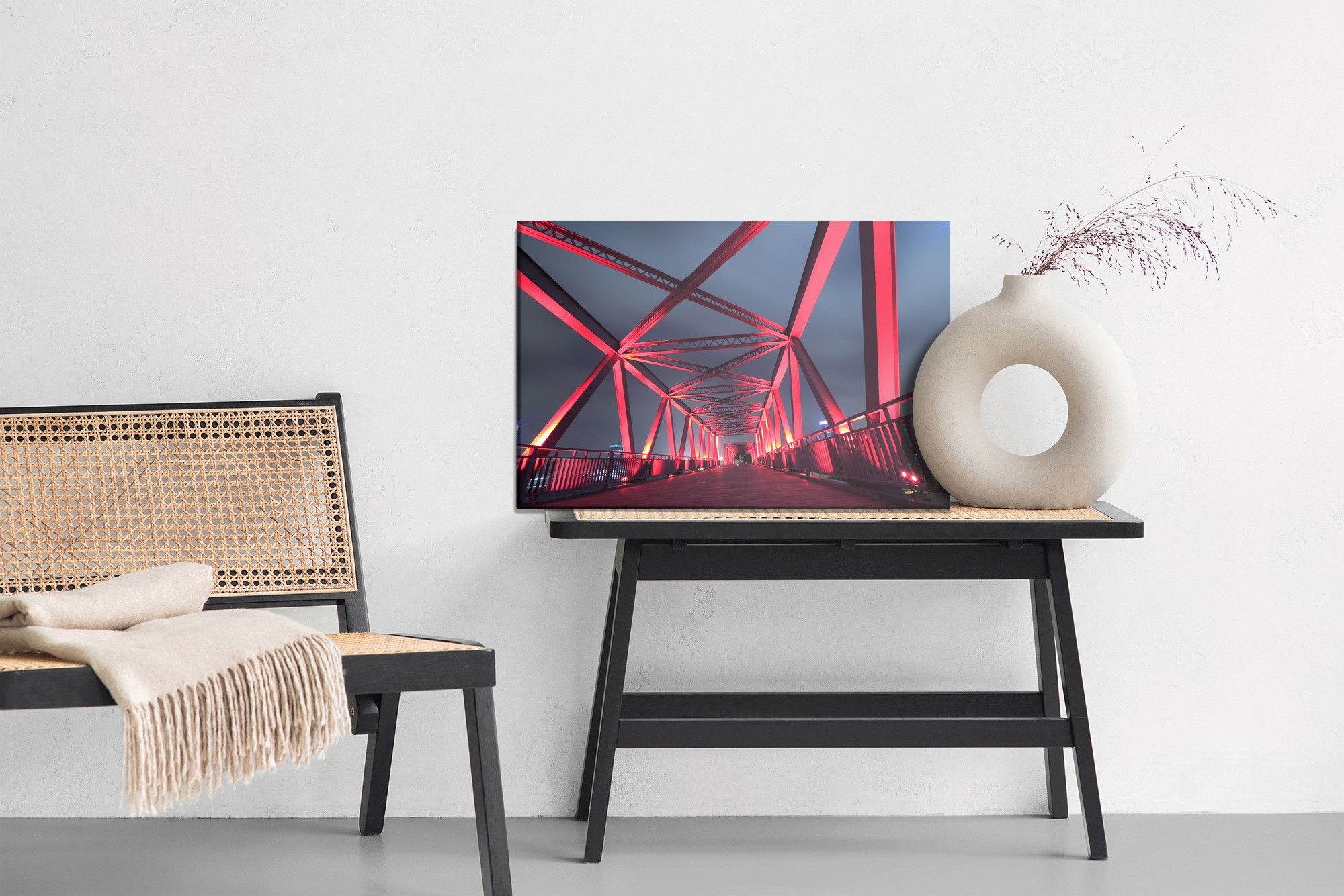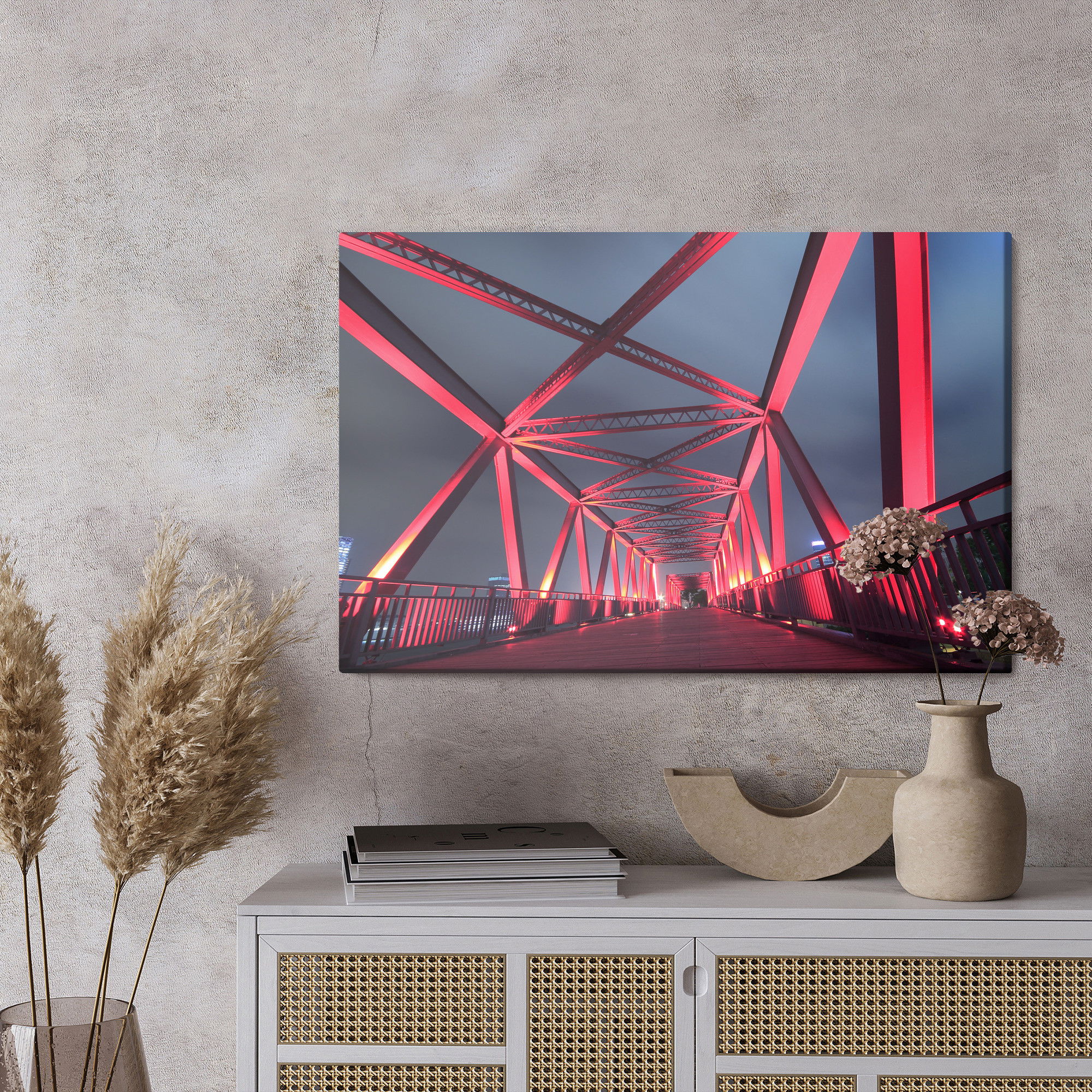 Varje tavla monteras på en massiv fururam. Format upp till 70×50 cm har en ram på 15 mm, medan format från 90×60 cm och uppåt har en ram på 20 mm. Den exakta dukspänningen gör att tavlan håller sin form över tid. Motivet Bridge at night trycks runt hela ramen vilket ger ett stilrent galleriuttryck där tavlan är lika vacker från sidan som framifrån. Kombinationen av rak dukspänning, rena linjer och korrekt tryck ger en professionell finish.