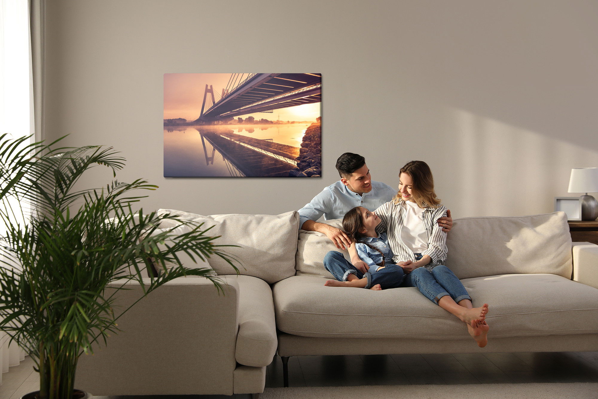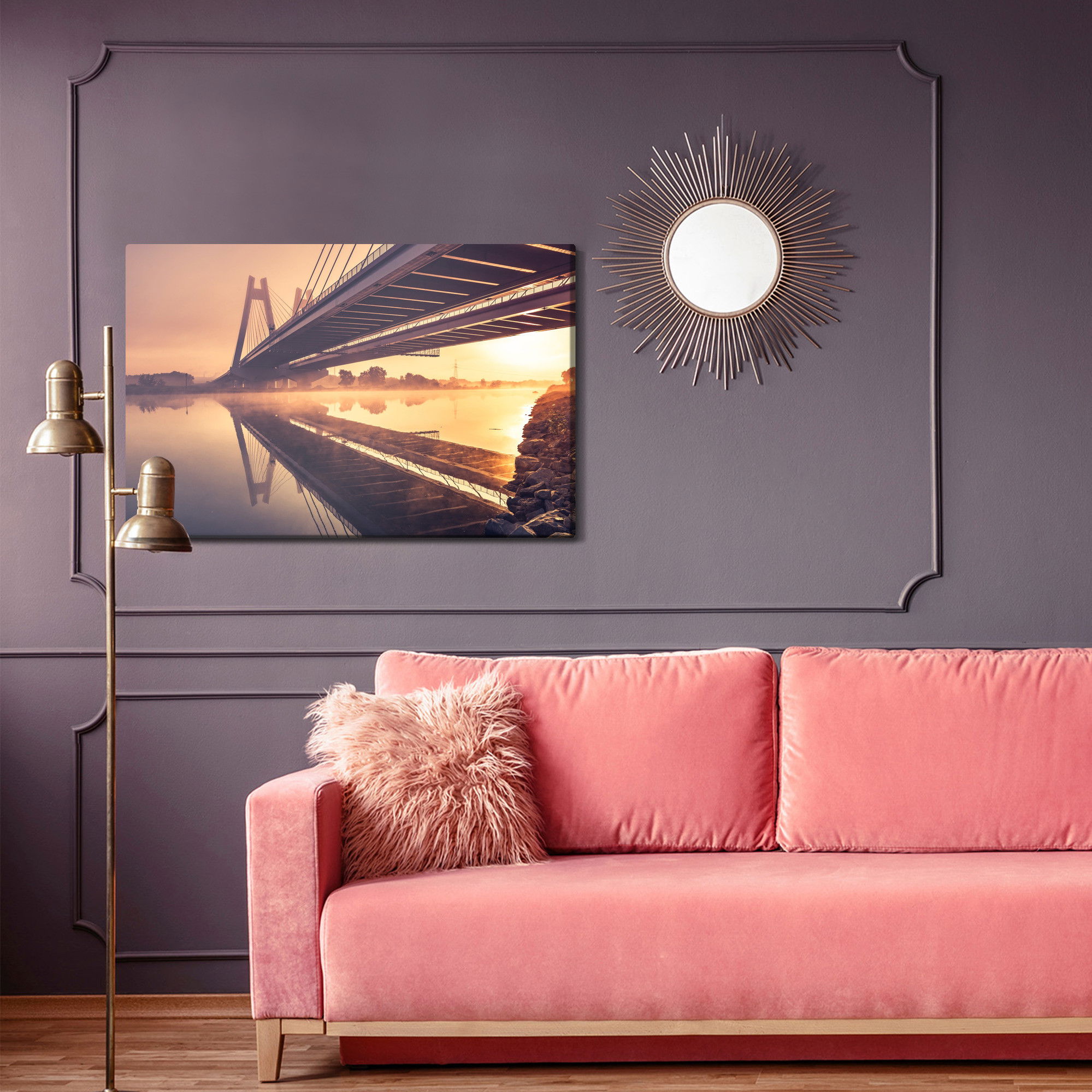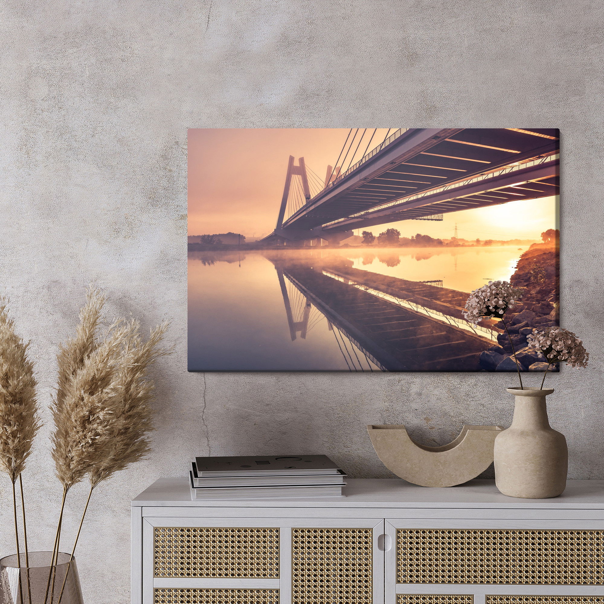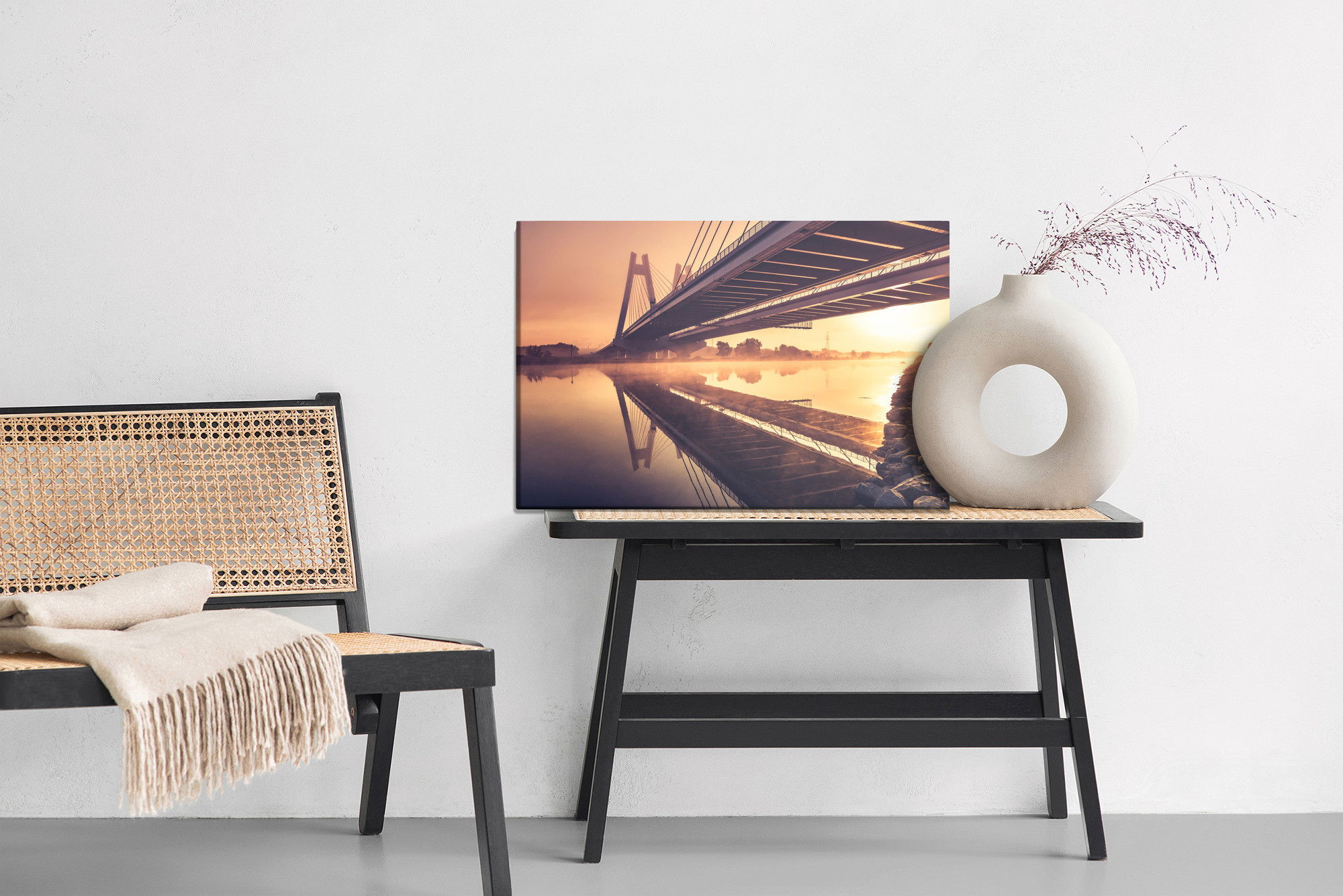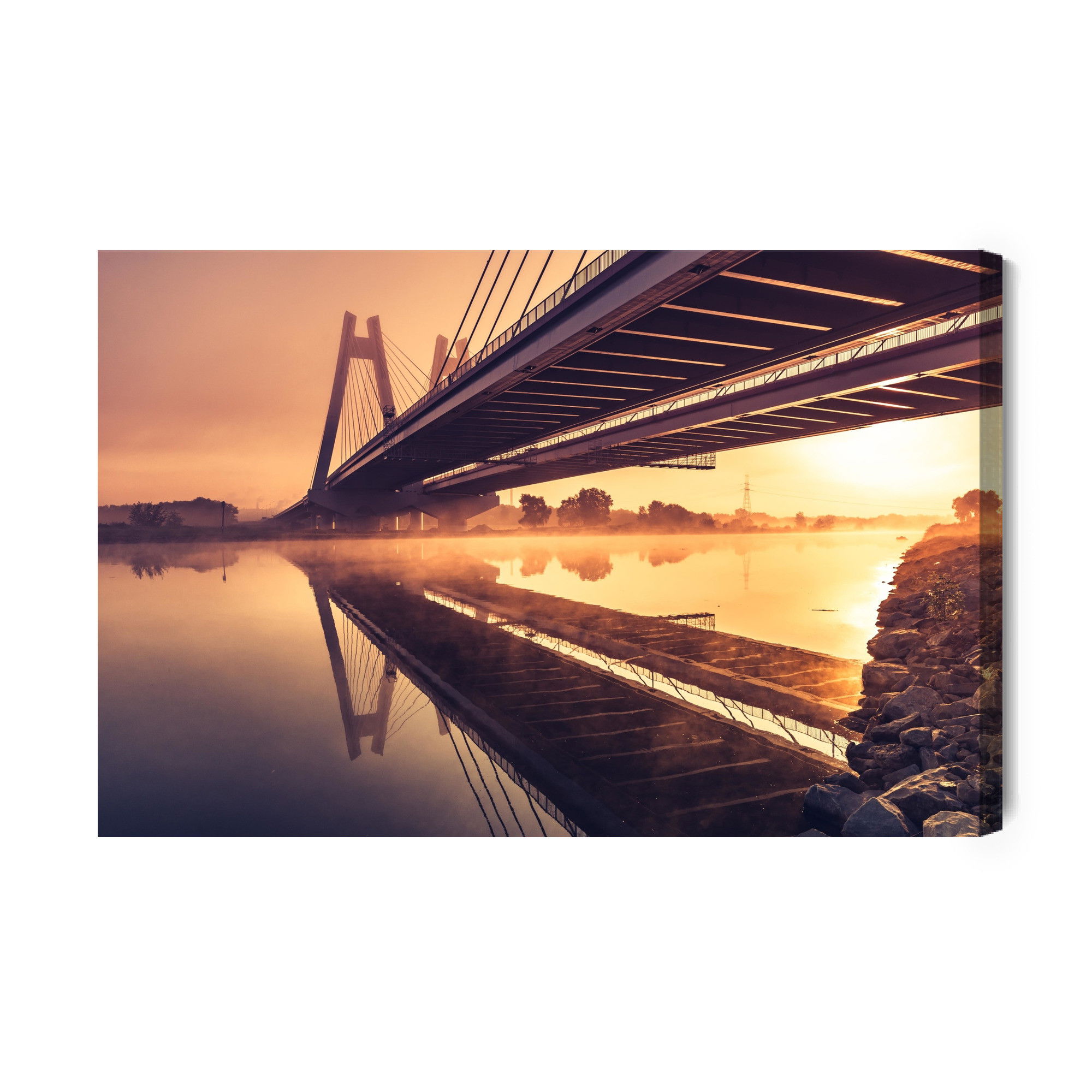 Varje tavla monteras på en massiv fururam. Format upp till 70×50 cm har en ram på 15 mm, medan format från 90×60 cm och uppåt har en ram på 20 mm. Den exakta dukspänningen gör att tavlan håller sin form över tid. Motivet Bridge to them. card. f trycks runt hela ramen vilket ger ett stilrent galleriuttryck där tavlan är lika vacker från sidan som framifrån. Kombinationen av rak dukspänning, rena linjer och korrekt tryck ger en professionell finish.