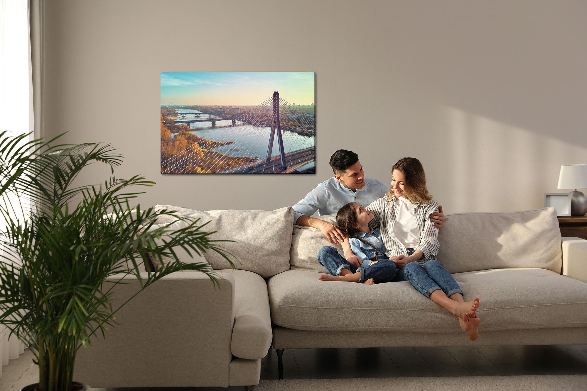 Motivet Bridges in Warsaw återges med hög färgprecision och detaljrikedom tack vare HP Latex-teknologi. Trycket sker med vattenbaserade, luktfria och GREENGUARD Gold-certifierade bläck som ger en upplösning på upp till 300 DPI. Färgerna är UV-beständiga och behåller sin styrka även i ljusa rum, vilket gör tavlan lämplig för både hem- och offentliga miljöer.