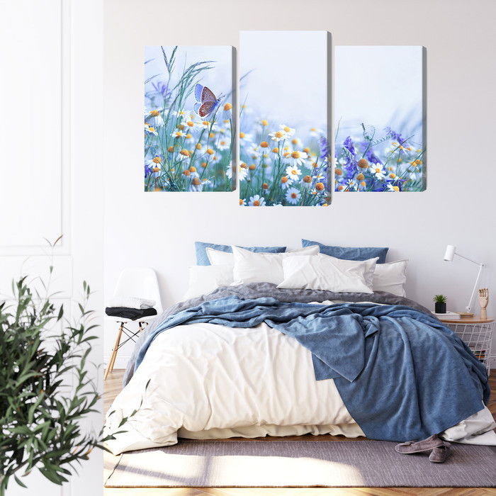Varje tavla monteras på en massiv fururam. Format upp till 70×50 cm har en ram på 15 mm, medan format från 90×60 cm och uppåt har en ram på 20 mm. Den exakta dukspänningen gör att tavlan håller sin form över tid. Motivet Butterfly and wildflowers trycks runt hela ramen vilket ger ett stilrent galleriuttryck där tavlan är lika vacker från sidan som framifrån. Kombinationen av rak dukspänning, rena linjer och korrekt tryck ger en professionell finish.