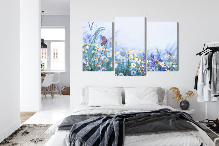 SilentDirects ljuddämpande tavla Butterfly and wildflowers kombinerar ett högupplöst motiv med avancerad akustikteknik. Varje tavla monteras i Sverige och bygger på en stabil canvastavla med fururam, där insidan av ramen fylls med en ljudabsorberande kärna av återvunnen polyester. Konstruktionen gör tavlan till ett både estetiskt och funktionellt inslag i rummet.