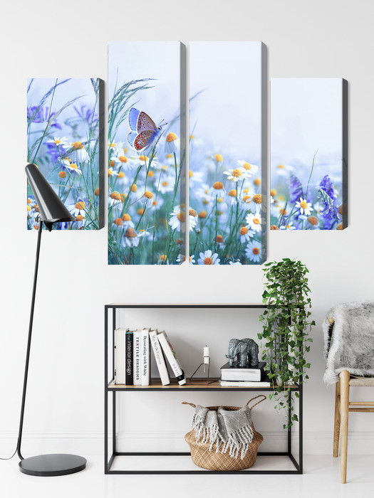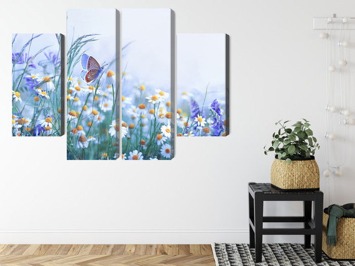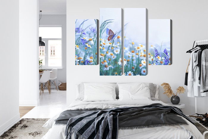 SilentDirects ljuddämpande tavla Butterfly and wildflowers kombinerar ett högupplöst motiv med avancerad akustikteknik. Varje tavla monteras i Sverige och bygger på en stabil canvastavla med fururam, där insidan av ramen fylls med en ljudabsorberande kärna av återvunnen polyester. Konstruktionen gör tavlan till ett både estetiskt och funktionellt inslag i rummet.